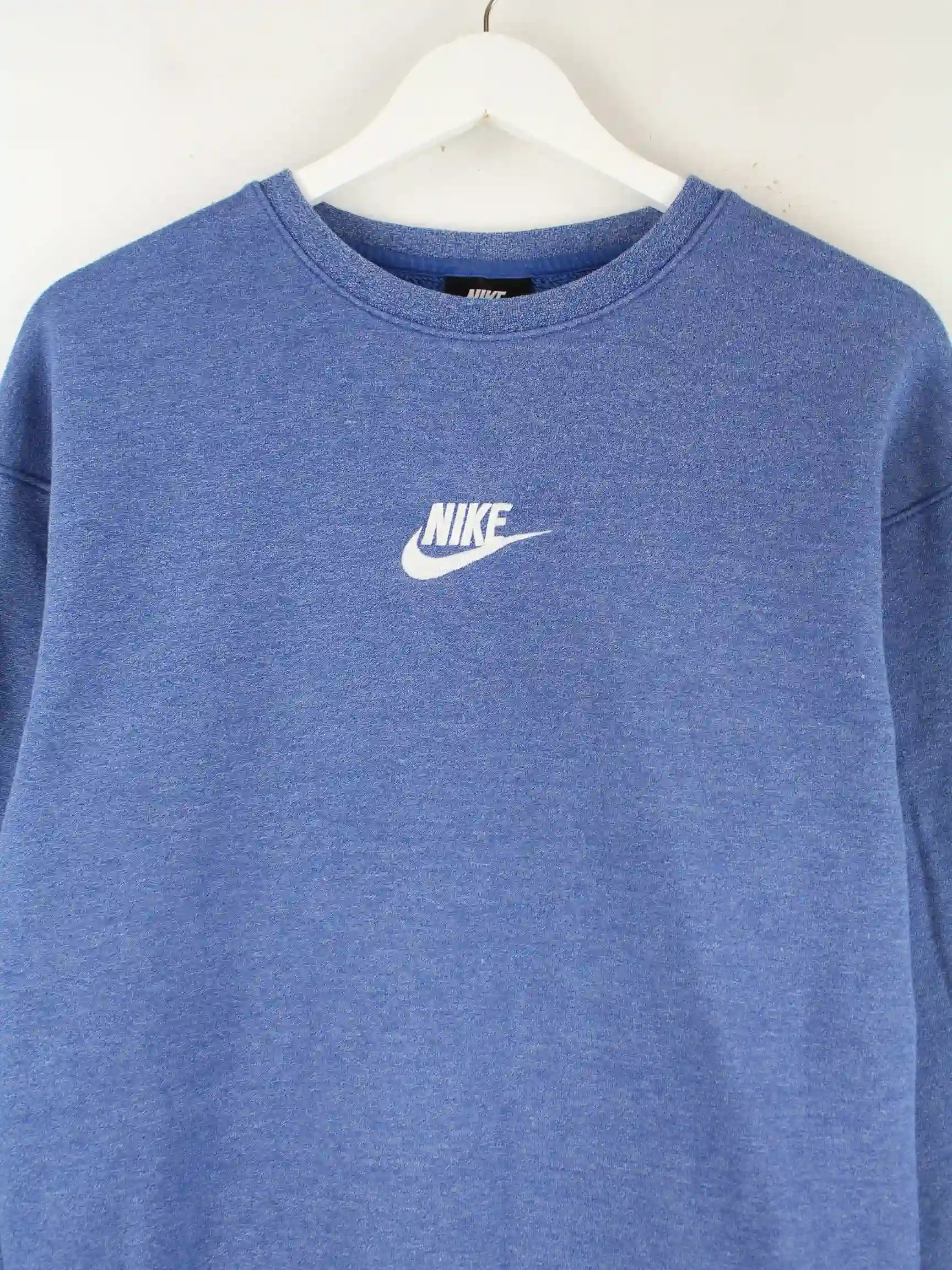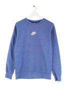 Blauer Sweater mit gesticktem Logo der Brand Nike in Größe XS. Er ist aus einer Baumwollmischung angefertigt und in sehr gutem Zustand bei uns vorrätig.