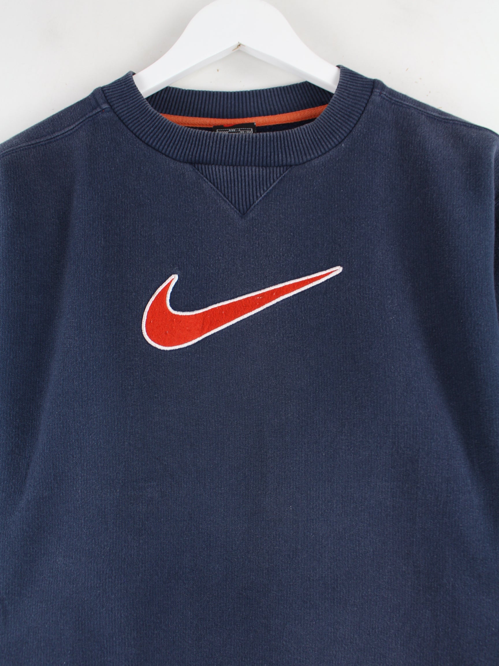 Nike brand sweater with embroidered logo in size XS from the 90's. It is made from a cotton blend and is available in blue.
