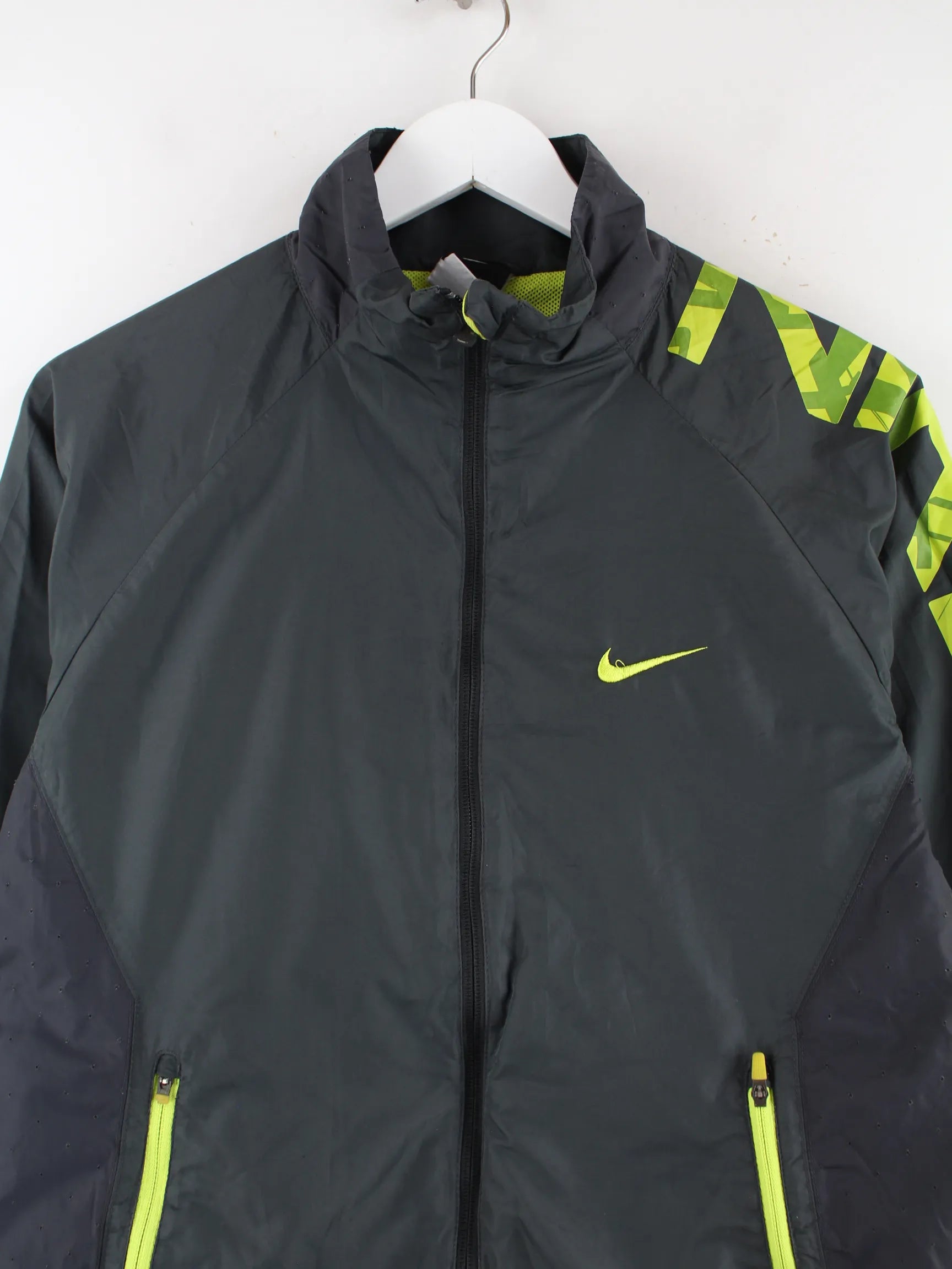 Graue Trainingsjacke von Nike in Größe XL. Sie ist aus Synthetik angefertigt und in sehr gutem Zustand bei uns zu bekommen. Mit chiquem Swoosh Print.