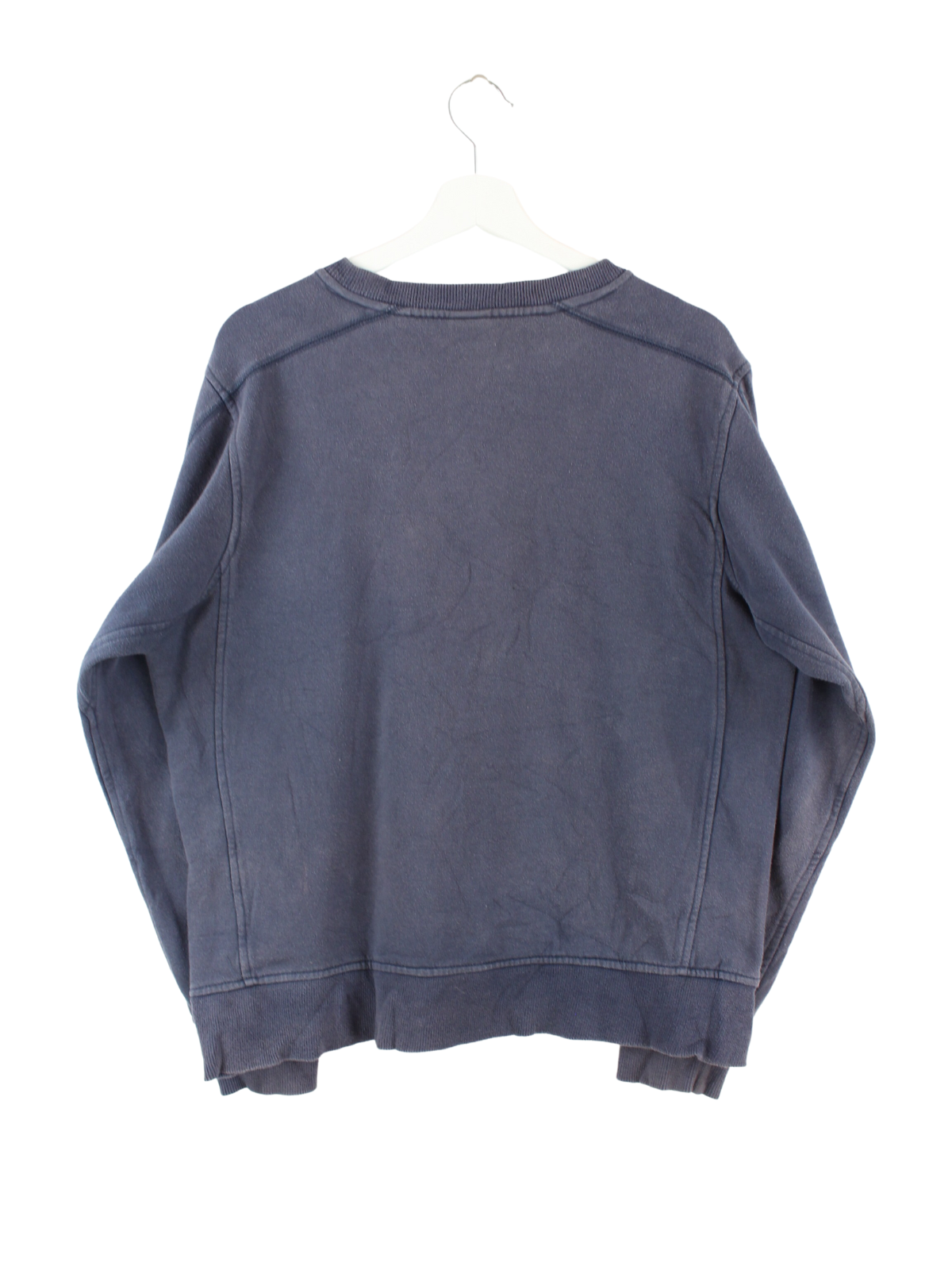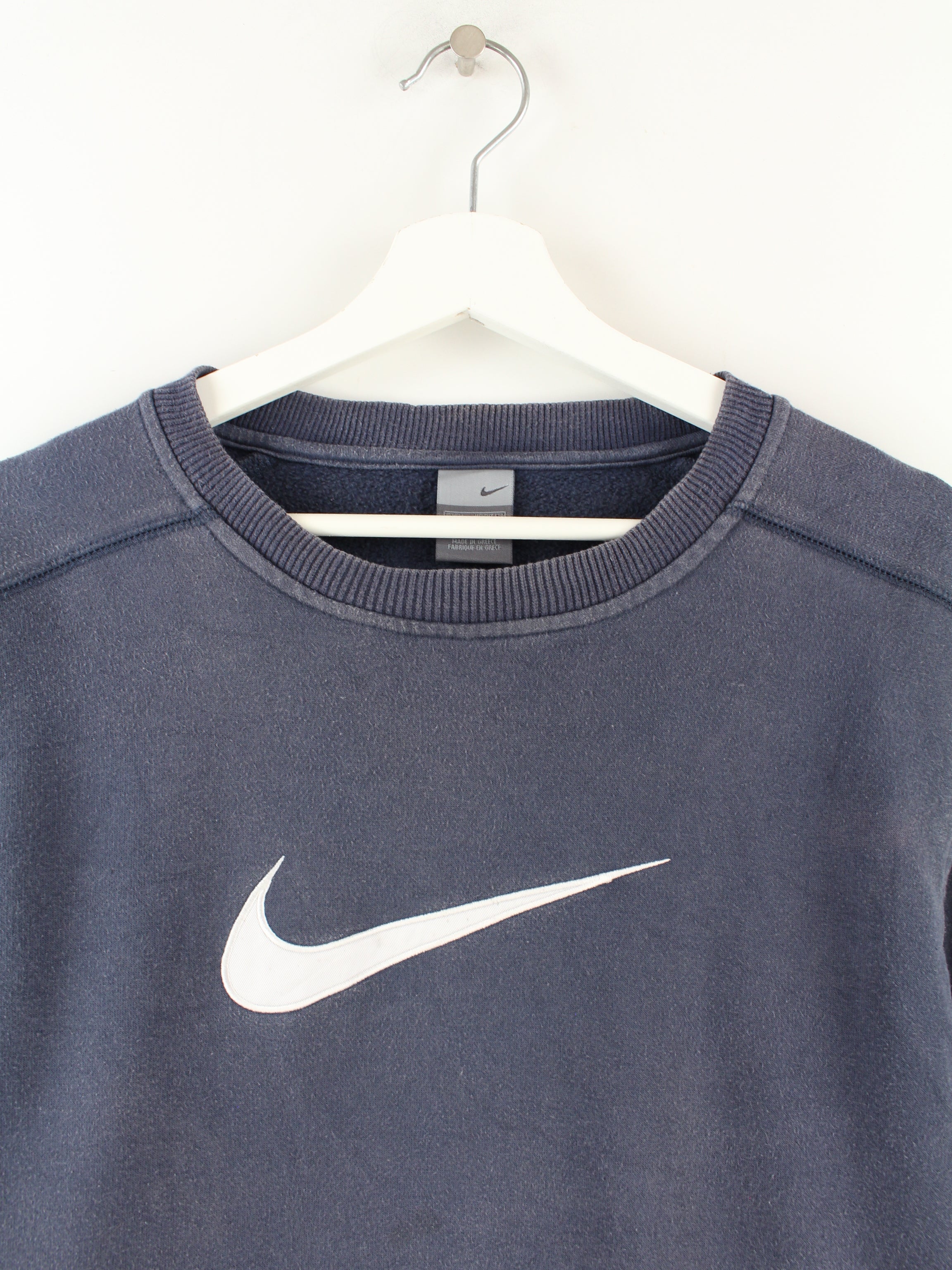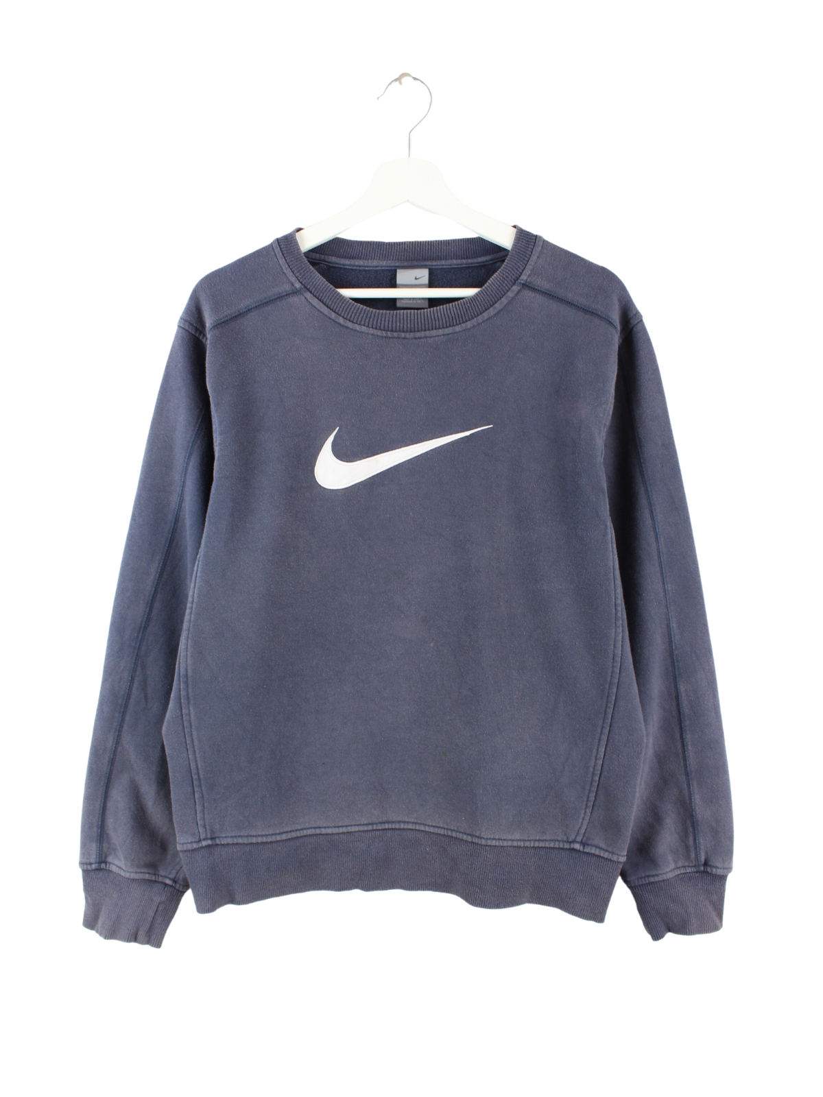 Blue vintage Nike sweater with large embroidered Nike Swoosh logo.
