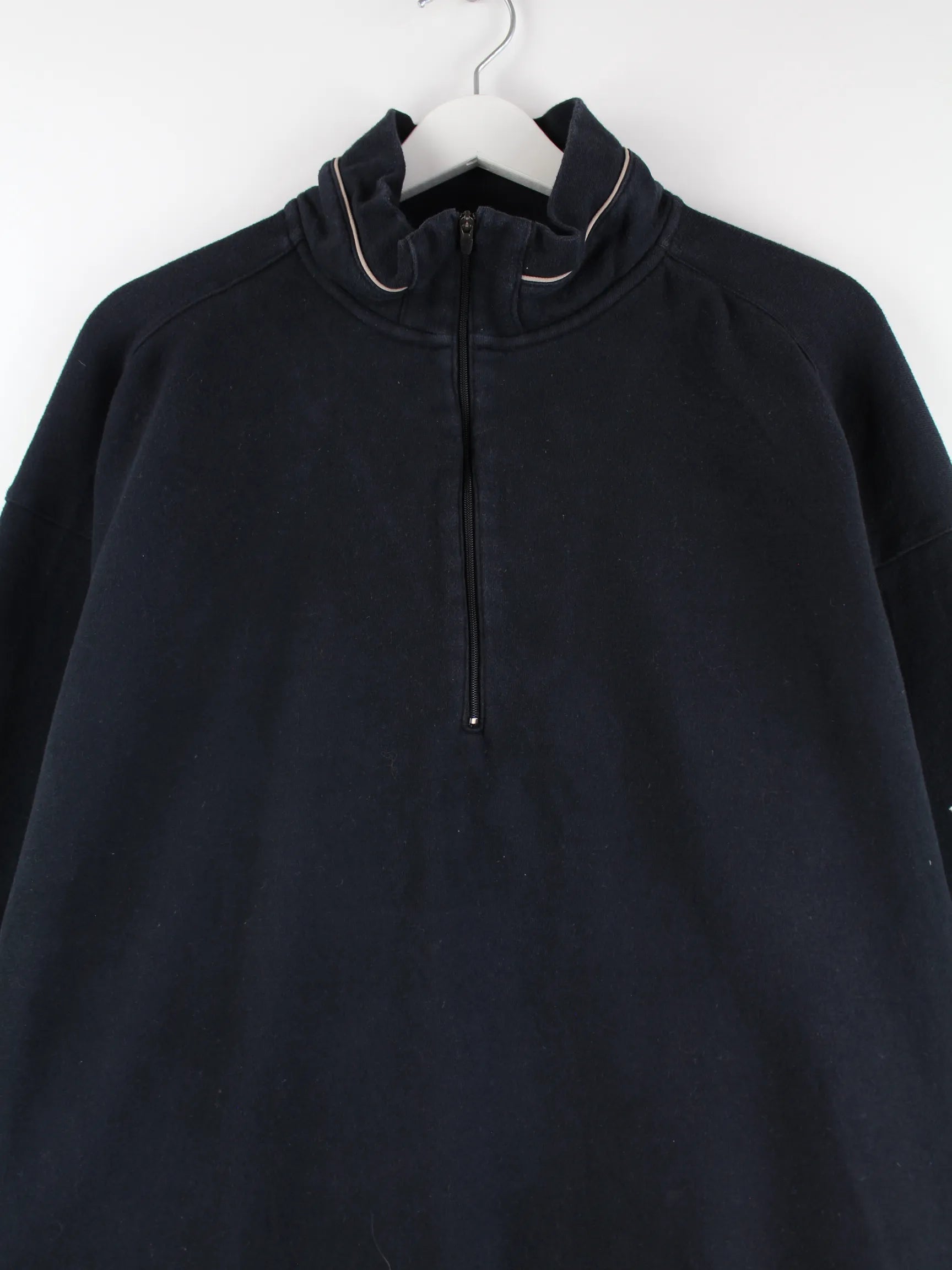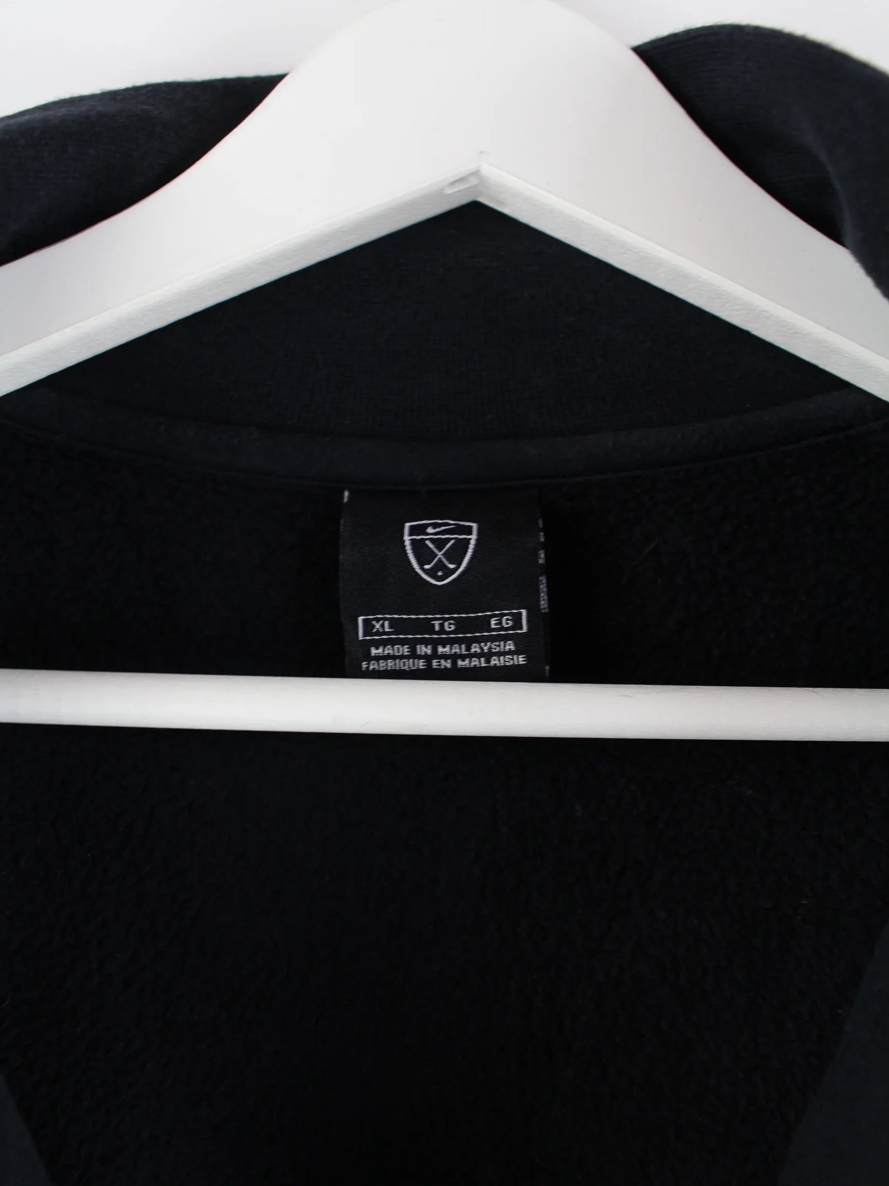 Schwarzer Sweater mit kurzem Reißverschluß vom Brand Nike in Größe XL. Er ist aus einer Baumwollmischung gefertigt und in sehr gutem Zustand bei uns zu bekommen.