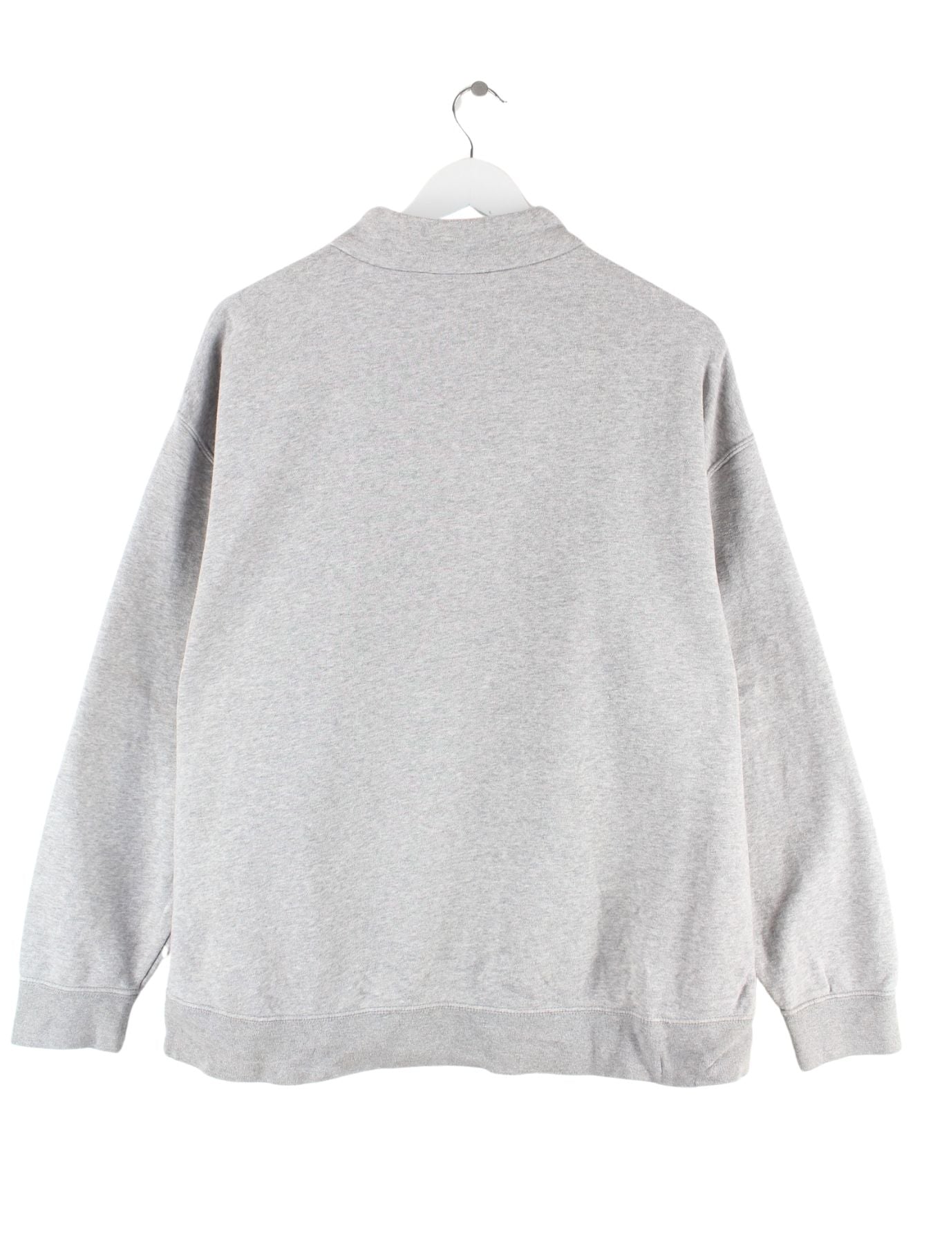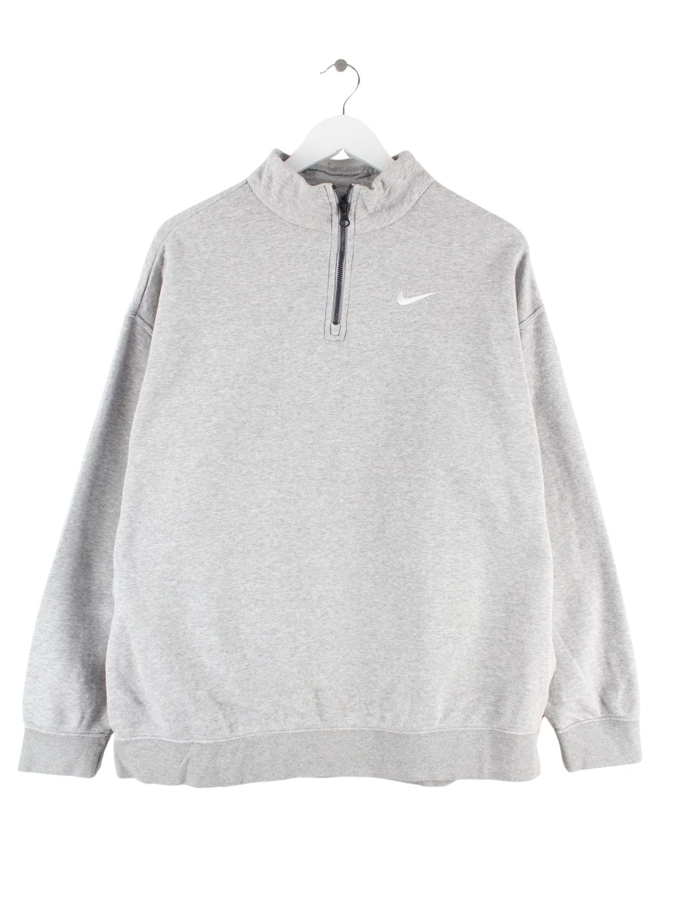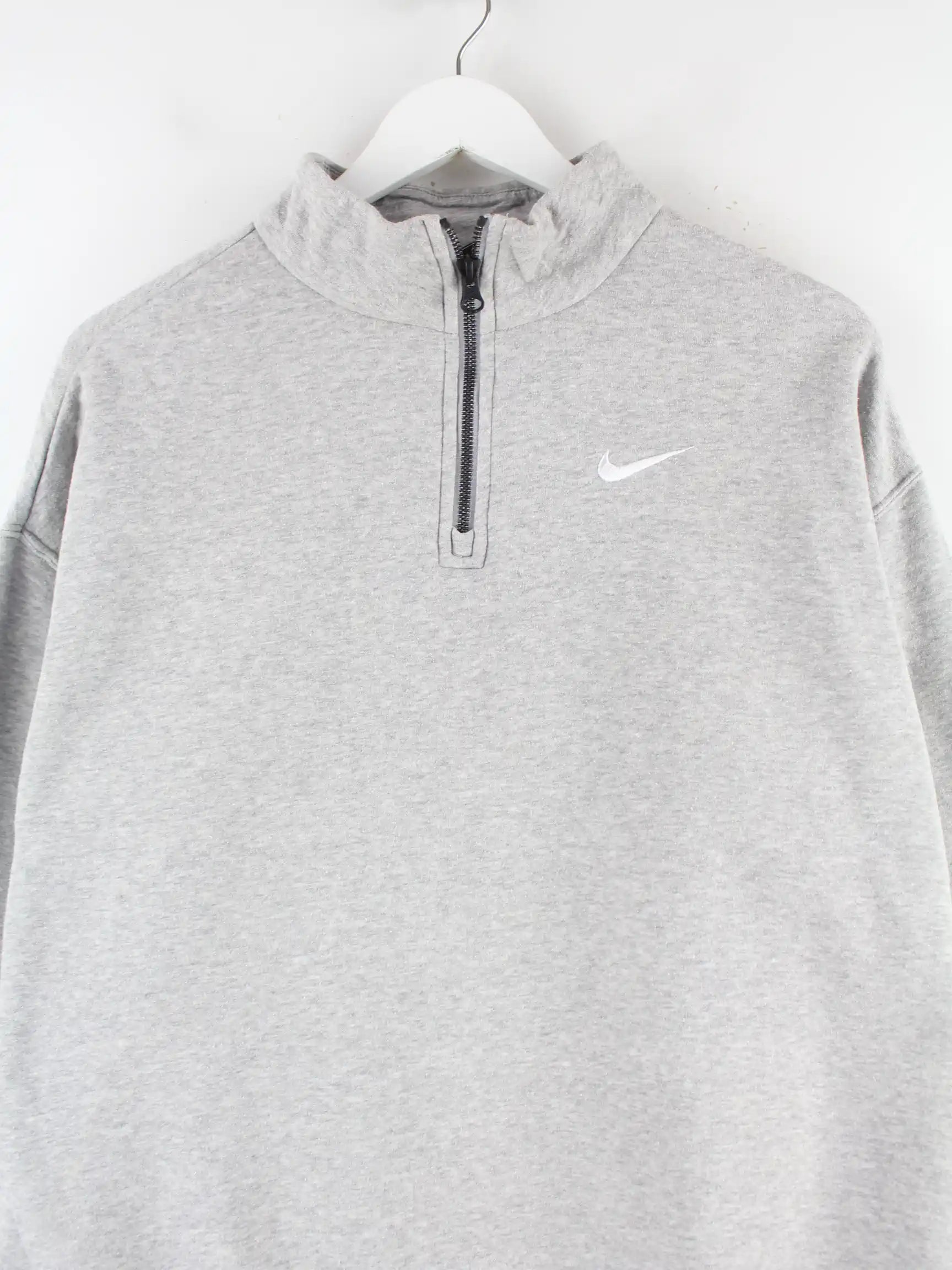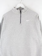 Grauer Sweater mit kurzem Reißverschluß vom Brand Nike in Größe L. Er ist aus einer Baumwollmischung gemacht und in sehr gutem Zustand im Angebot.