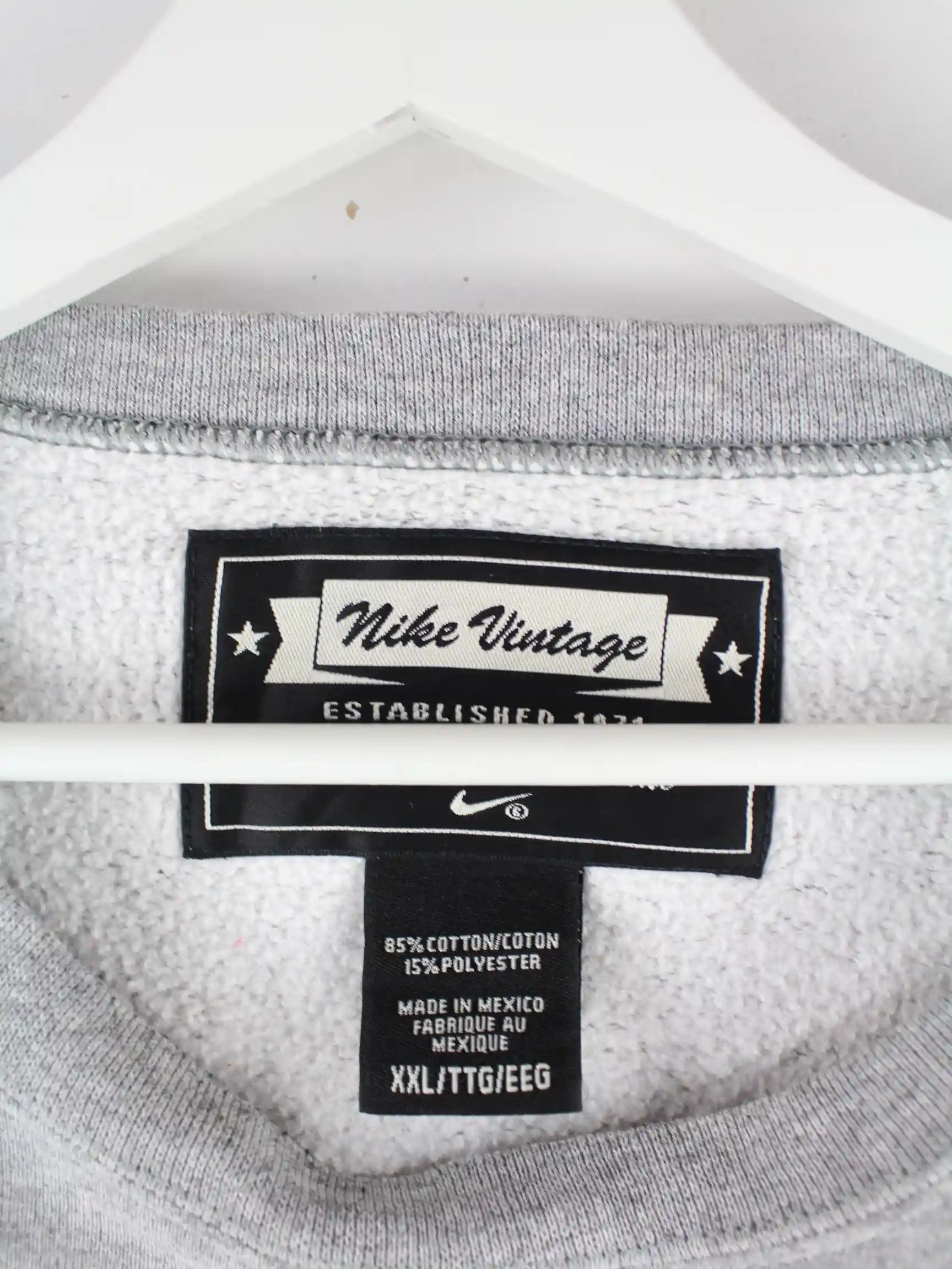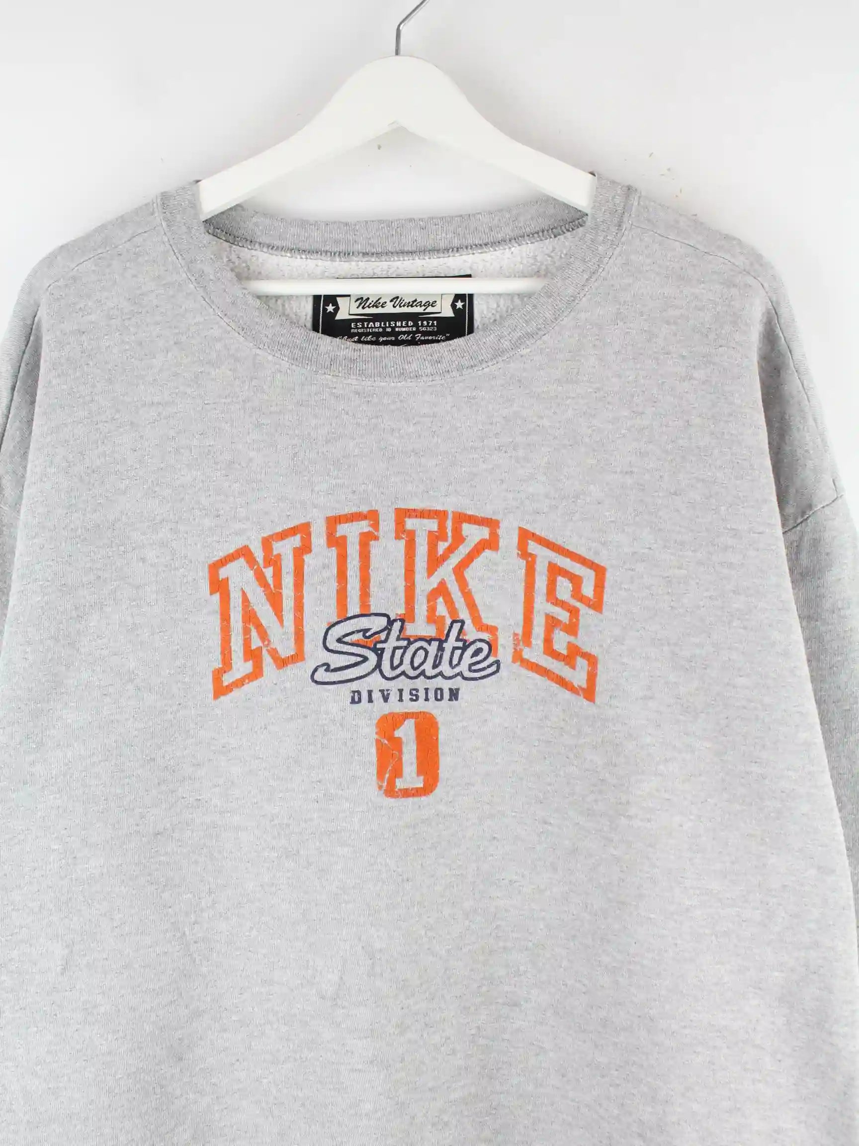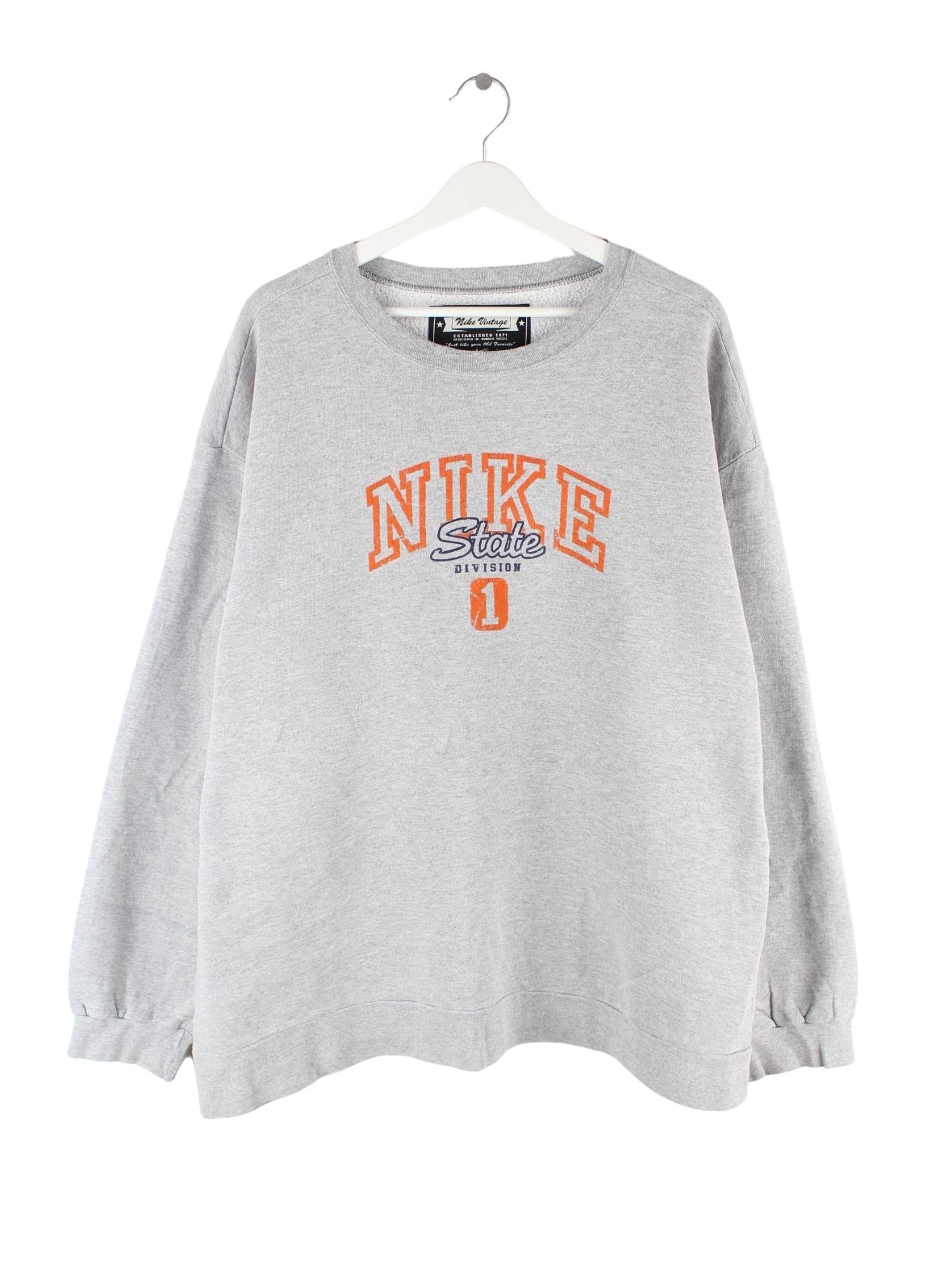 Grauer Sweater der Brand Nike in Größe XXL. Er ist aus einer Baumwollmischung gefertigt und in sehr gutem Zustand bei uns vorrätig. Mit schickem State Print.