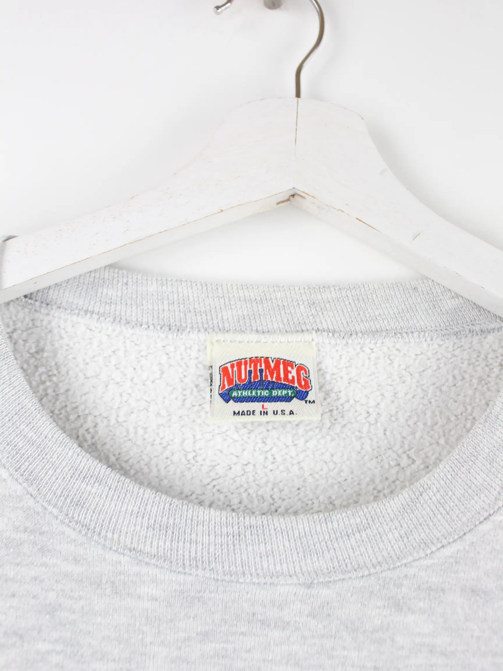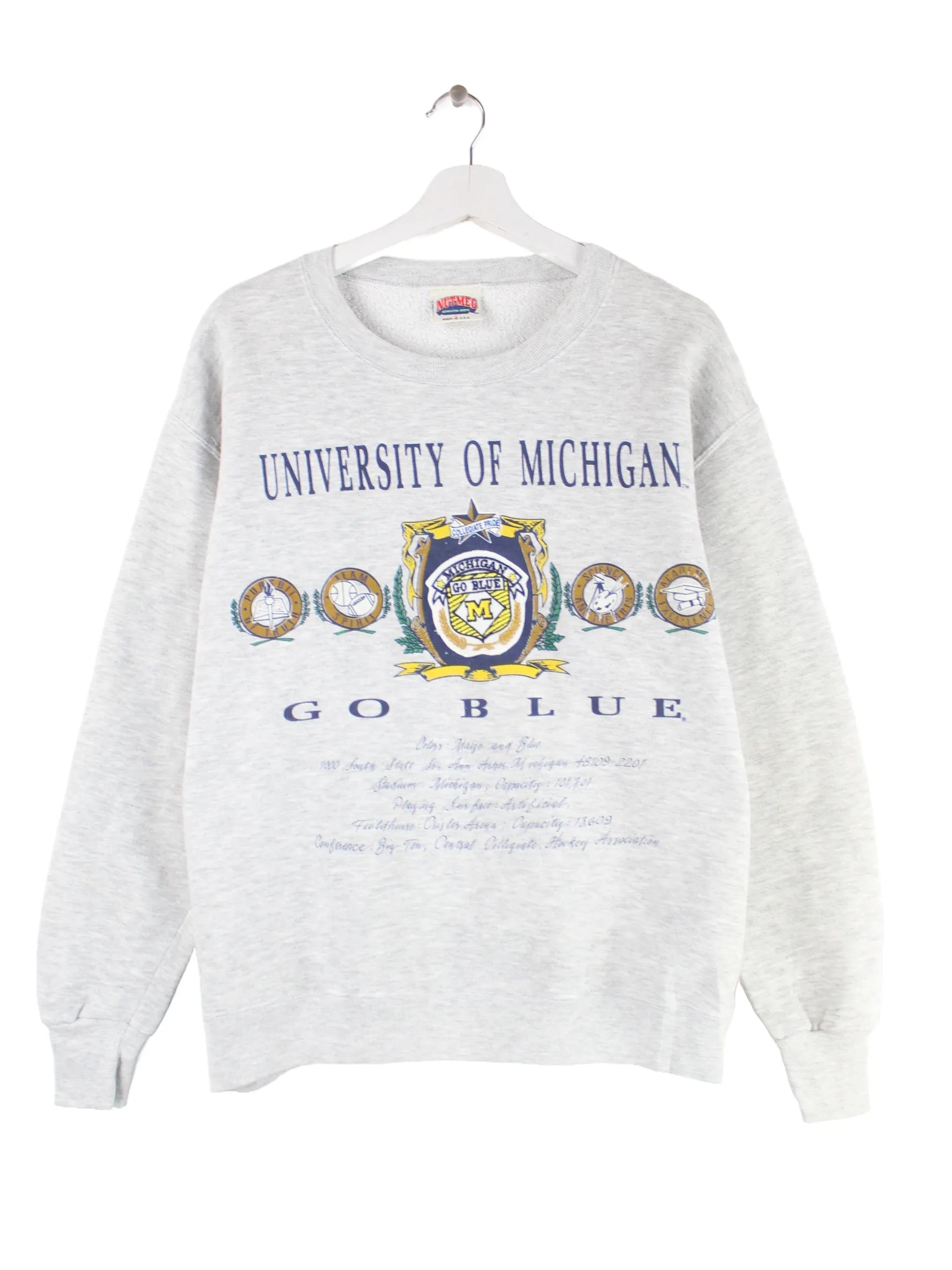 Grauer Sweater der Brand Nutmeg aus den 90'ern in Größe L. Er ist aus einer Baumwollmischung gefertigt. Den Zustand würden wir als 'In Ordnung' bezeichnen (vergl. Bilder).Mit tollem Michigan Print.