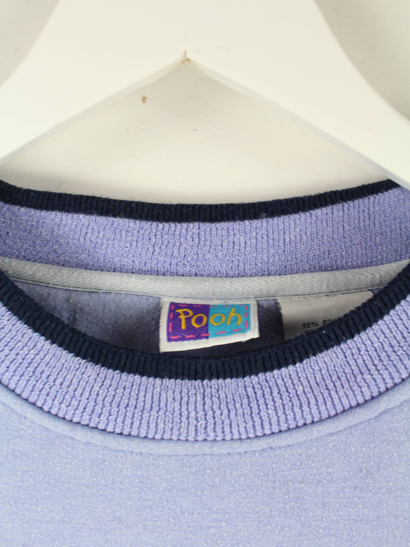 Sweater des Labels Pooh mit gestickten Motiven in Größe L aus den 90'ern. Er ist aus einer Baumwollmischung gemacht und in Blau auf Lager.