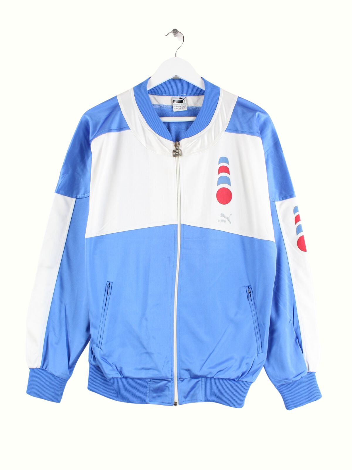 Blue training jacket from the Puma label from the 80s in size L. It is made of synthetic material and is in very good condition.