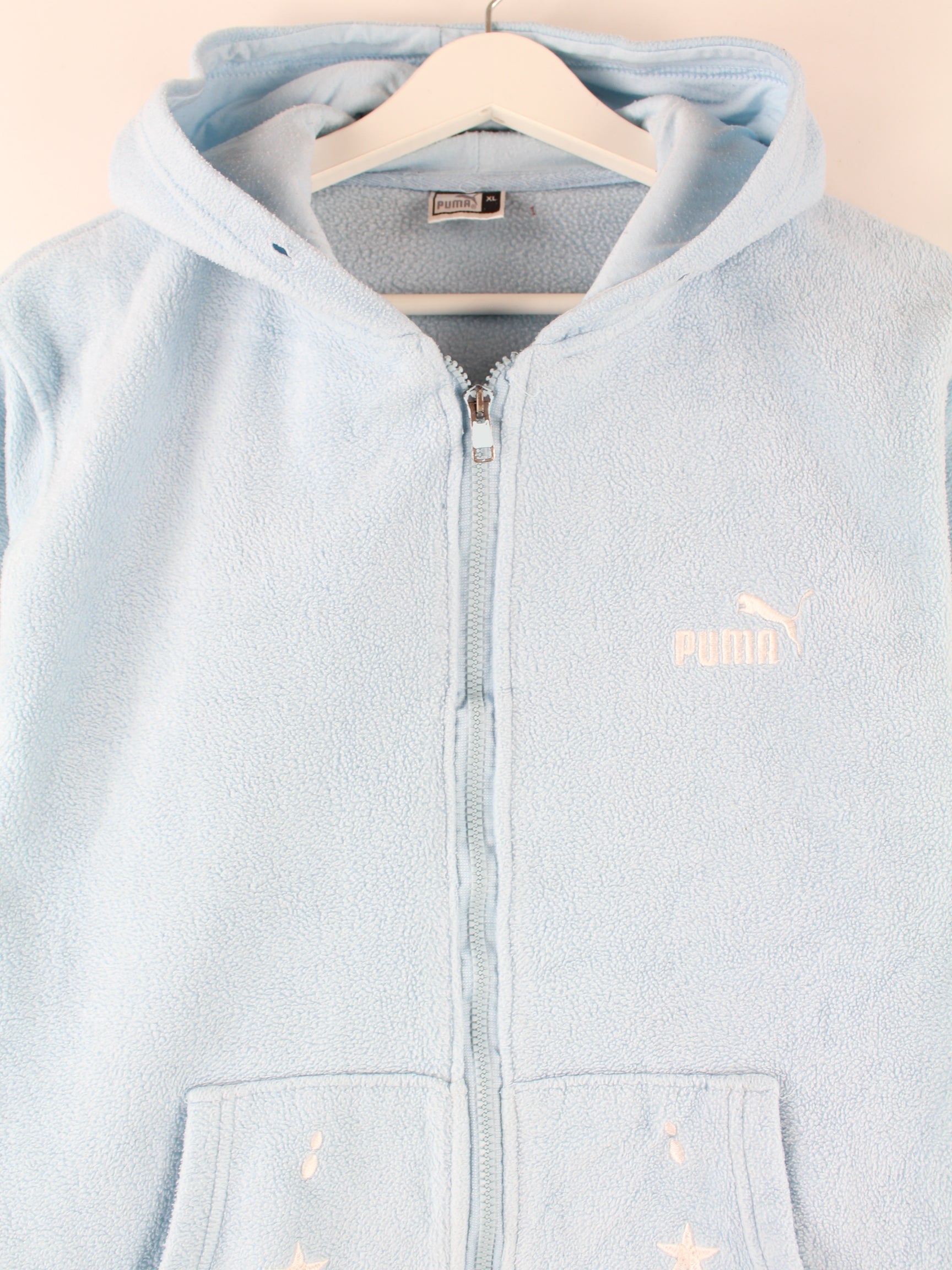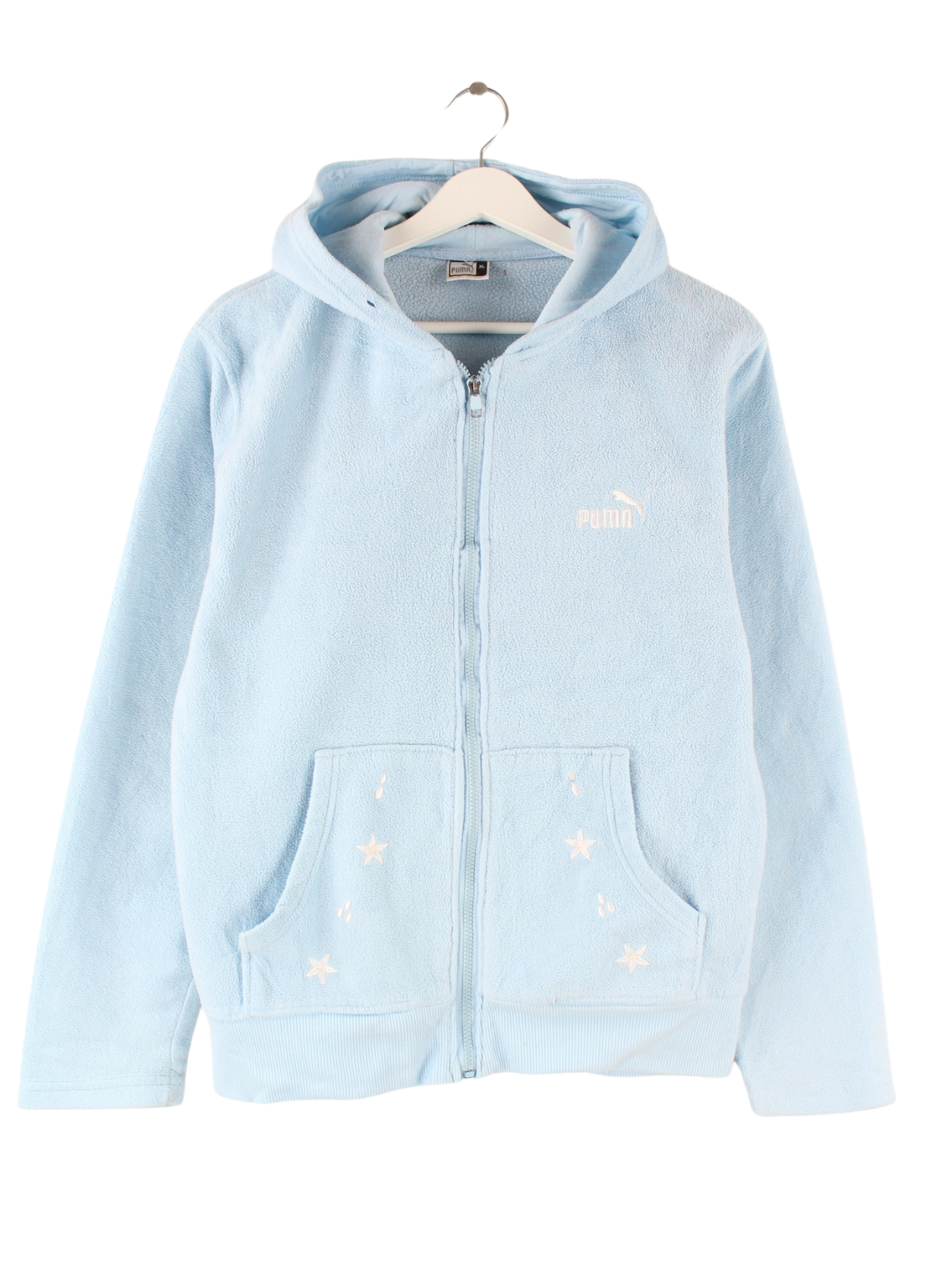 Hoodie von Puma mit Reißverschluß in Größe M. Er ist aus kuscheligem Fleece gemacht und in Blau auf Lager.