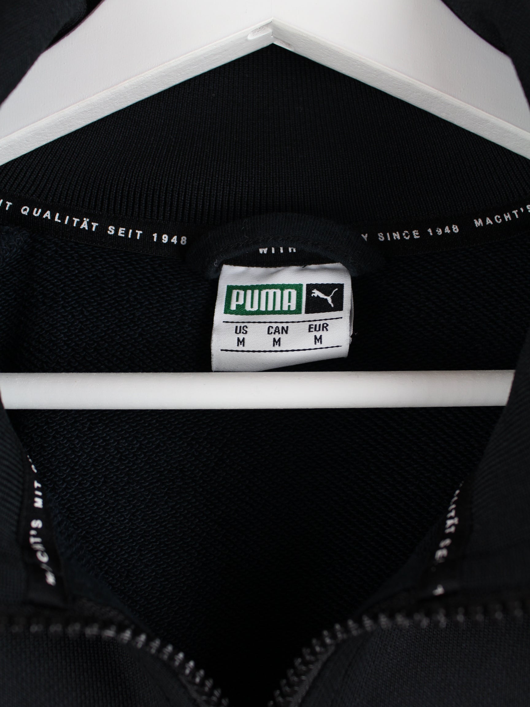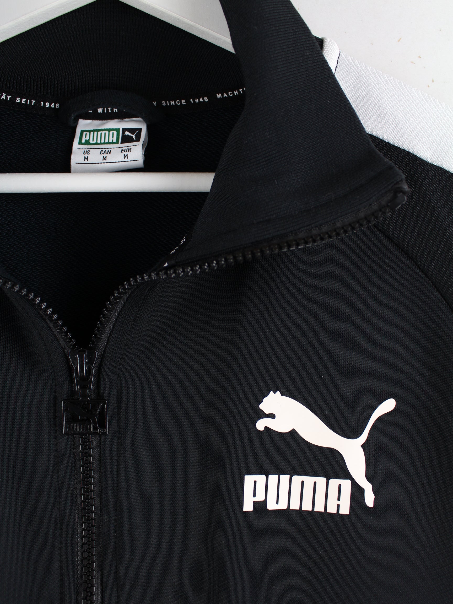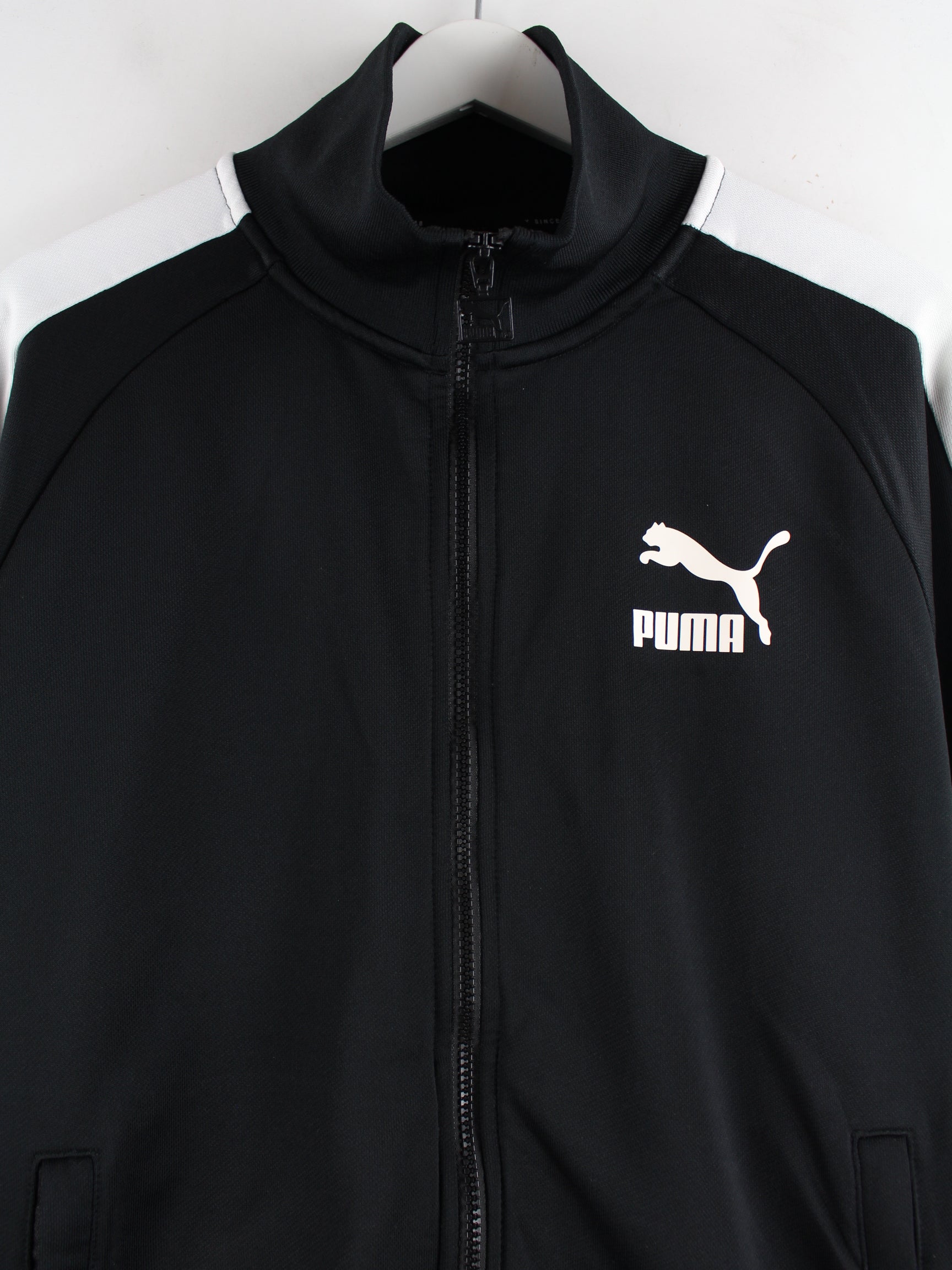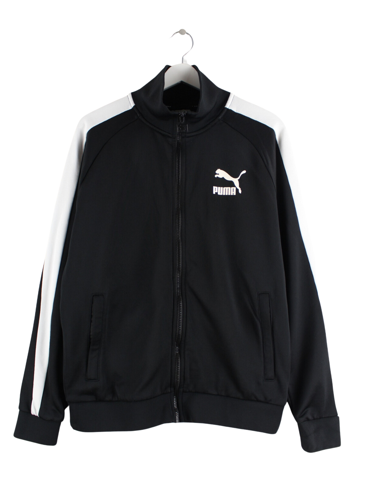 Schwarze Trainingsjacke der Marke Puma in Größe M. Sie ist aus Synthetik und in sehr gutem Zustand bei uns vorrätig. Mit chiquem Print.