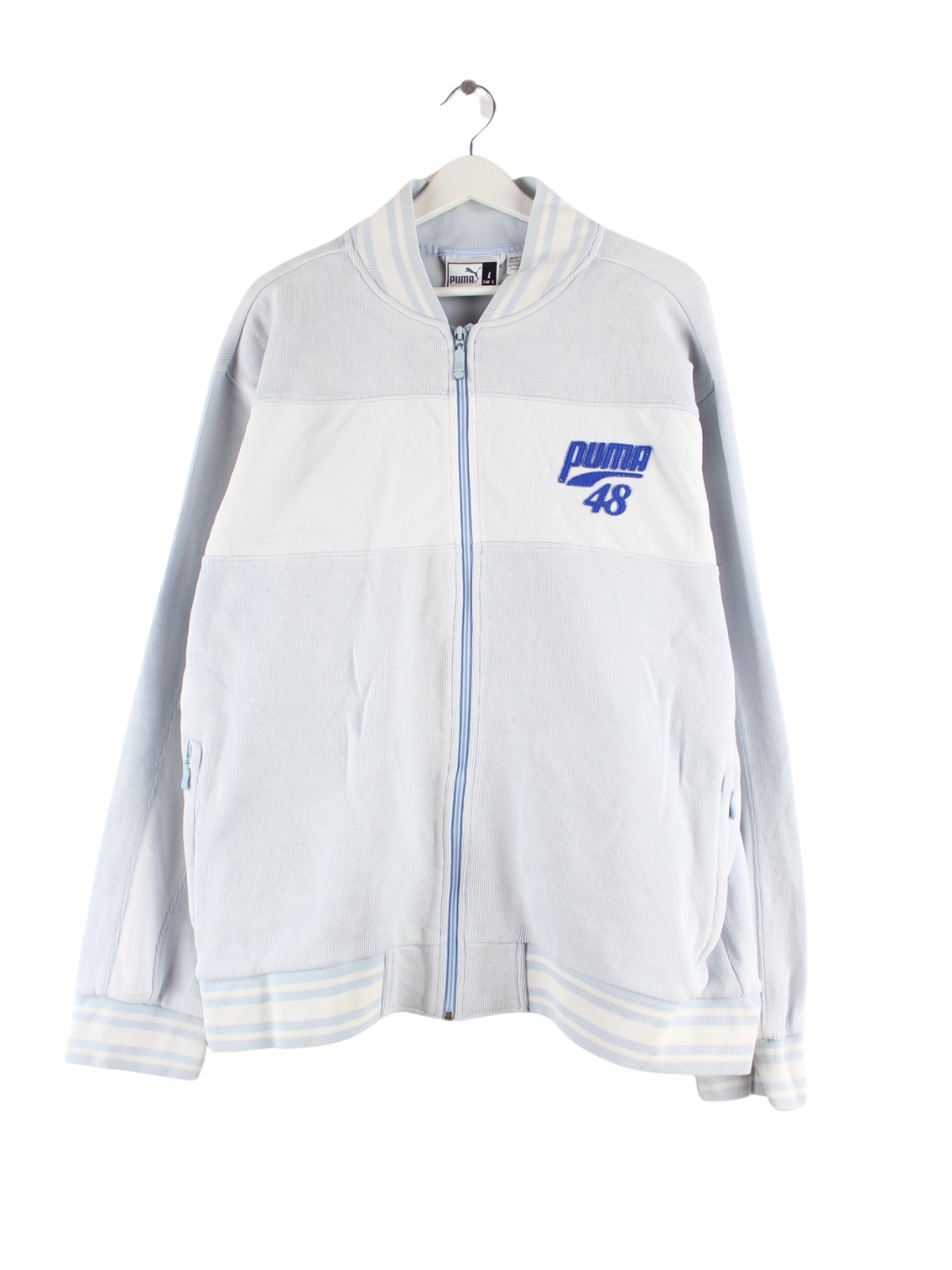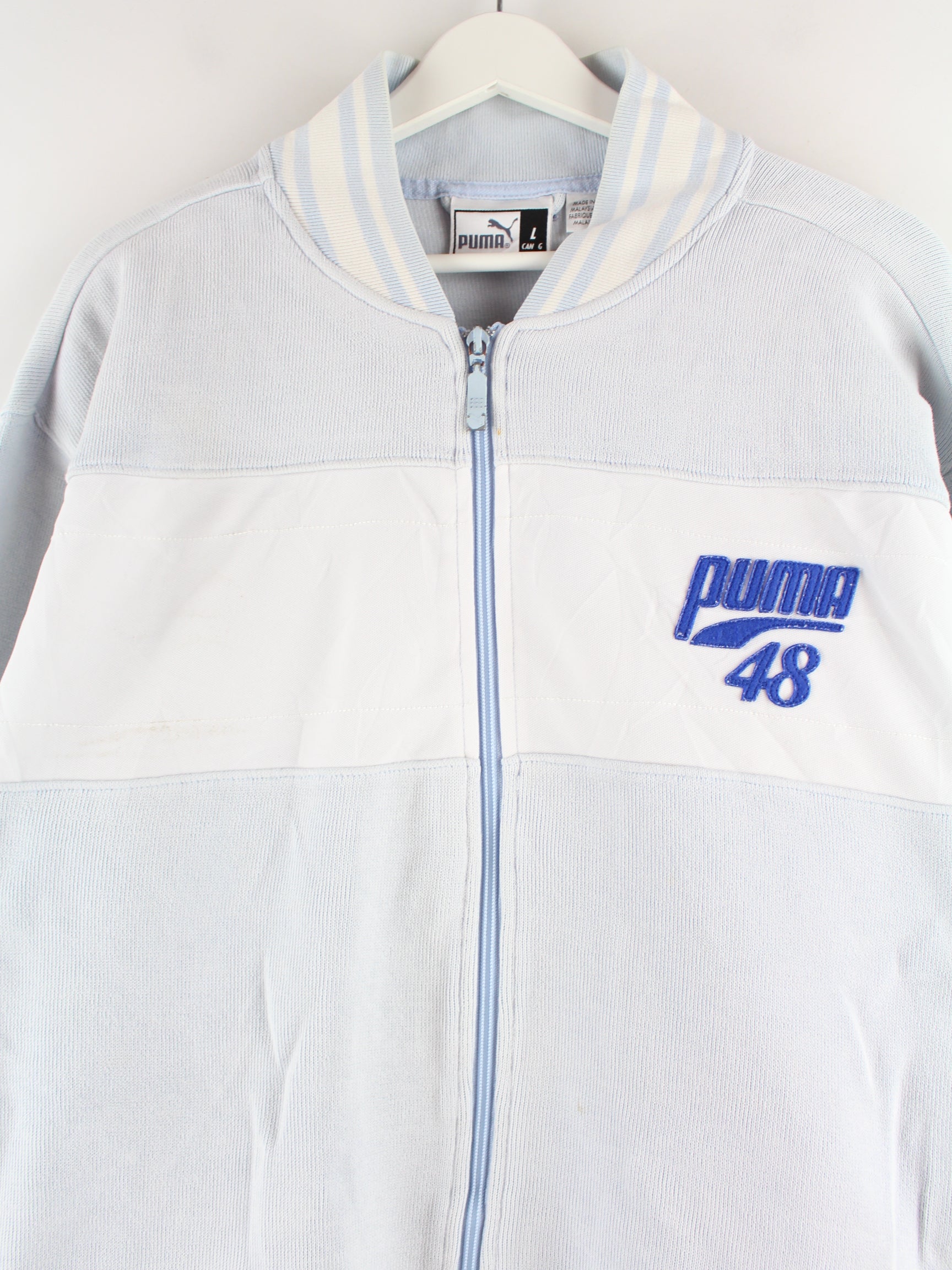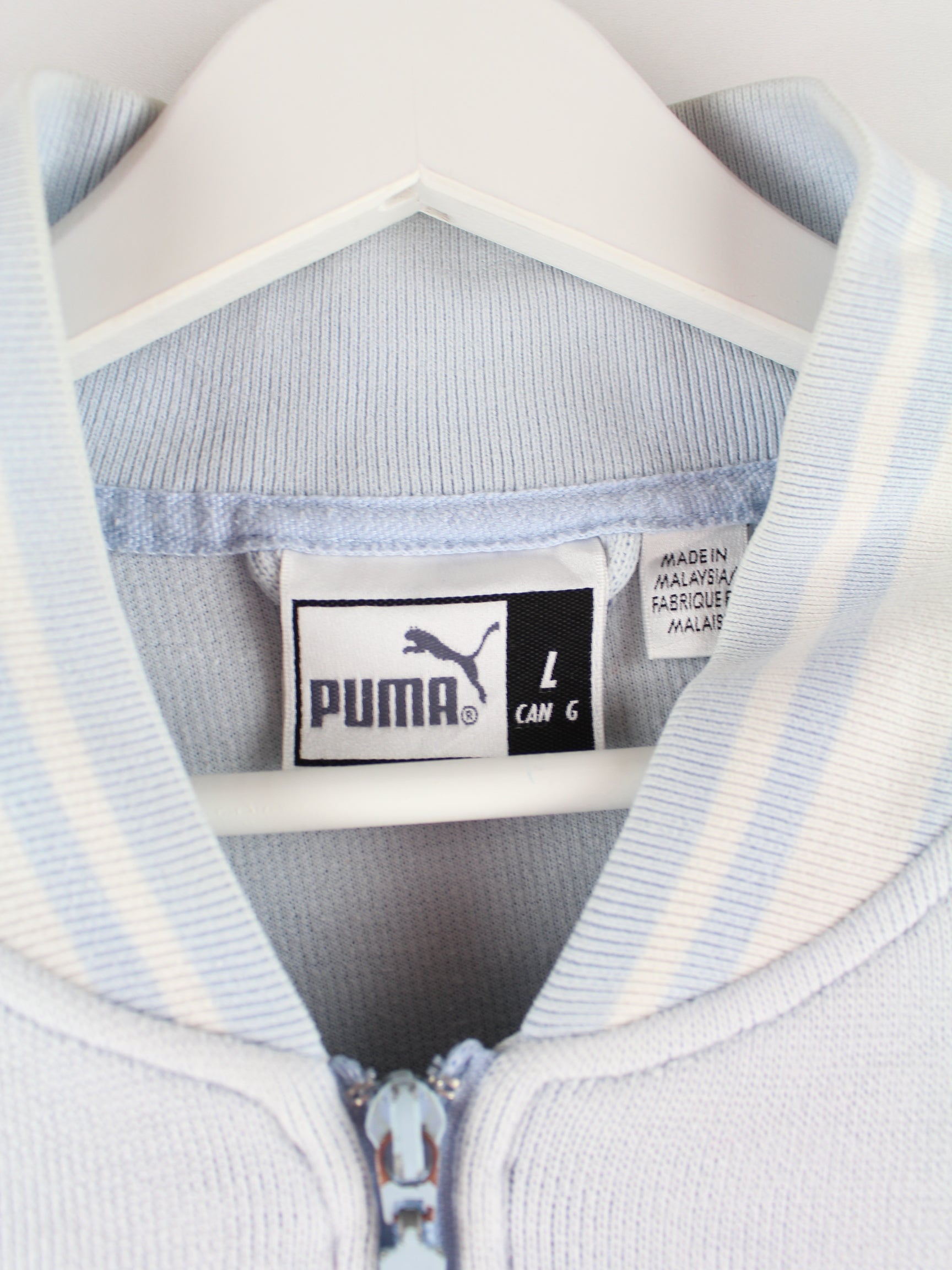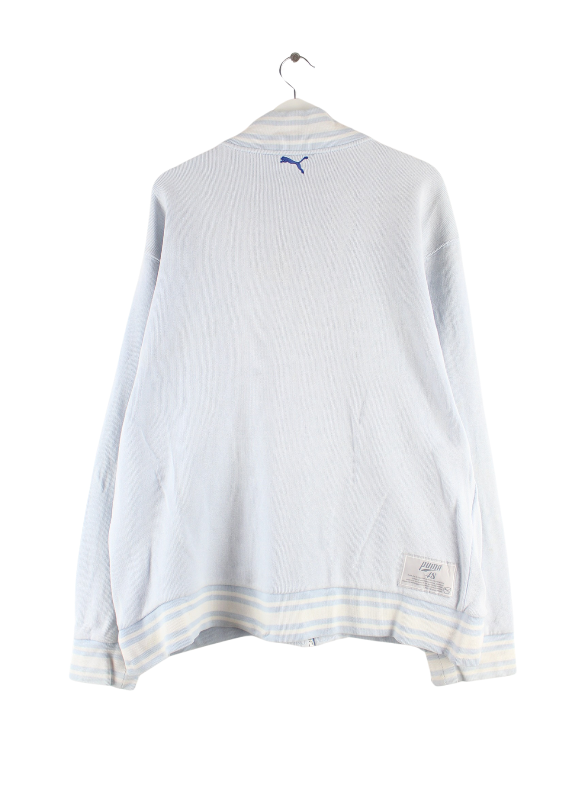 Sweat jacket from the Puma brand with embroidery in size L from the early 2000s. It is made from a cotton blend and is available in blue.