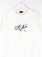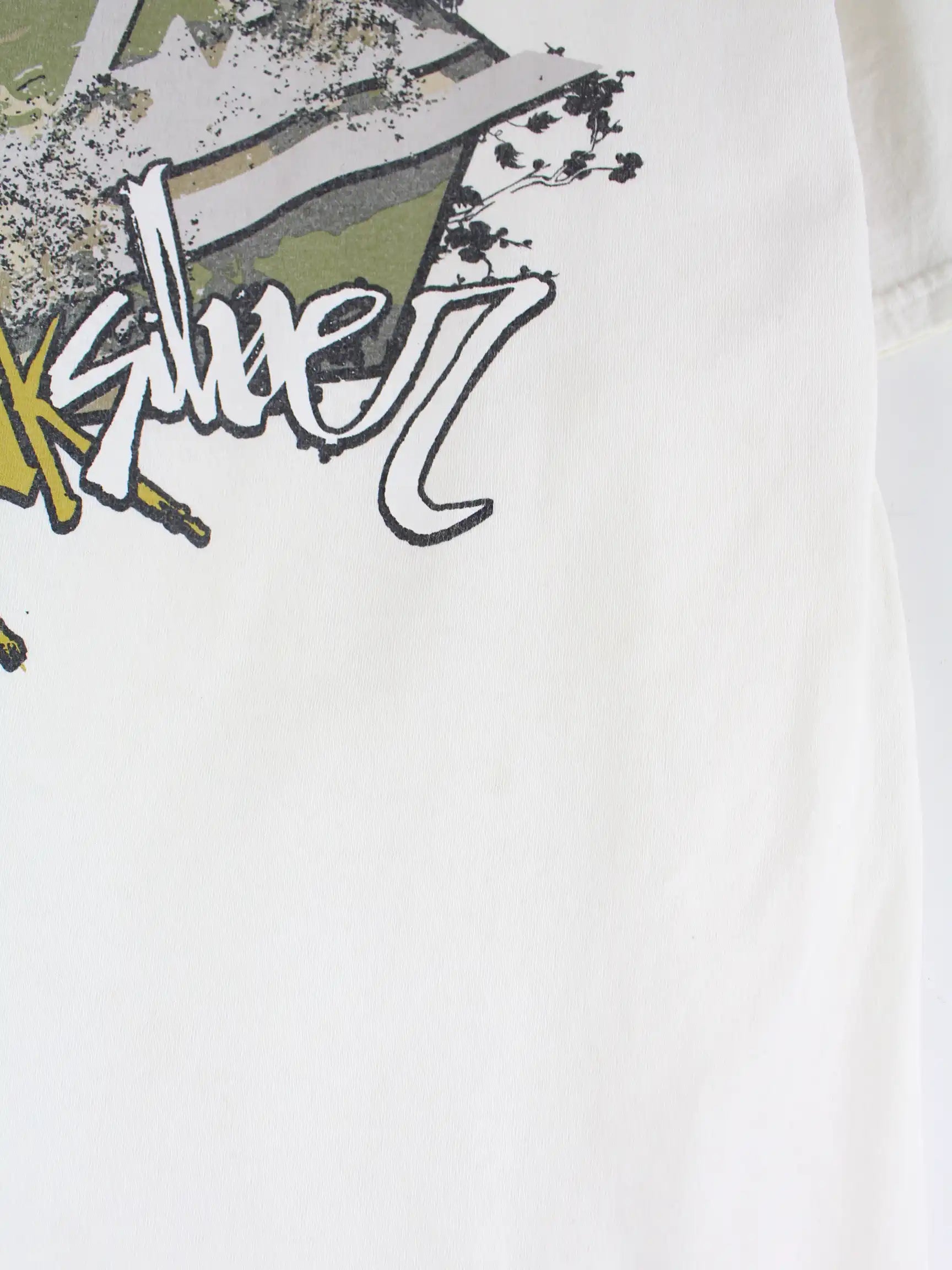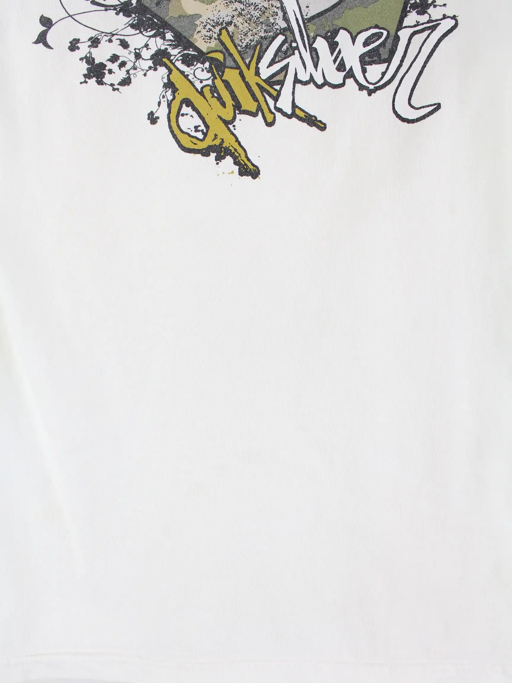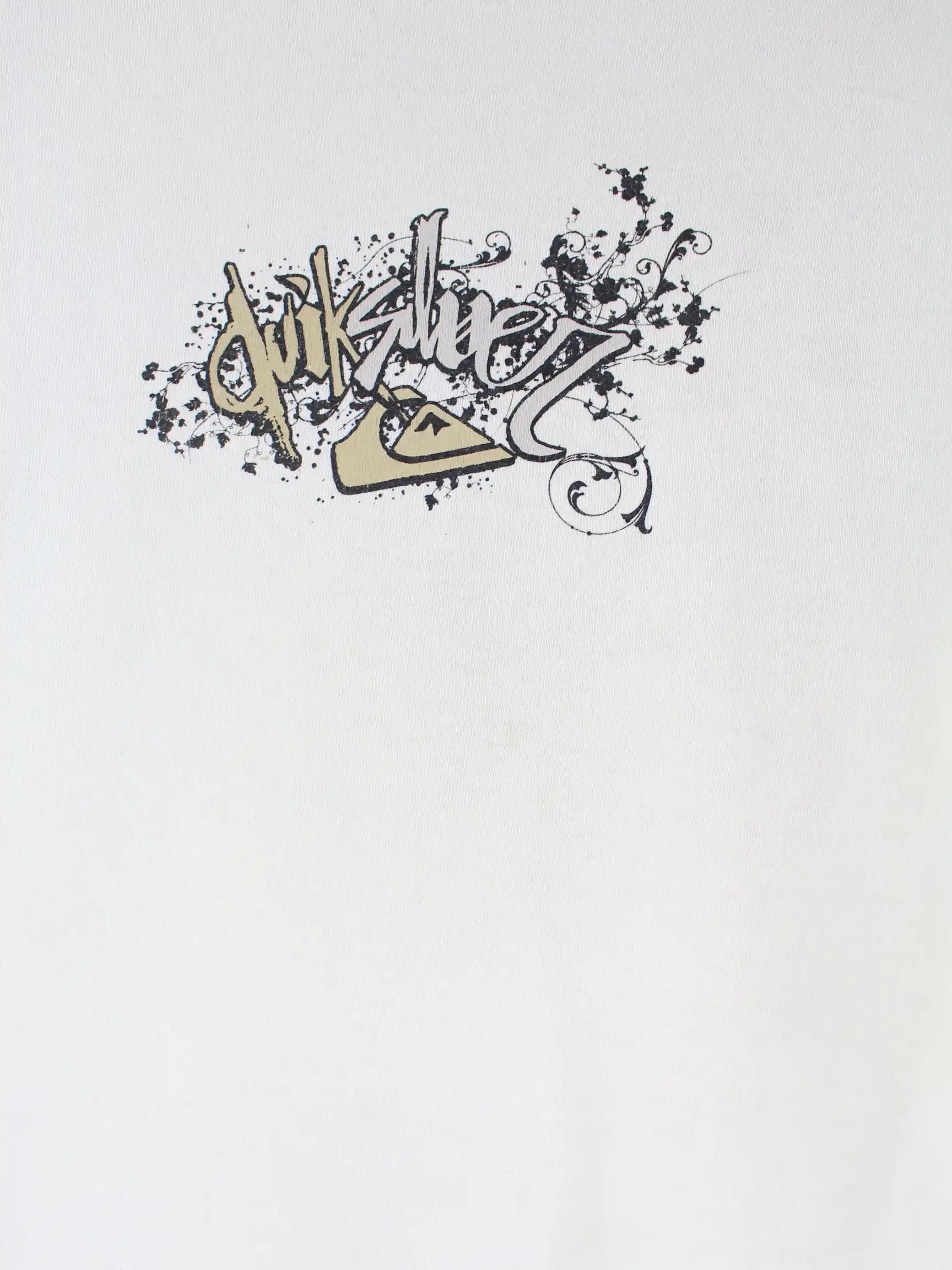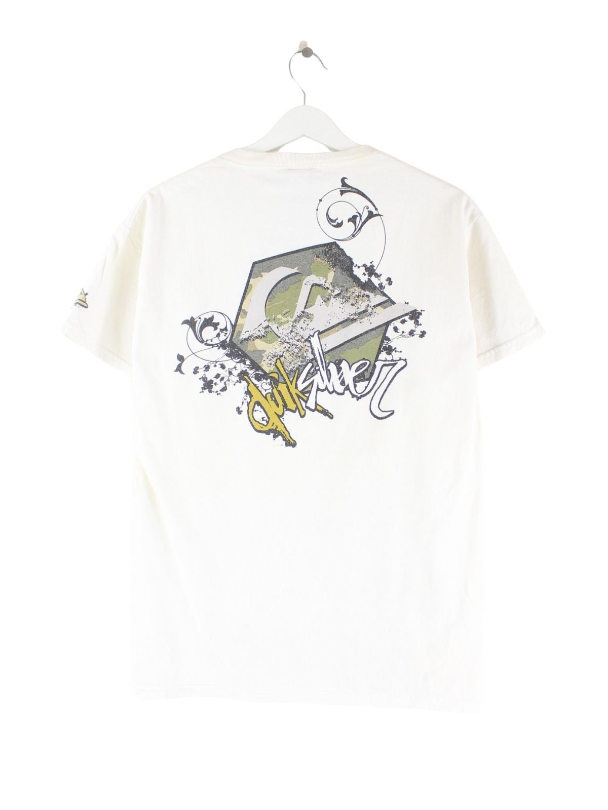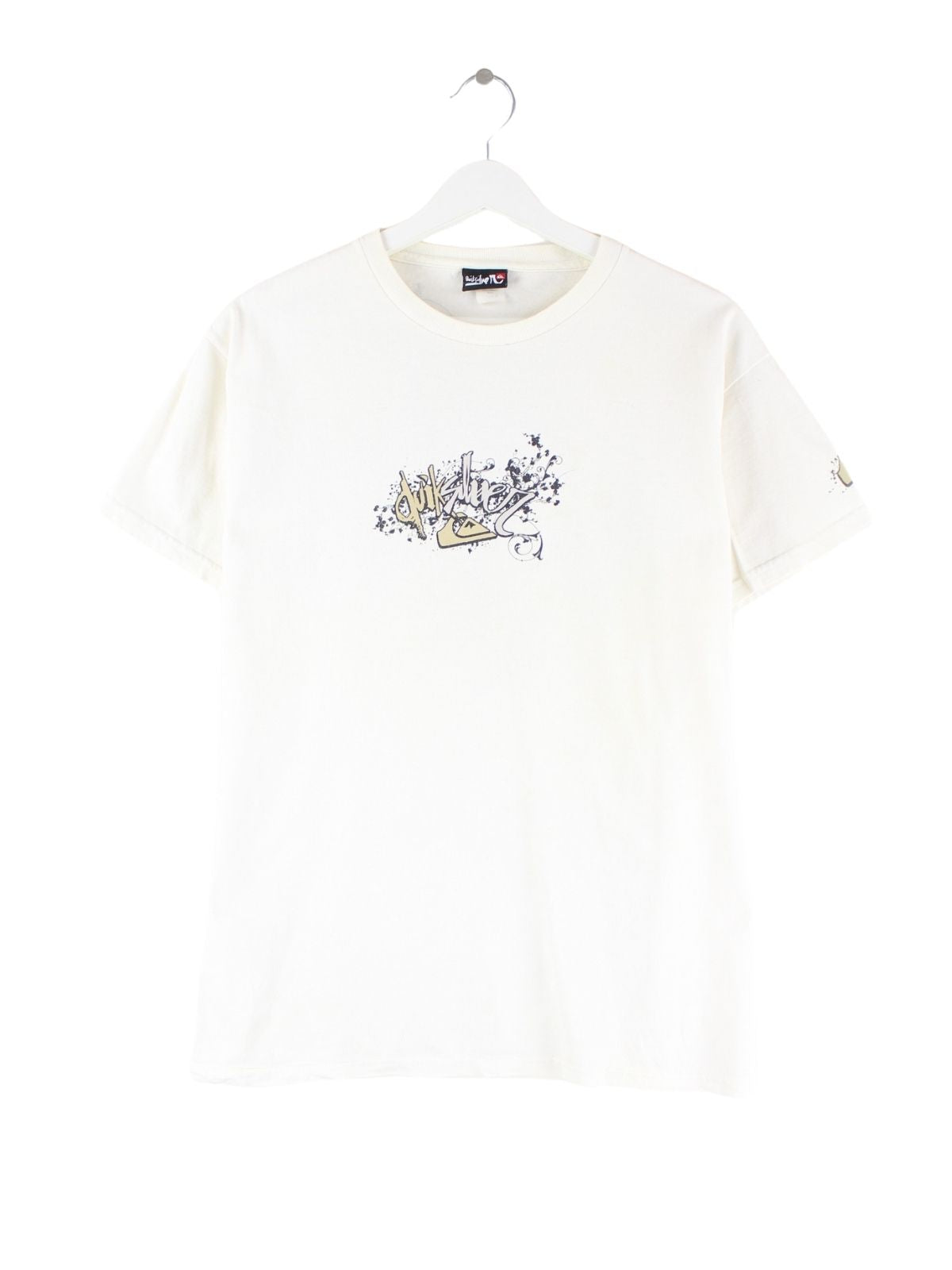 T-Shirt vom Brand Quiksilver in Größe M. Es ist aus Baumwolle gemacht und in Weiß in Stock. Mit seltenem 00s Print.