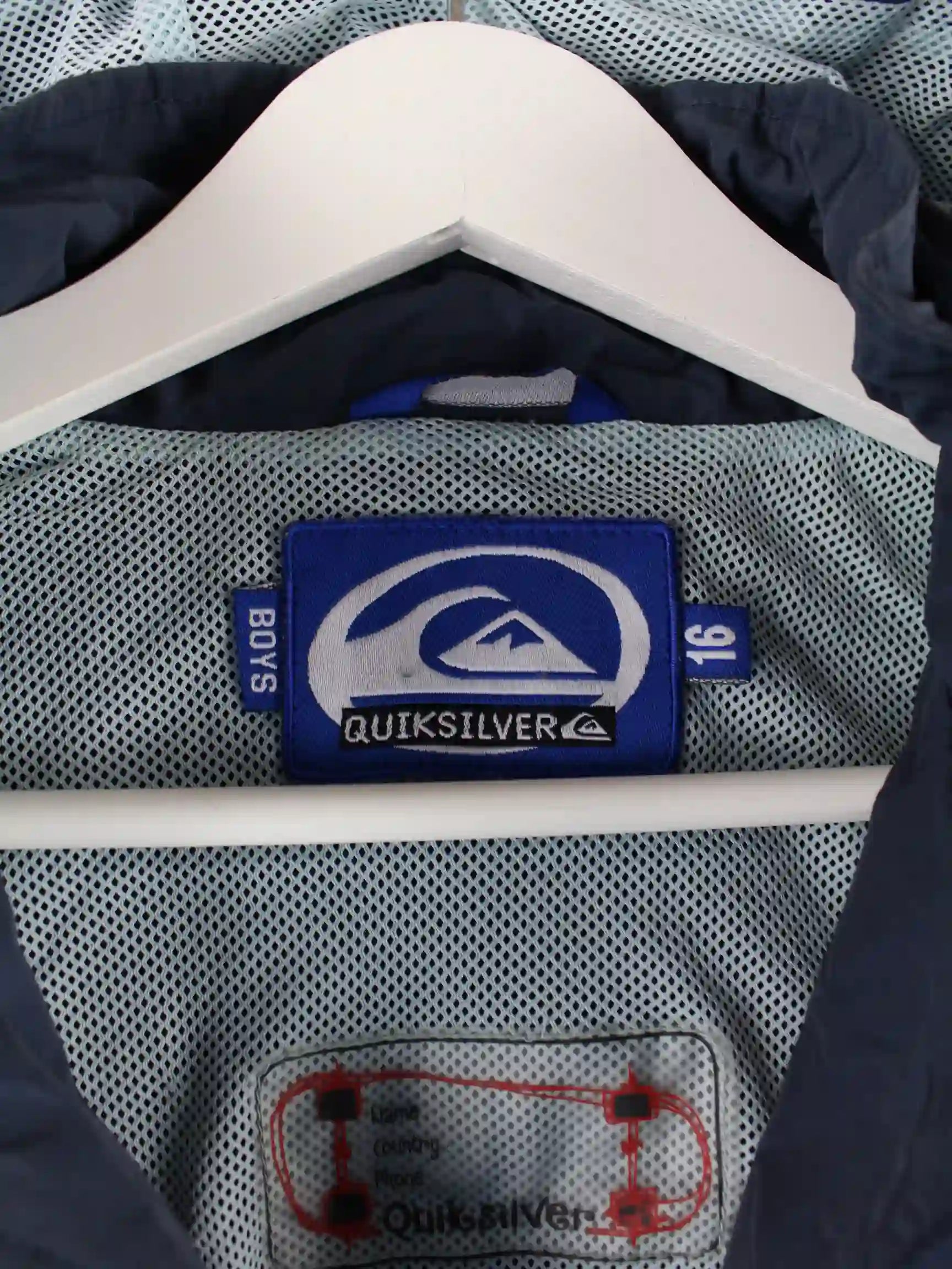 Leichte Jacke der Brand Quiksilver mit gestickten Motiven in Größe L aus den 90'ern. Sie ist aus Synthetik hergestellt und in Blau im Bestand.