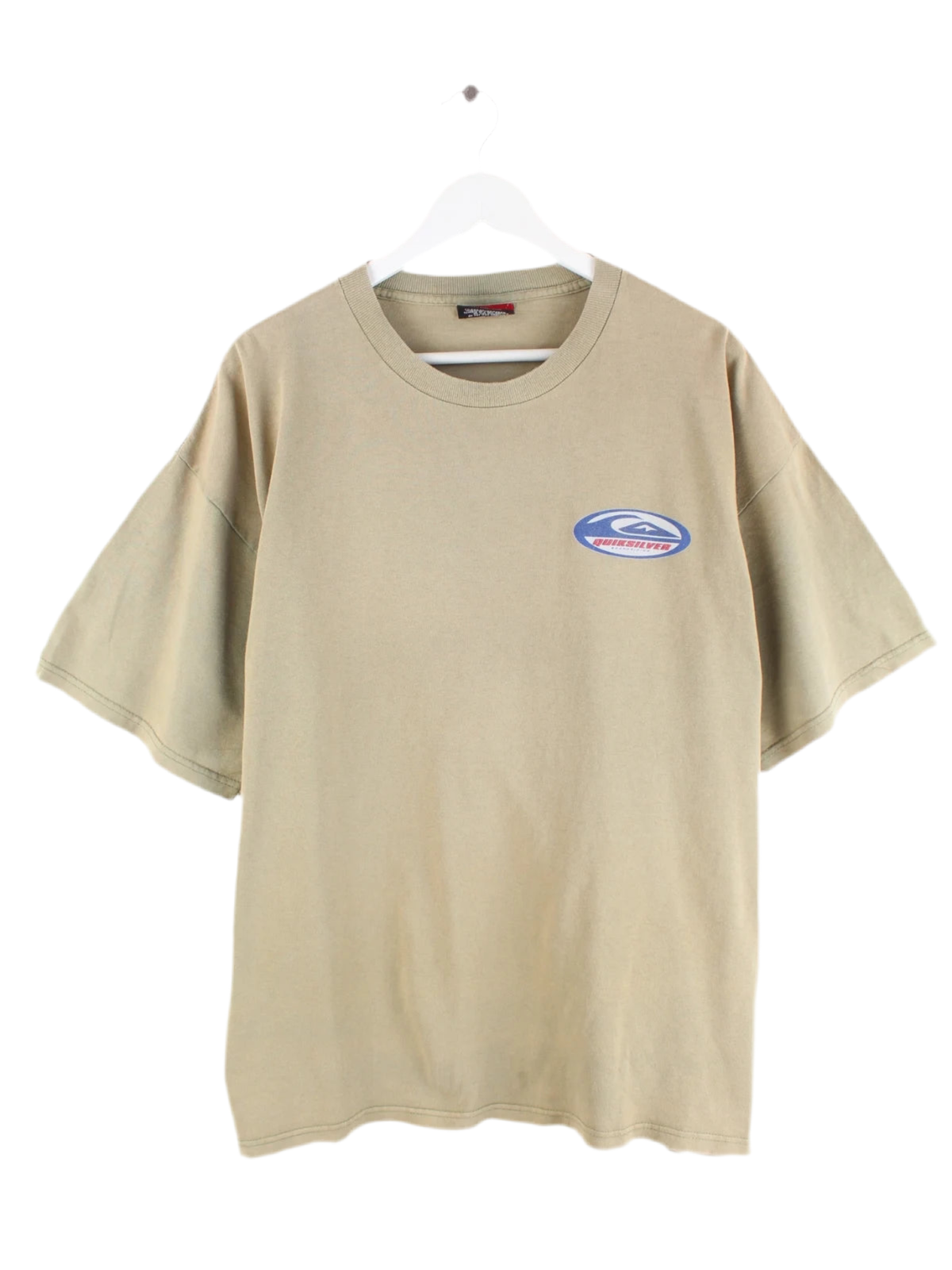 Beigefarbenes T-Shirt von Quiksilver aus den 90'ern in Größe XL. Es ist aus Baumwolle angefertigt und in gutem Zustand bei uns vorrätig. Mit seltenem Vintage Print.