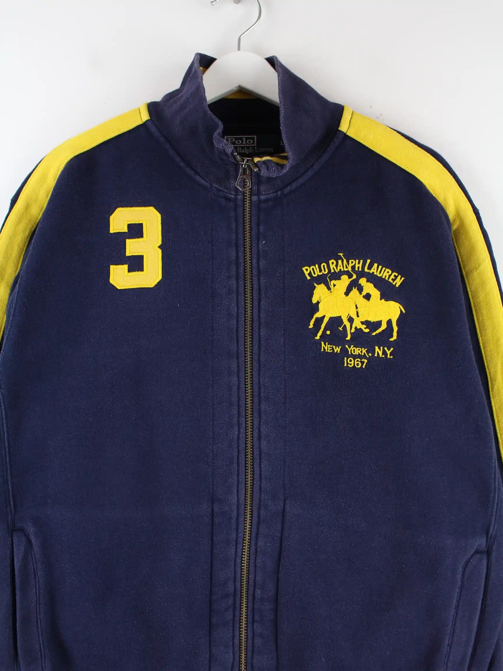 Blaue Sweatjacke mit Stickereien der Brand Ralph Lauren in Größe L. Sie ist aus einer Baumwollmischung angefertigt und in gutem Zustand auf Lager.