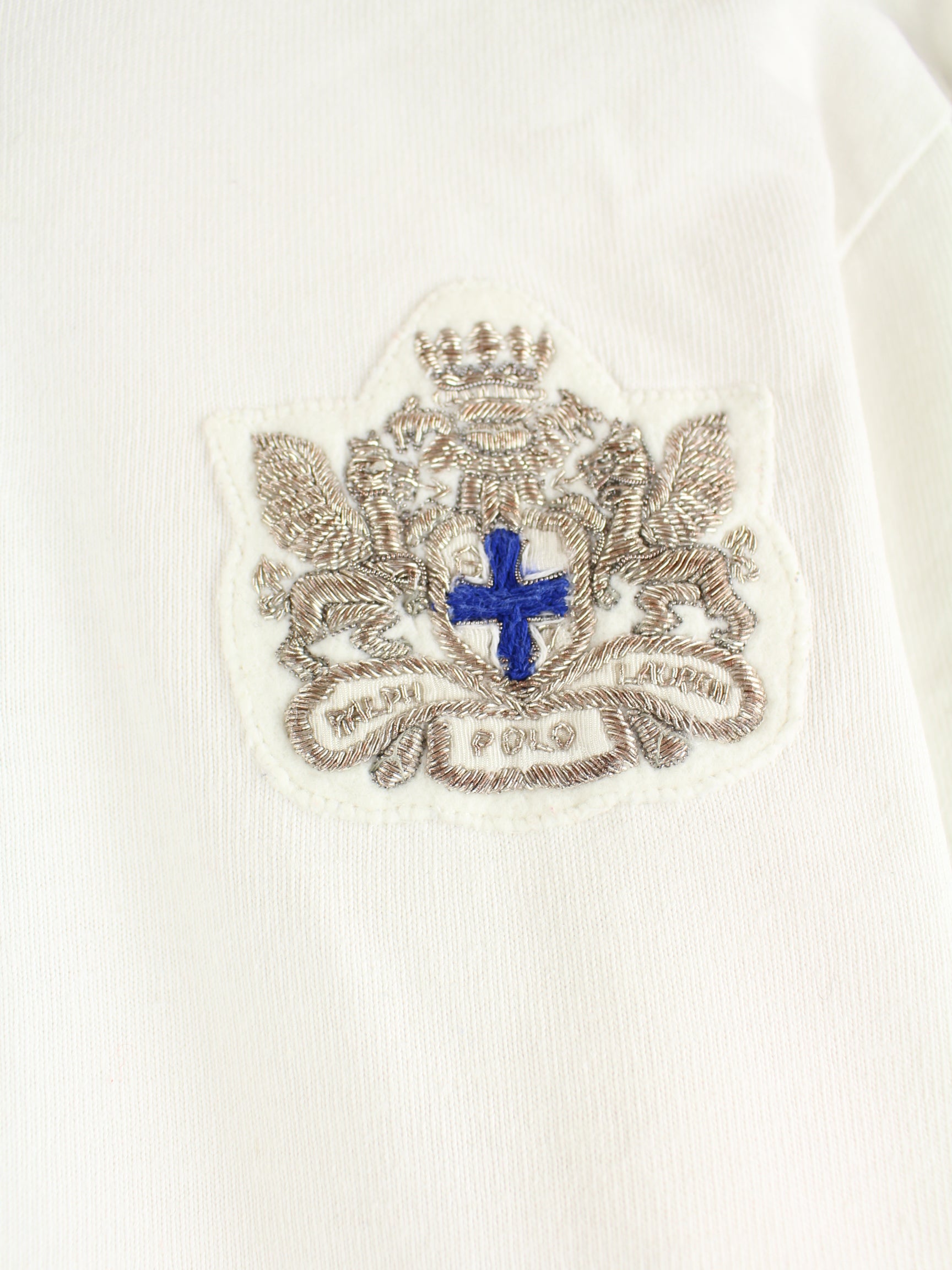 White polo shirt with embroidered motifs by Ralph Lauren from the 90's in size M. It is made of cotton and in very good condition.