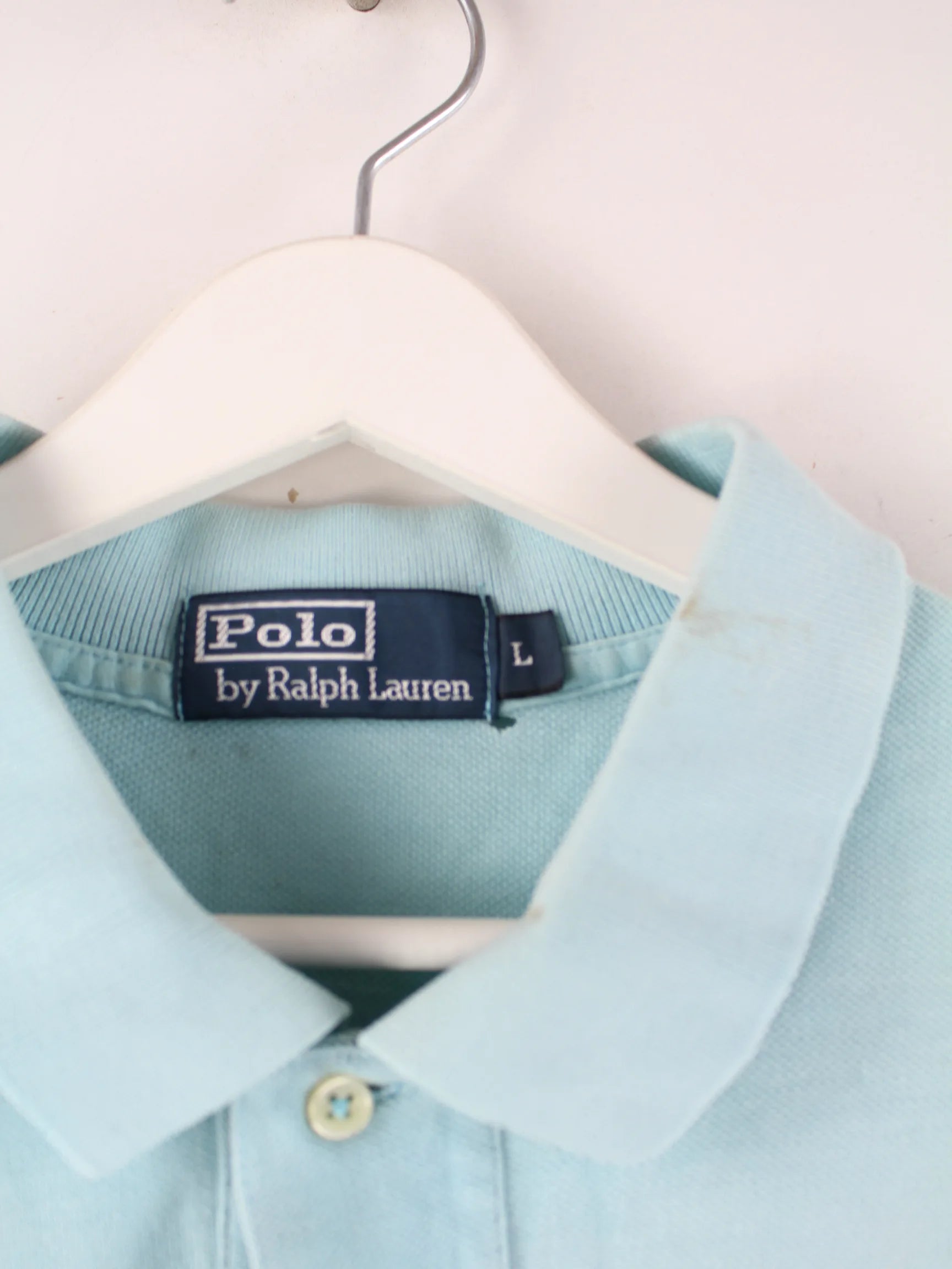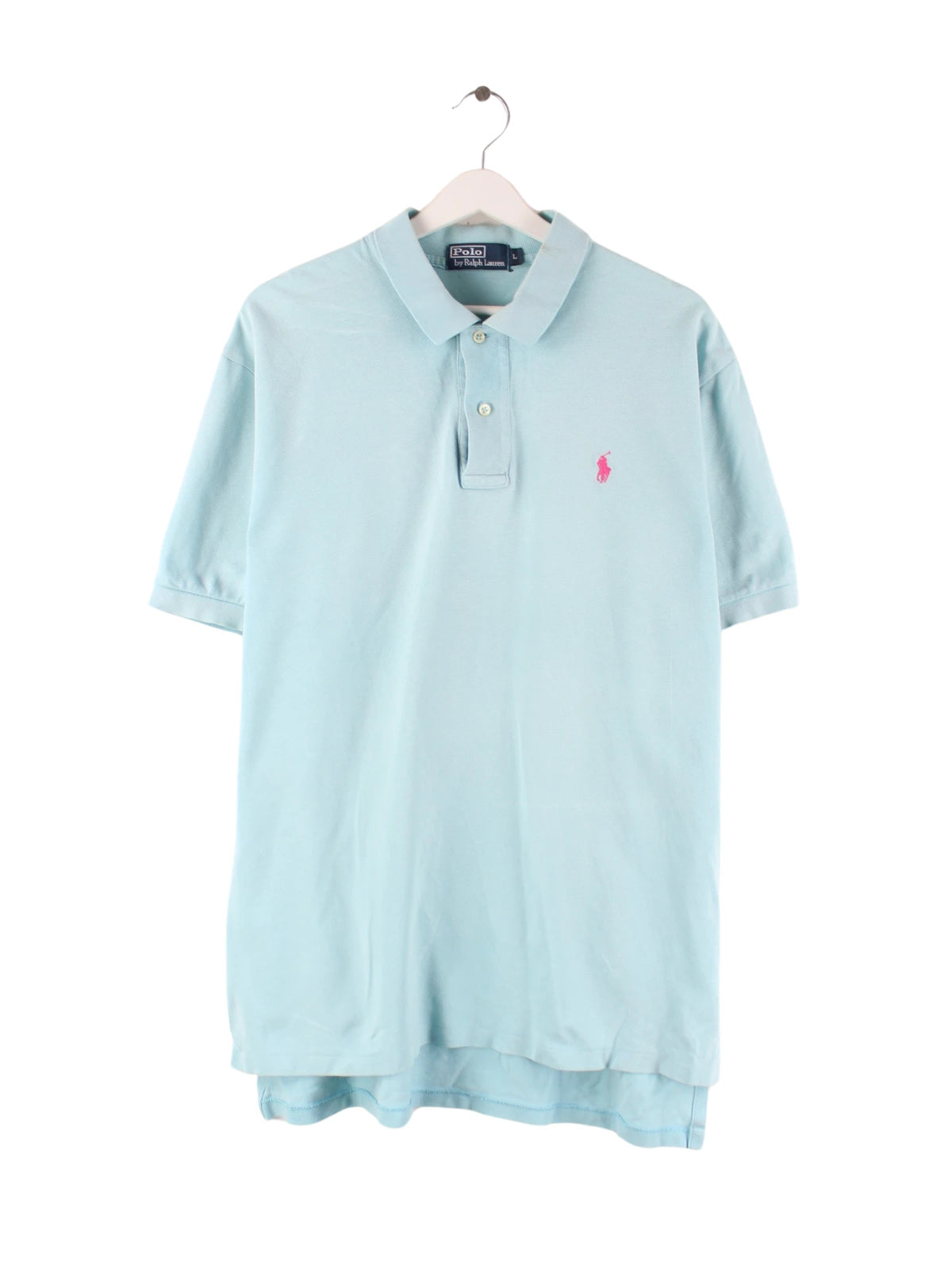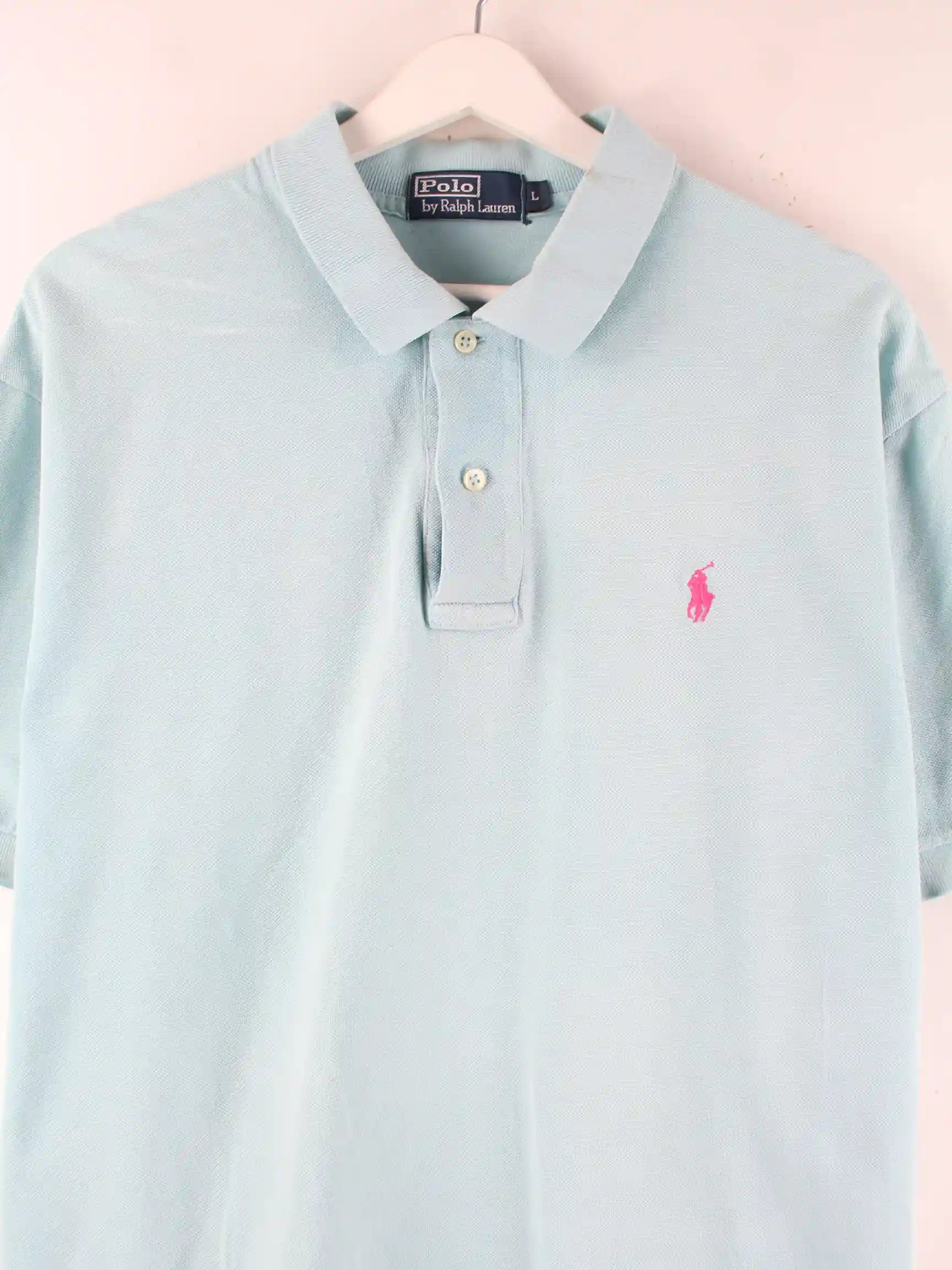 Poloshirt vom Label Ralph Lauren in Größe L aus den 90'ern. Es ist aus Baumwolle produziert und in Blau vorrätig.