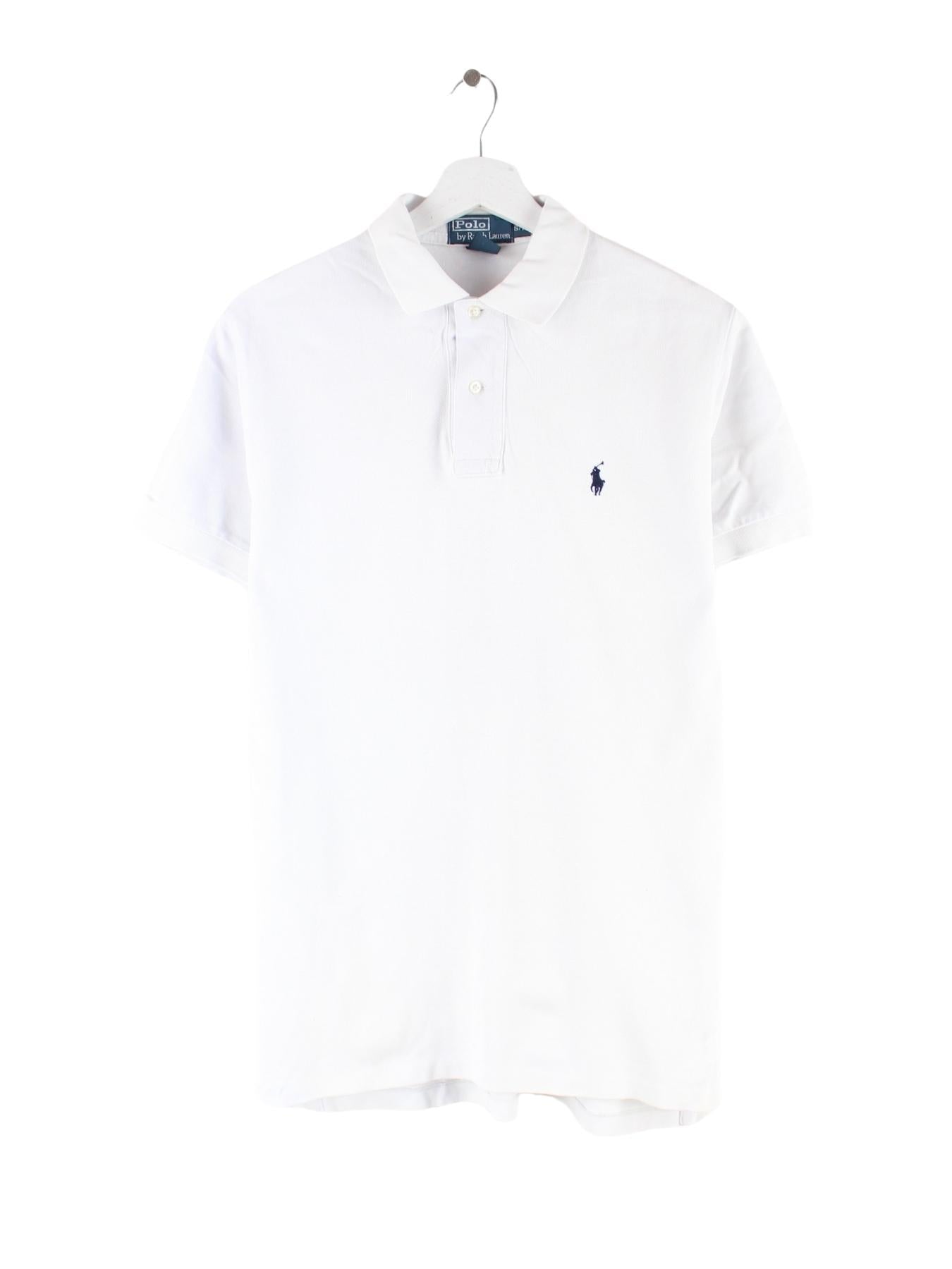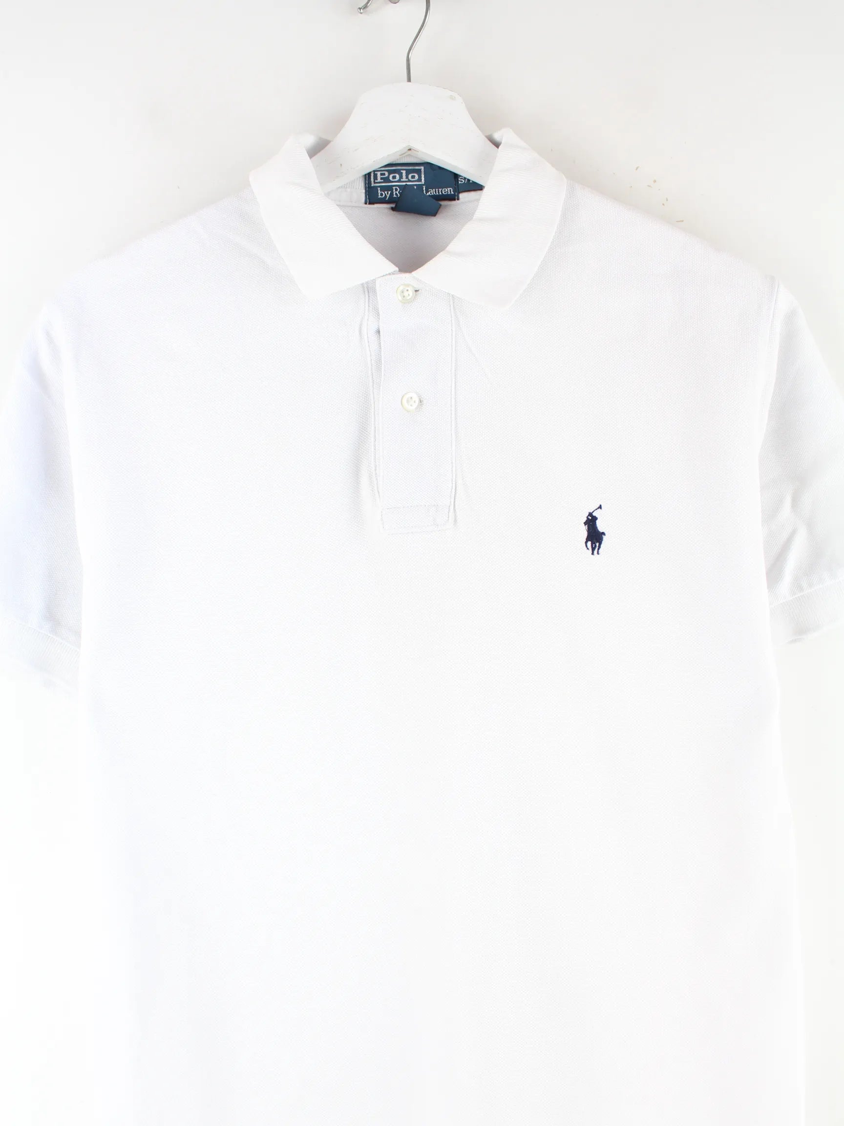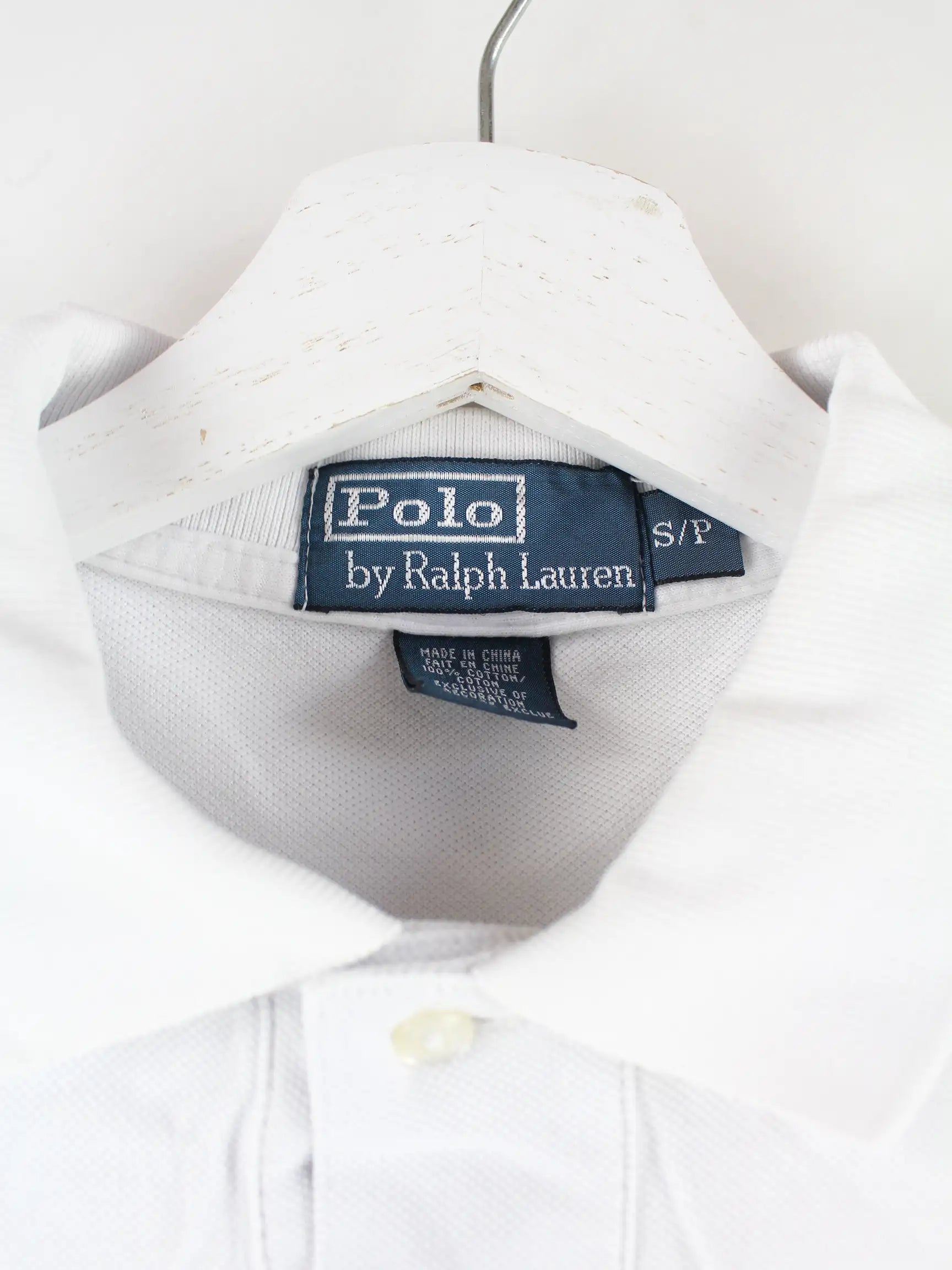 Weißes Poloshirt von Ralph Lauren aus den 90'ern in Größe S. Es ist aus Baumwolle angefertigt und in gutem Zustand in Stock.