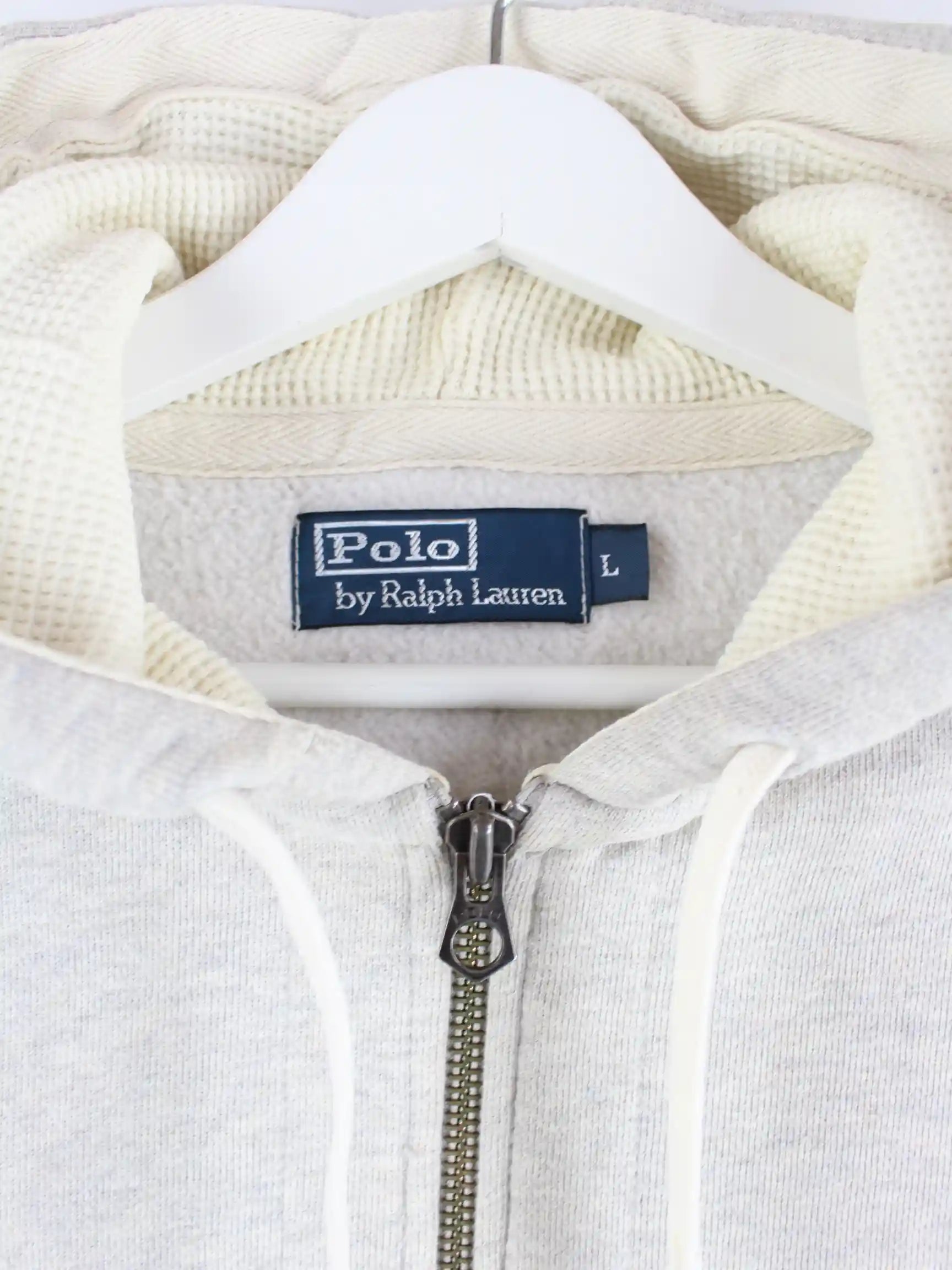 Grauer Hoodie mit langem Reißverschluß der Brand Ralph Lauren aus den 90'ern in Größe L. Er ist aus einer Baumwollmischung und in gutem Zustand bei uns vorrätig.