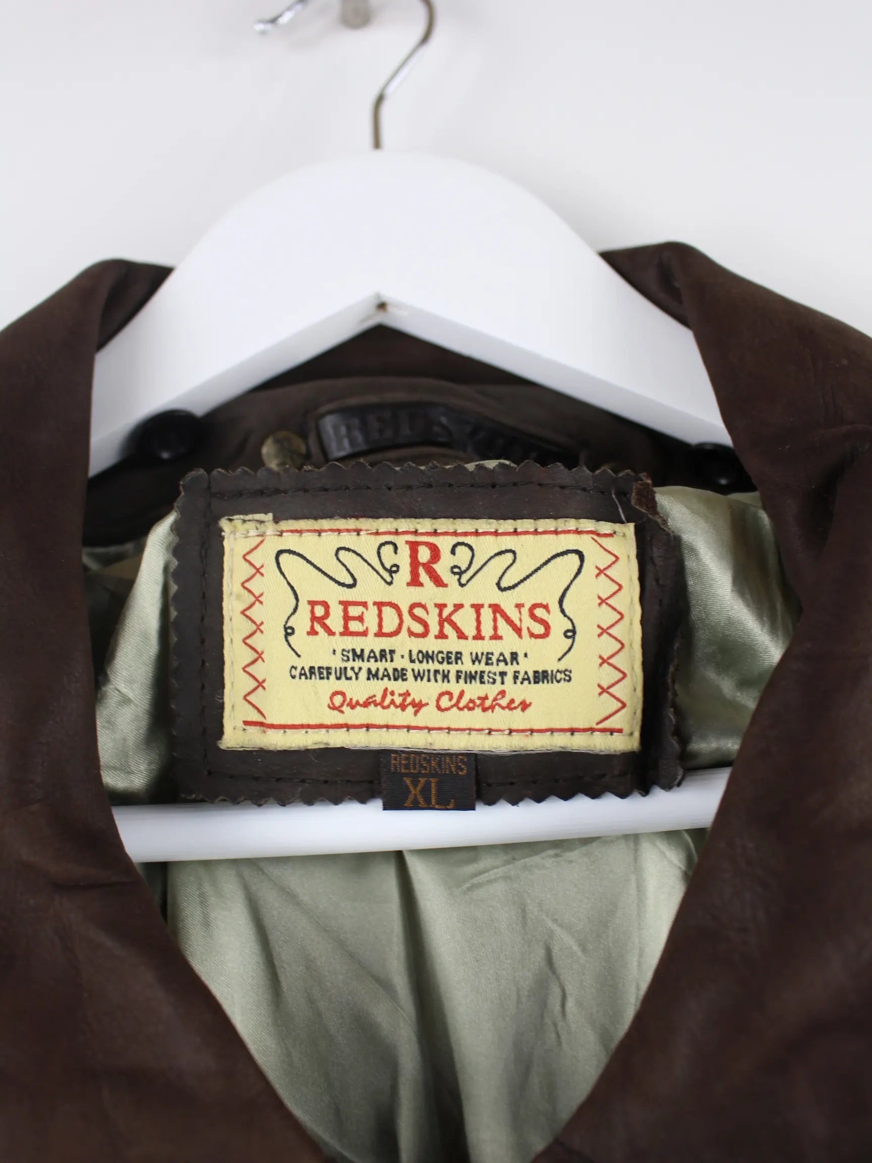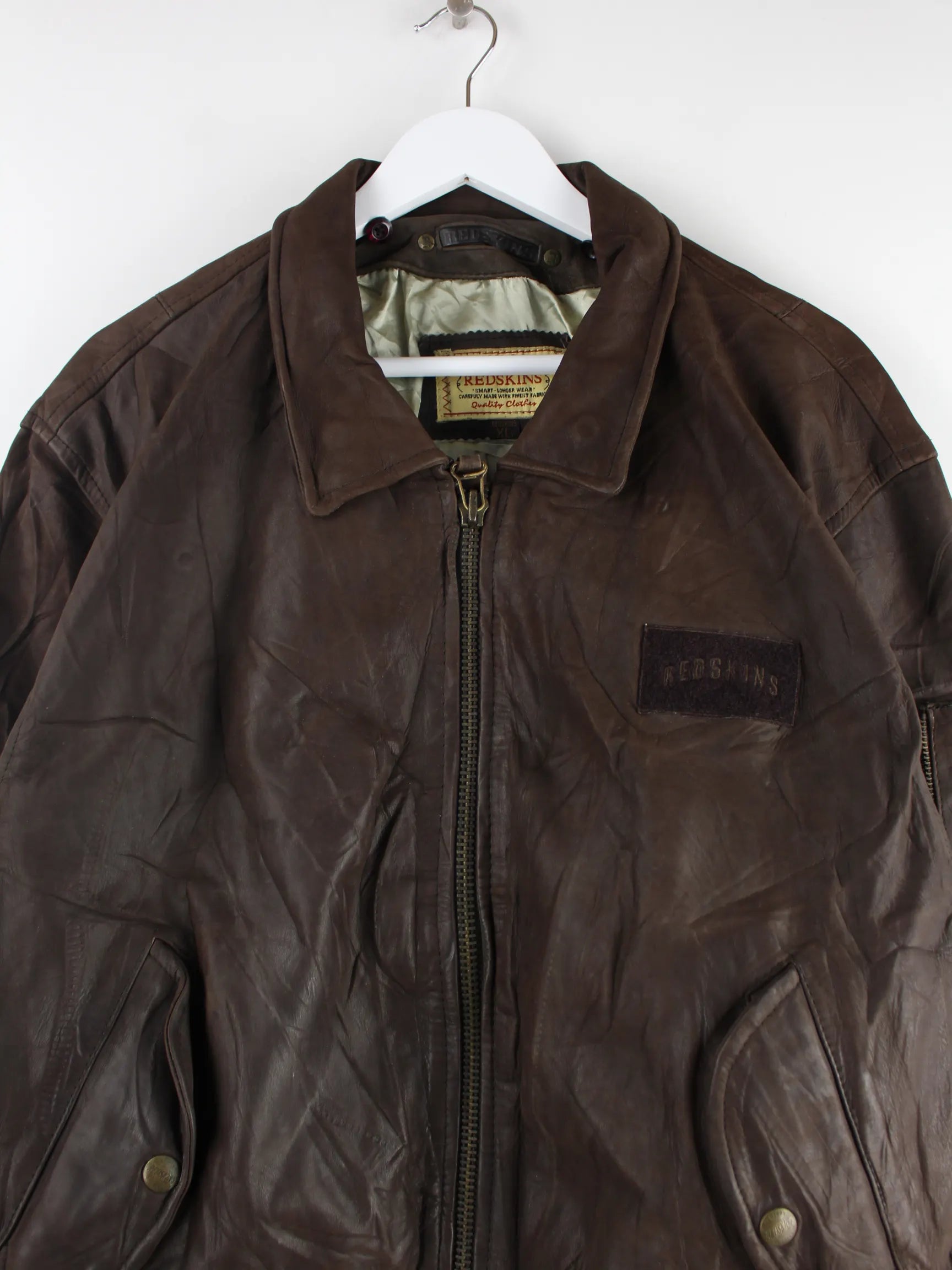 Jacke von Redskins in Größe XL aus den 90'ern. Sie ist aus Leder gemacht und in Braun bei uns vorrätig.
