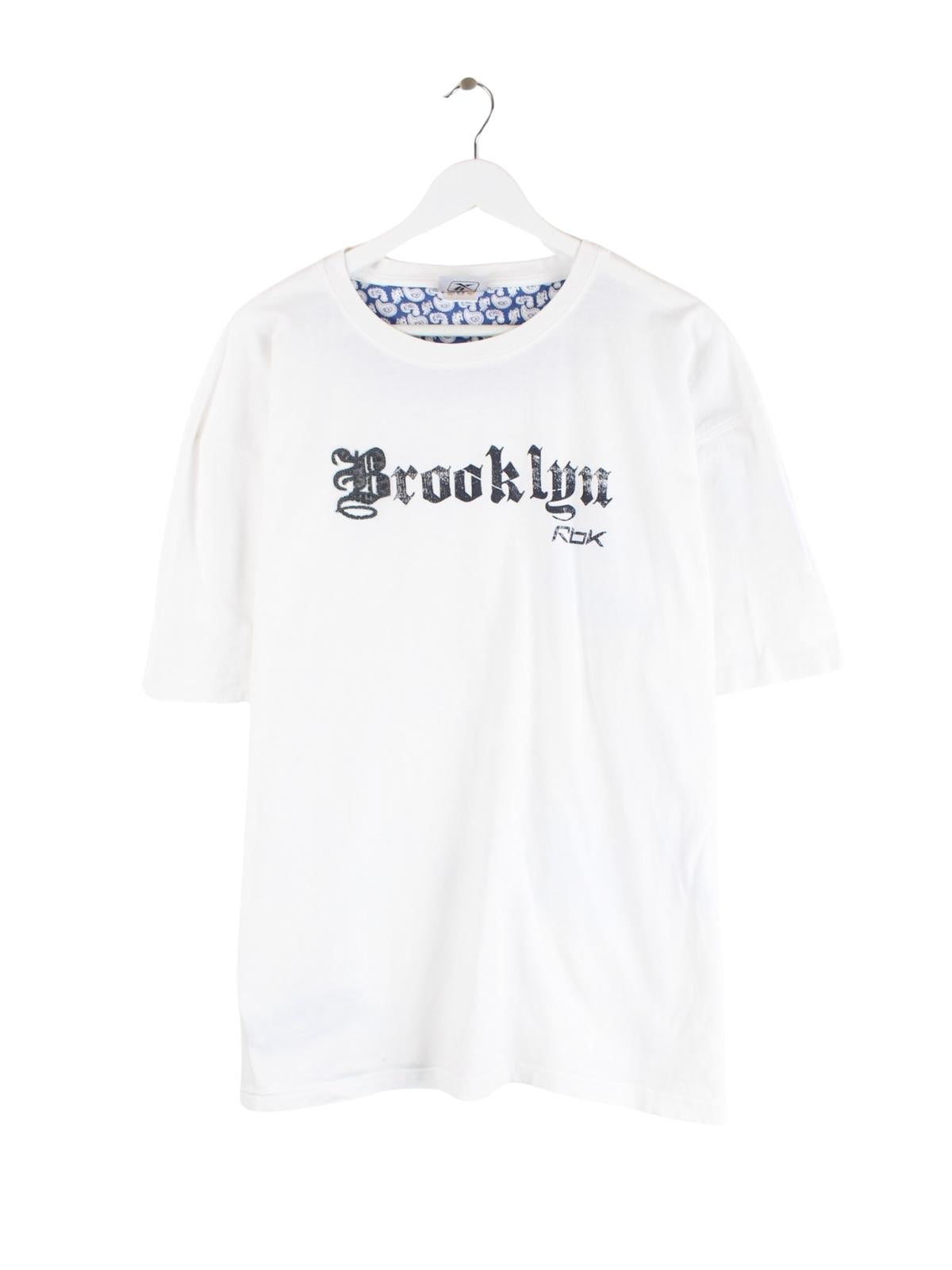 Weißes T-Shirt der Brand Reebok in Größe XXL. Es ist aus Baumwolle gefertigt und in sehr gutem Zustand im Bestand. Mit chiquem Brooklyn Print.