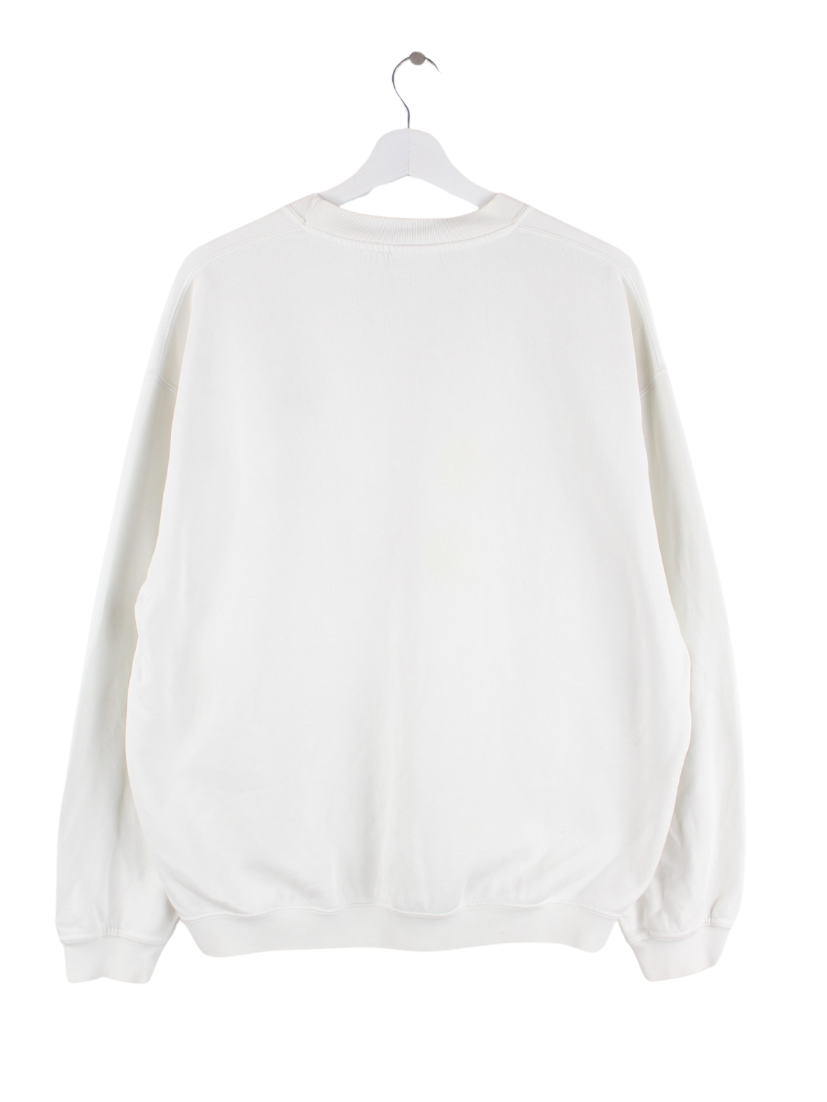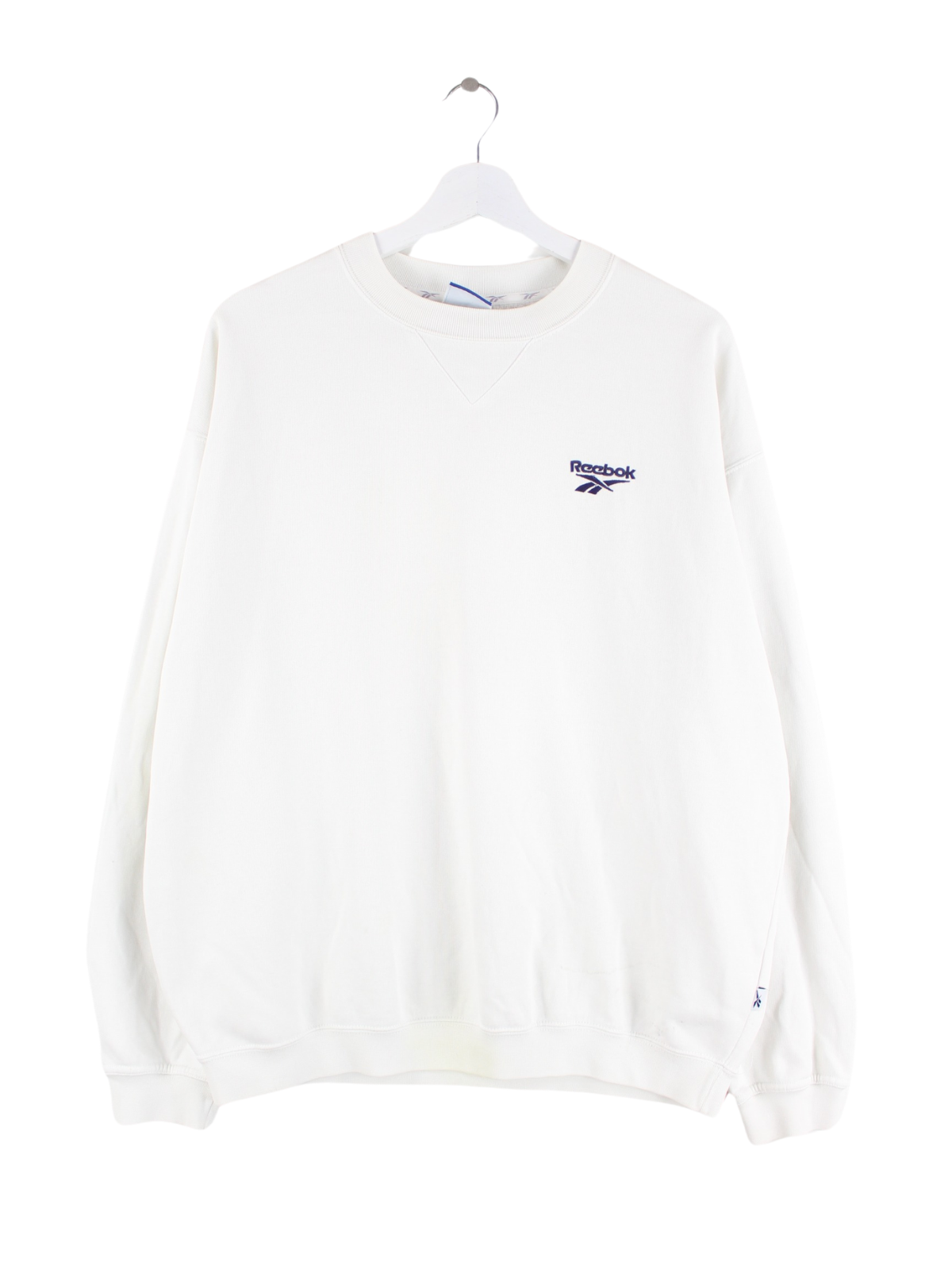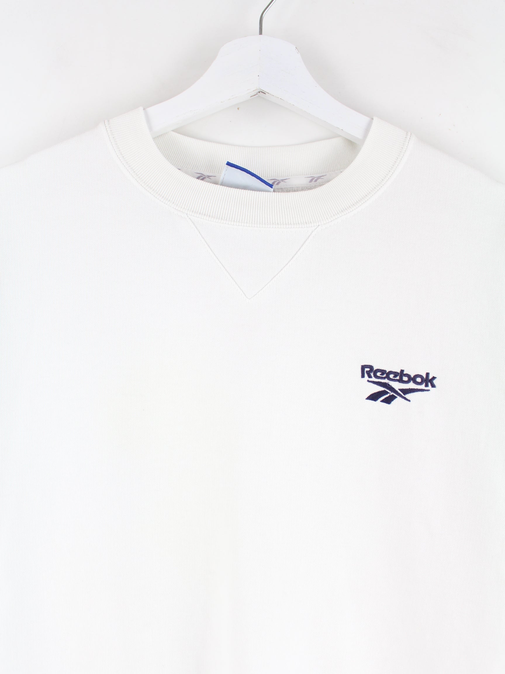 Sweater from the label Reebok with embroidery in size S. It is made from a cotton blend and is in stock in white.