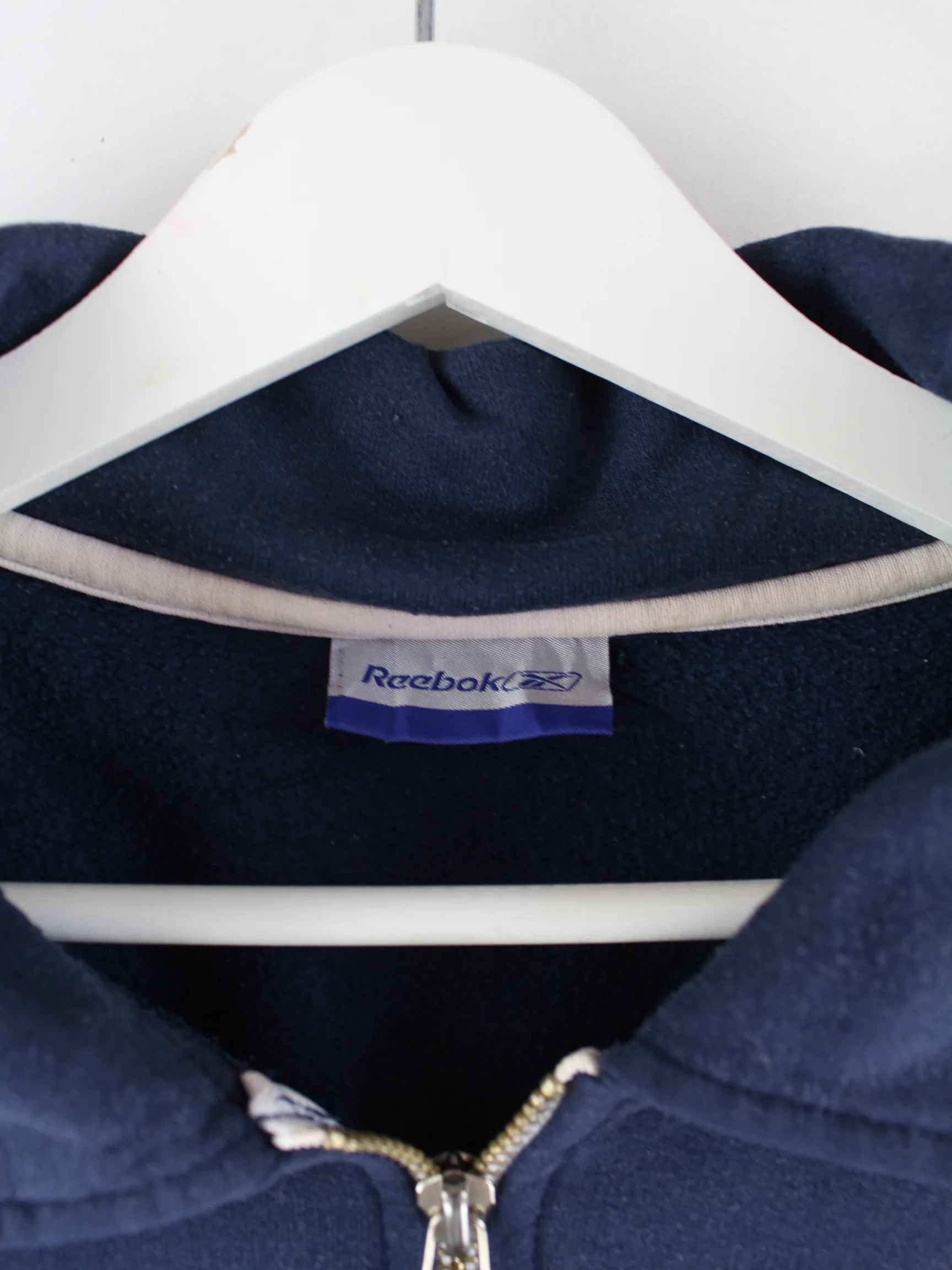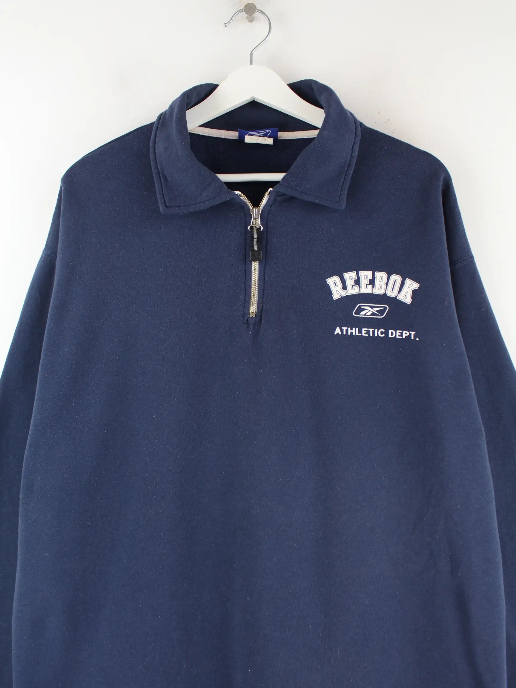 Sweater aus dem Hause Reebok mit kurzem Reißverschluß in Größe XXL. Er ist aus einer Baumwollmischung gemacht und in Blau bei uns zu bekommen.