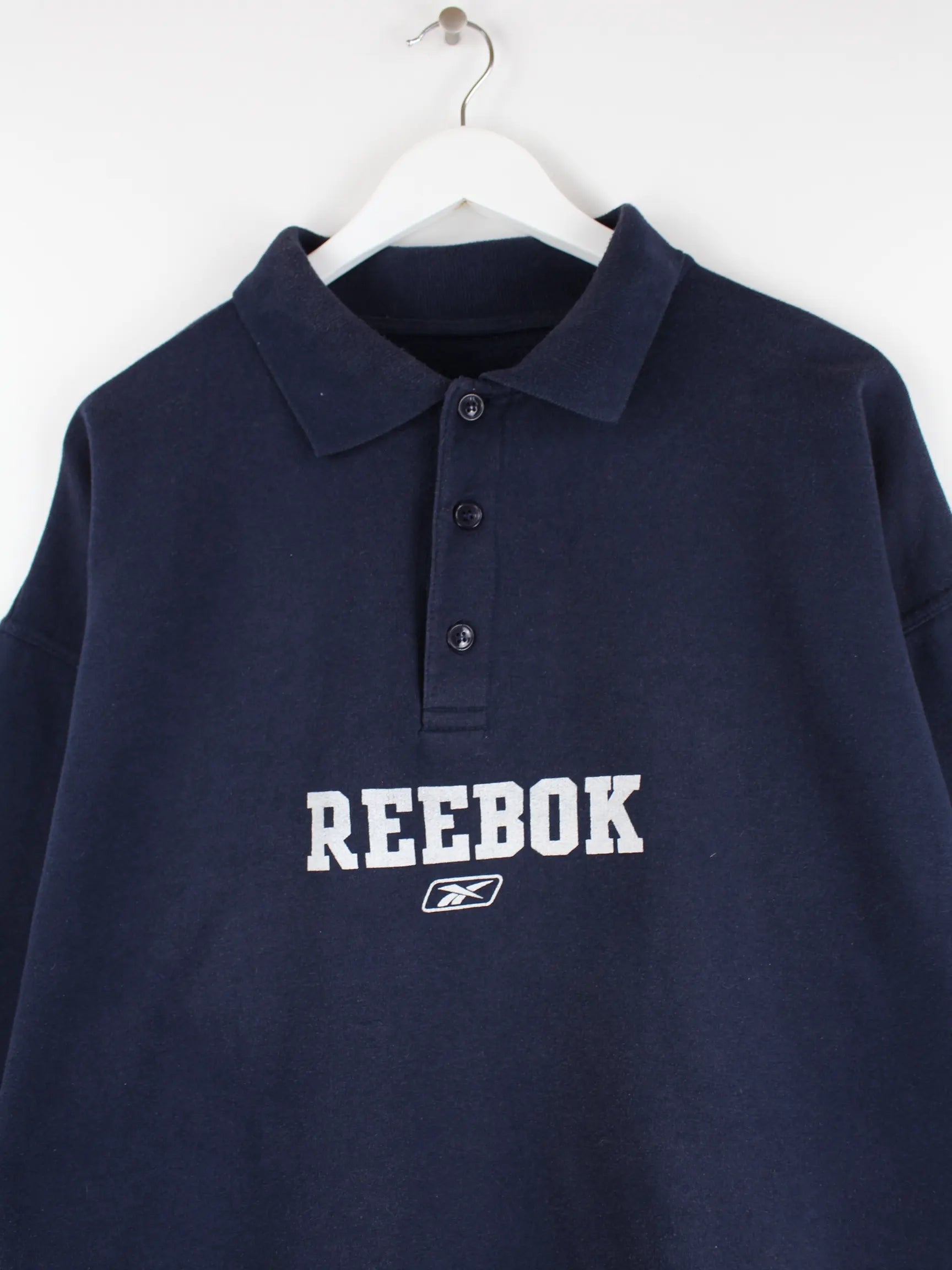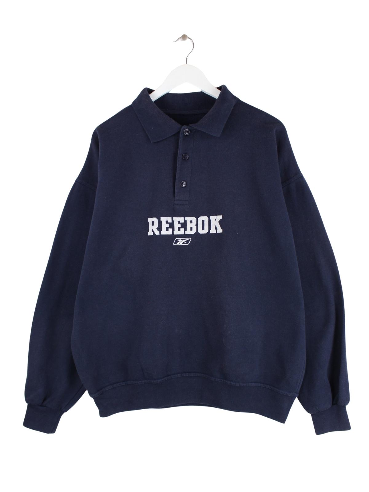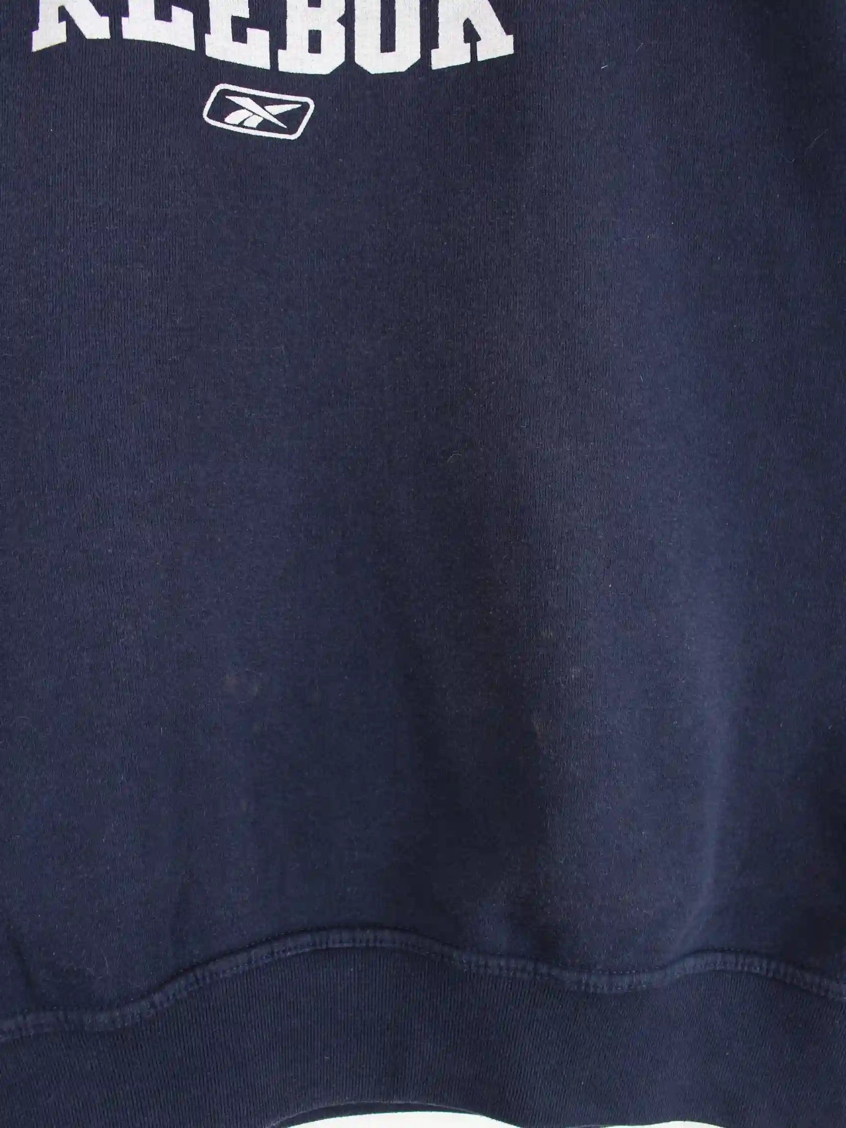 Blauer Sweater von Reebok in Größe L. Er ist aus einer Baumwollmischung angefertigt. Den Zustand würden wir als 'In Ordnung' bezeichnen (vergl. Bilder).Mit schickem 00s Print.