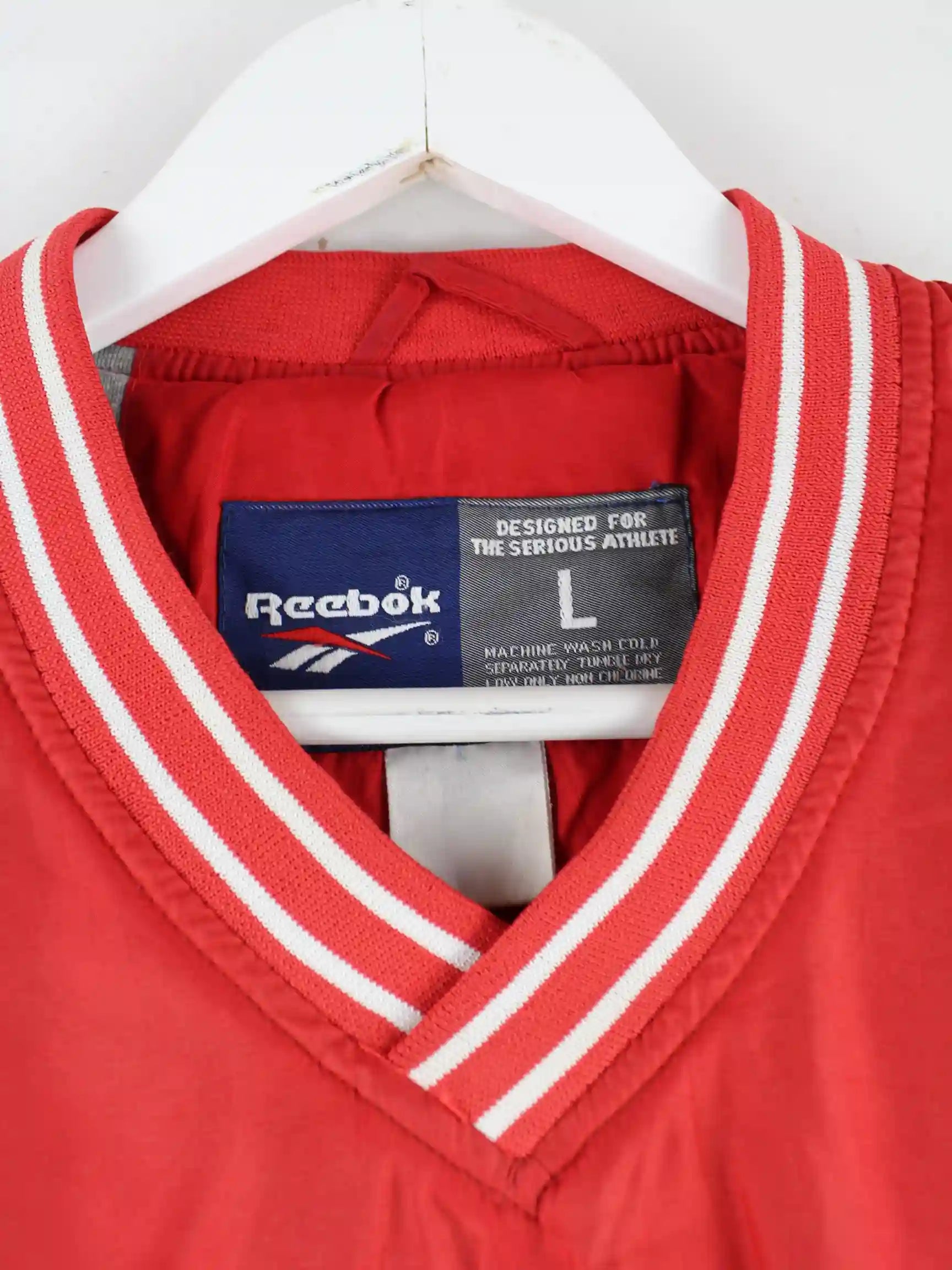 Roter Windbreaker der Brand Reebok in Größe L. Er ist aus Synthetik angefertigt. Den Zustand würden wir als 'In Ordnung' bezeichnen (vergl. Bilder).
