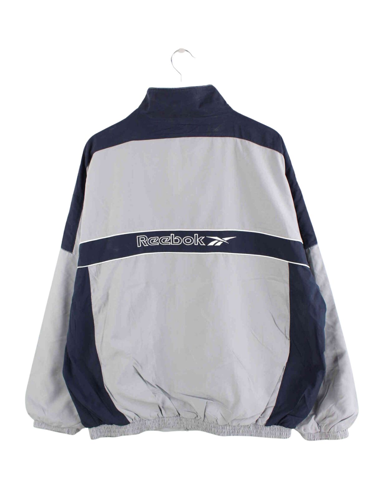 Gray training jacket with embroidered logo from the brand Reebok from the 90s in size XL. It is made of synthetic material and is in very good condition in stock.