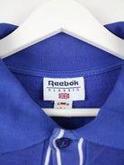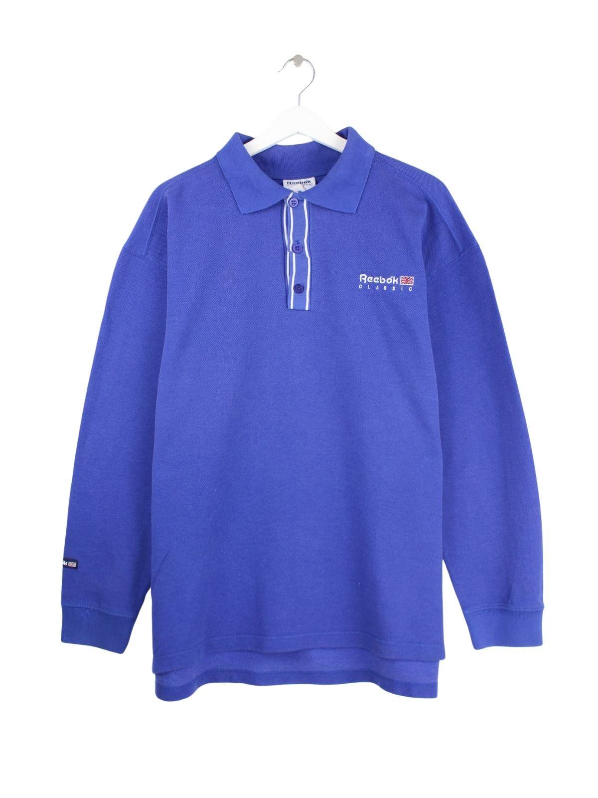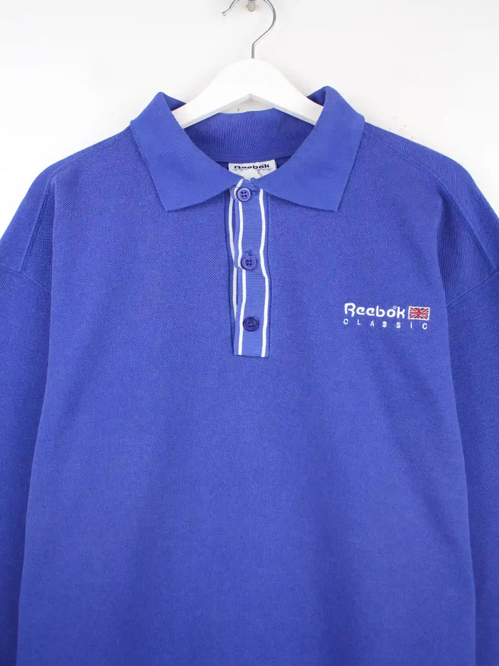 Poloshirt aus dem Hause Reebok in Größe M aus den 90'ern. Es ist aus Baumwolle gemacht und in Blau lieferbar.