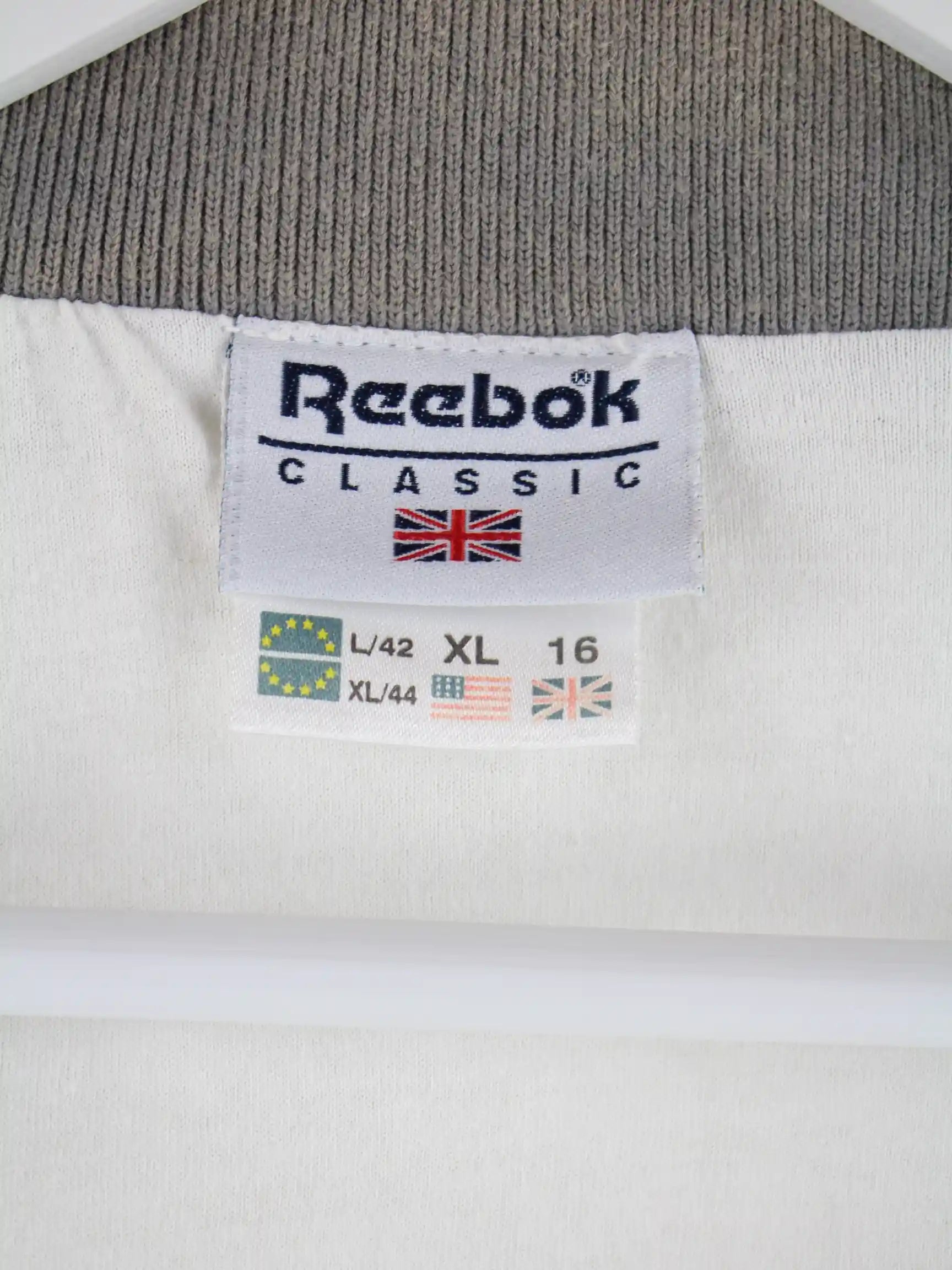 Weiße Trainingsjacke vom Brand Reebok in Größe L. Sie ist aus Synthetik hergestellt und in gutem Zustand auf Lager.