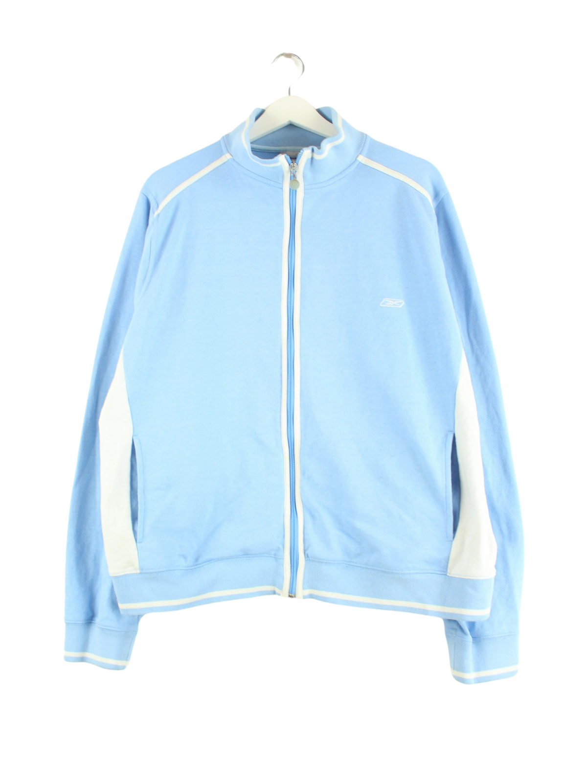 Sweat jacket from the label Reebok in size L from the early 2000s. It is made from a cotton blend and is in stock in blue.
