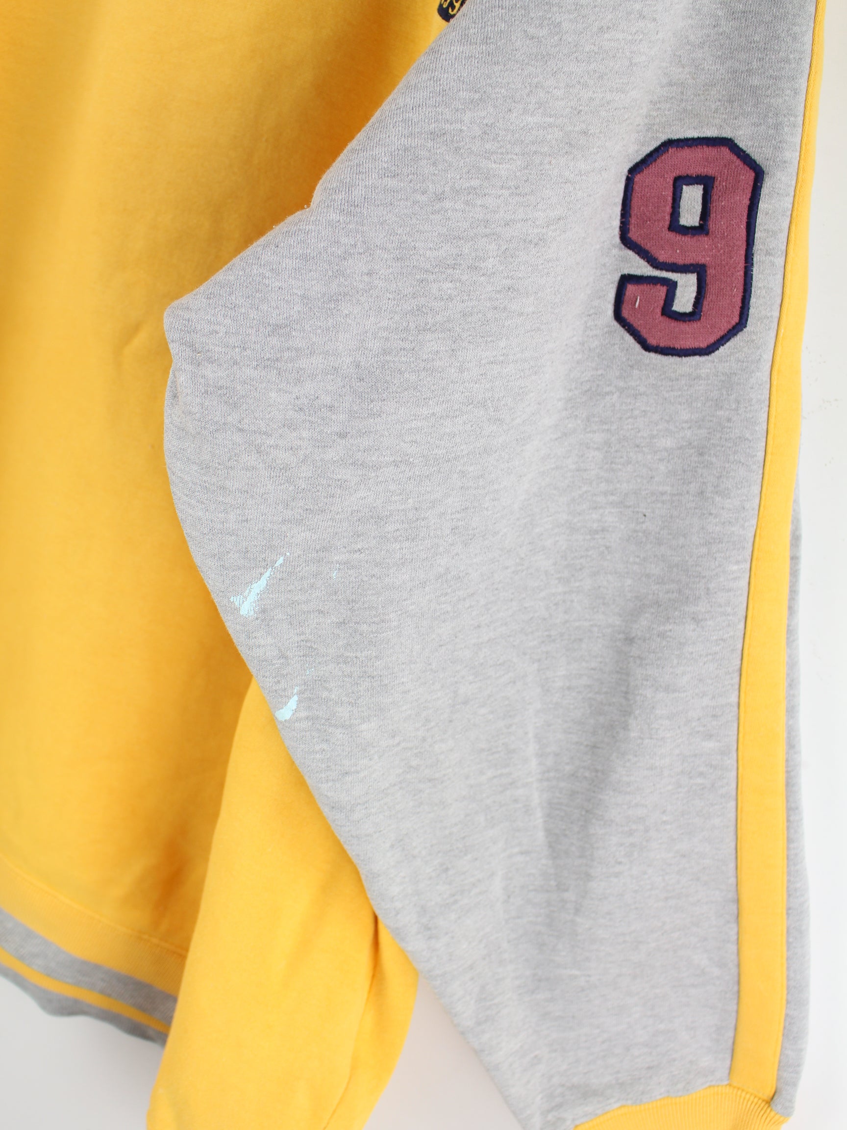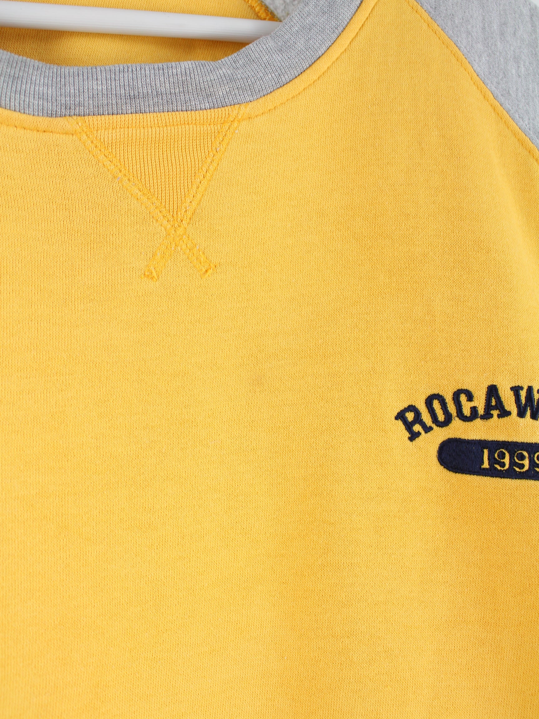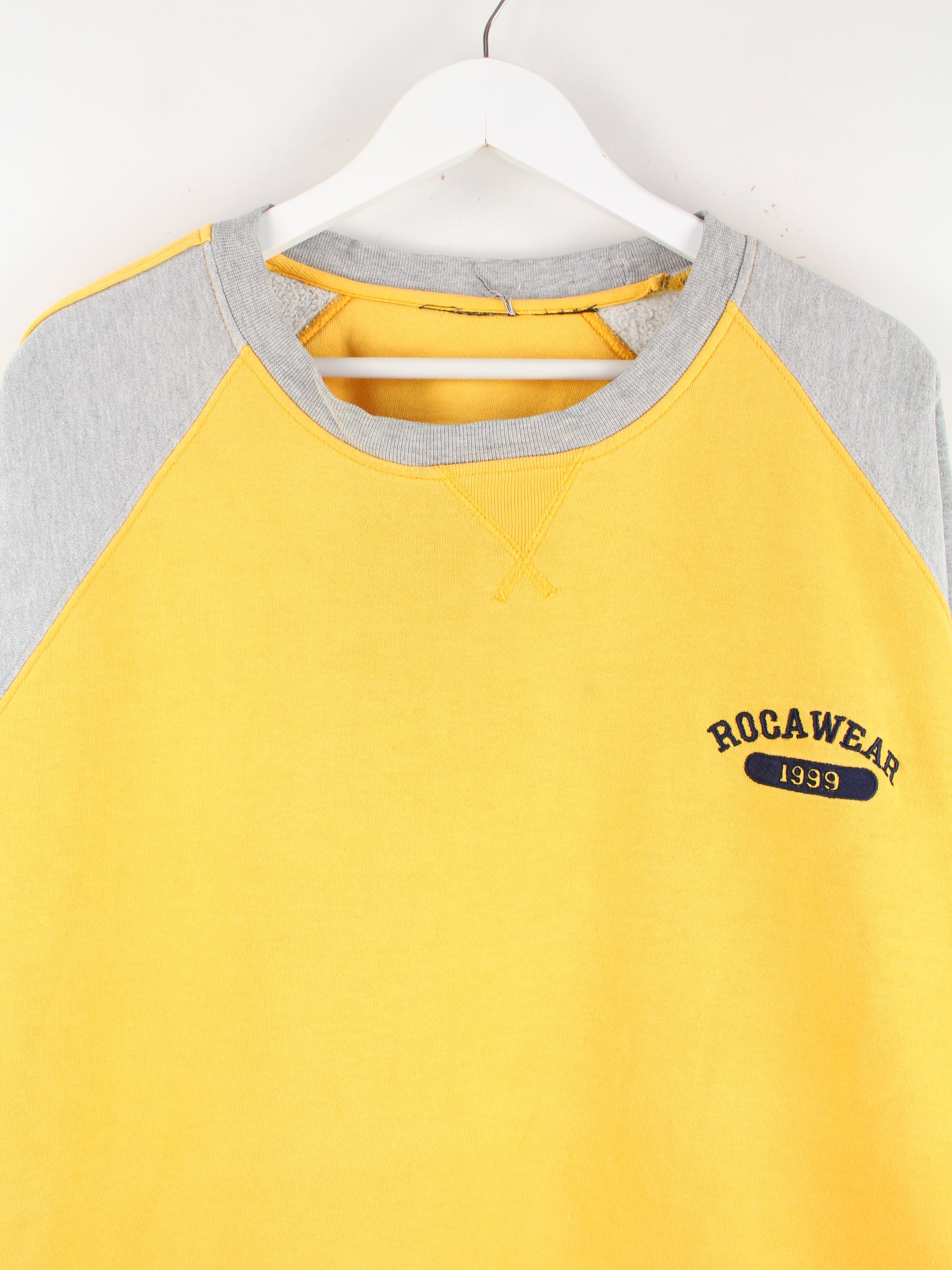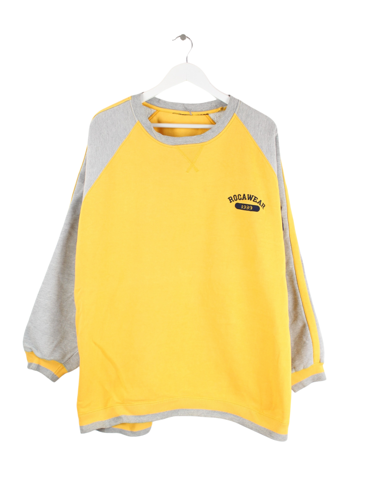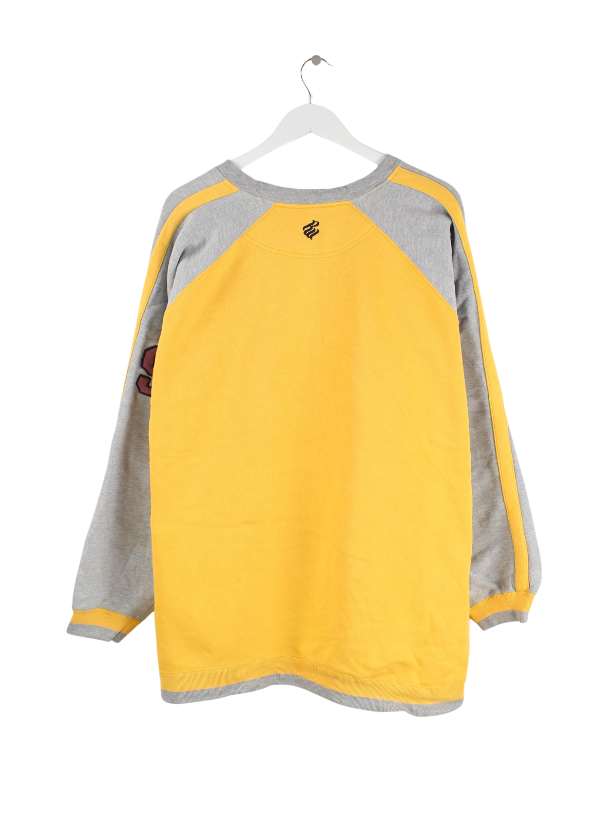 Gelber Sweater mit gestickten Motiven vom Label Roca Wear in Größe 3XL. Er ist aus einer Baumwollmischung produziert. Den Zustand würden wir als 'In Ordnung' bezeichnen (vergl. Bilder).