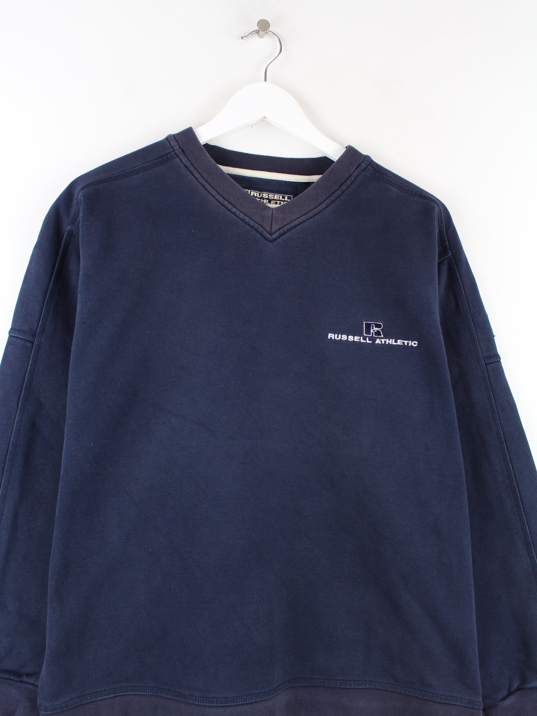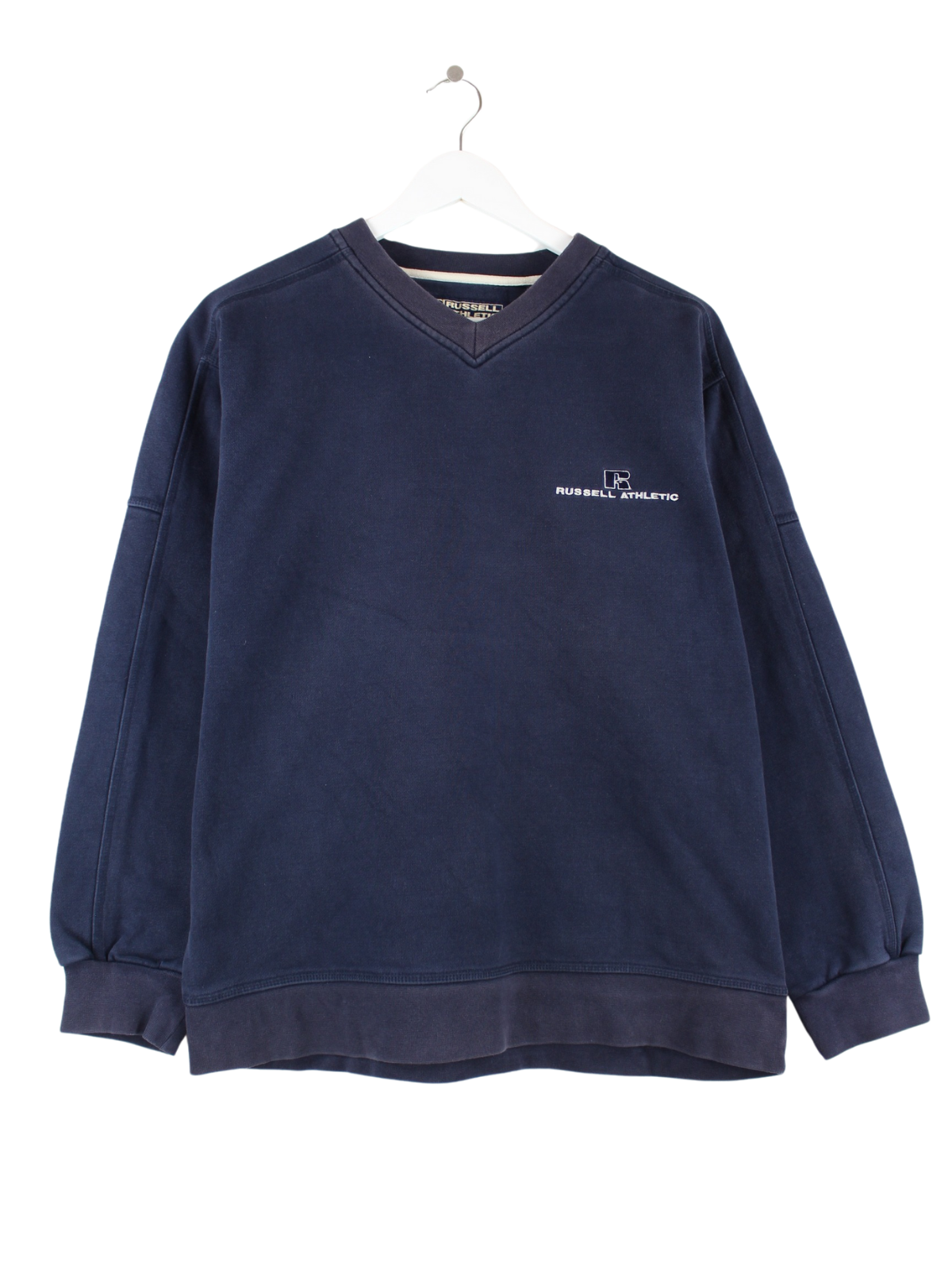 Blue sweater with embroidered motifs from Russell Athletic in size L. It is made from a cotton blend and is in good condition in stock.