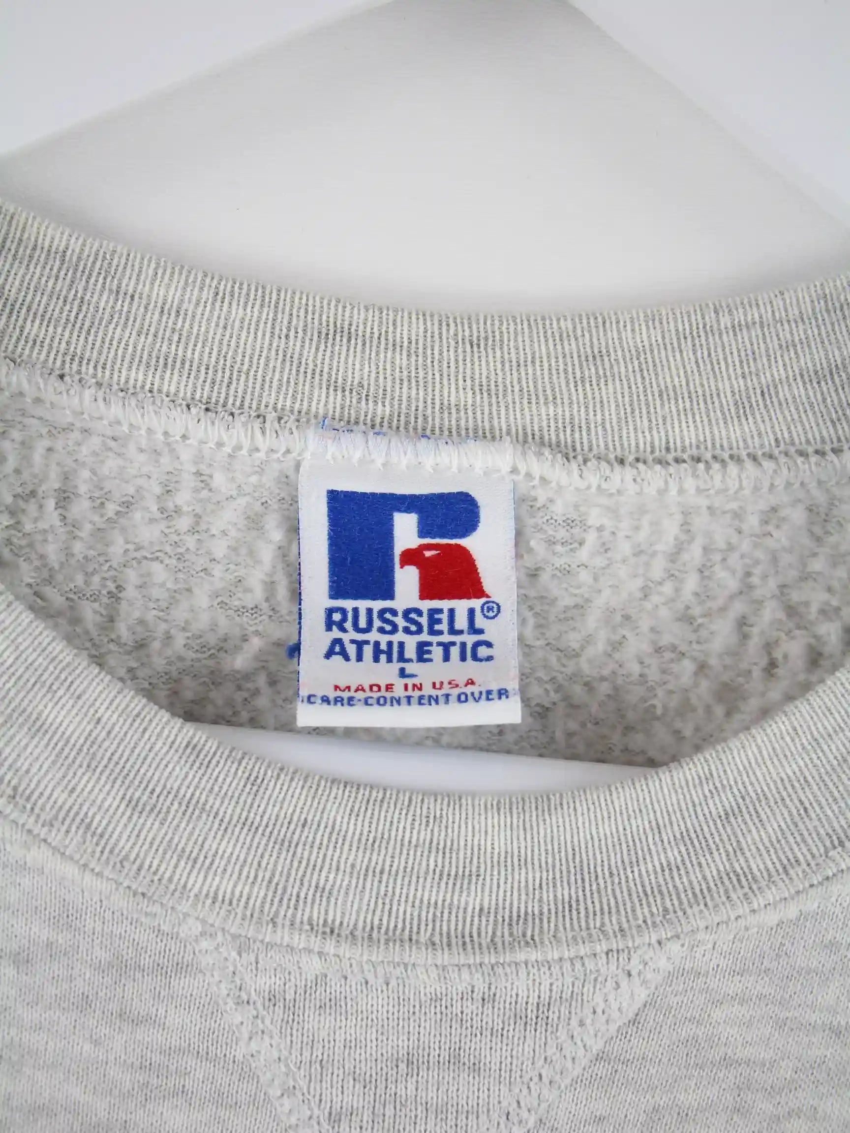 Sweater der Marke Russell Athletic in Größe L. Er ist aus einer Baumwollmischung gefertigt und in Grau im Angebot. Mit tollem University Print.