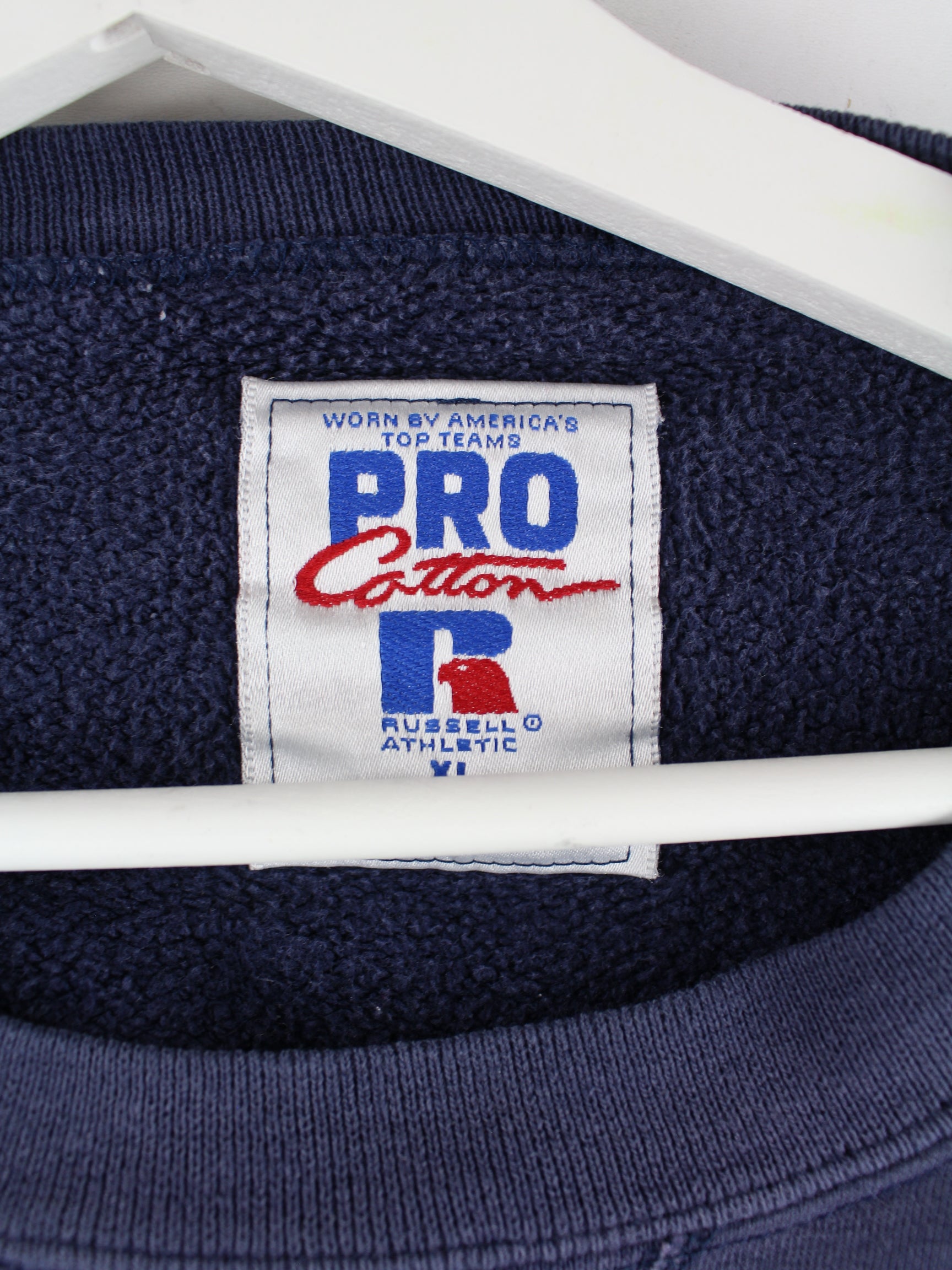 Blauer Sweater von Russell Athletic aus den 90'ern in Größe XL. Er ist aus einer Baumwollmischung produziert und in sehr gutem Zustand auf Lager.