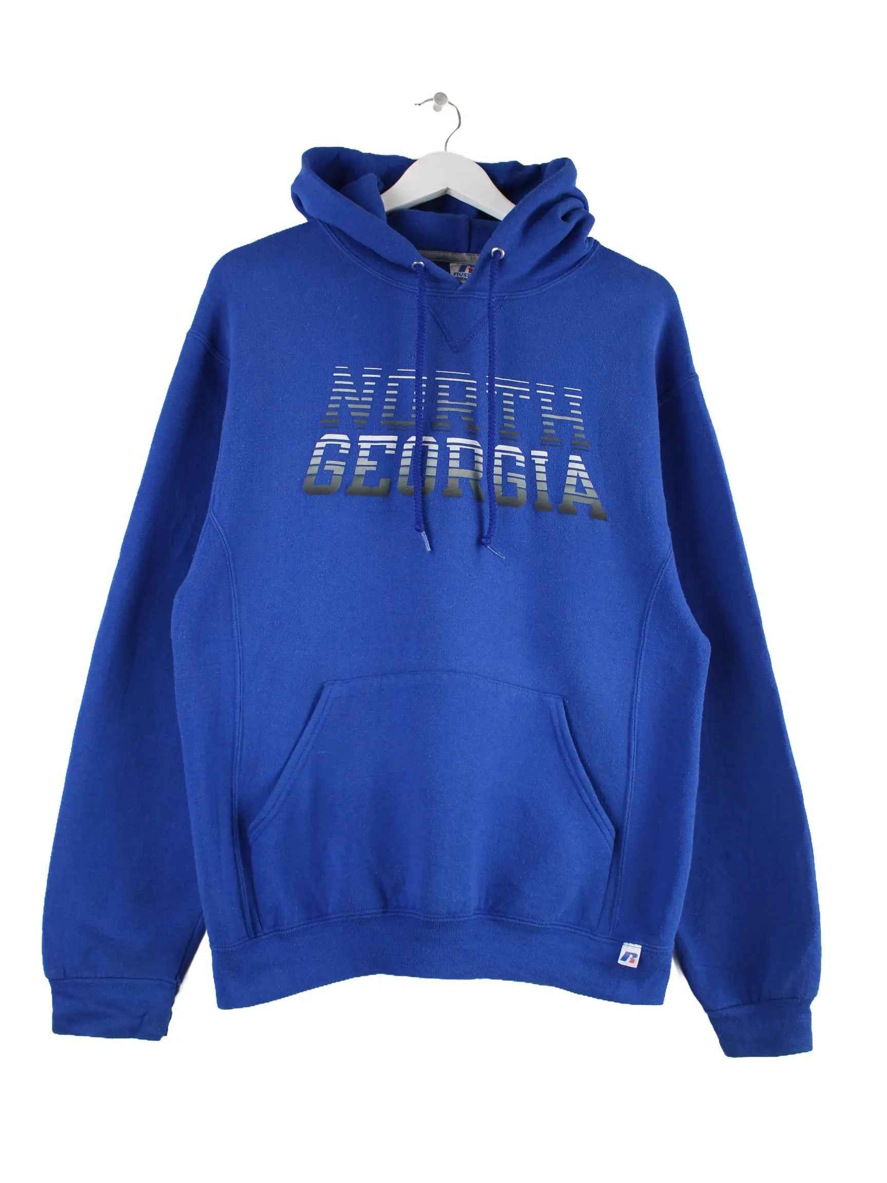 Blauer Hoodie der Marke Russell Athletic in Größe M. Er ist aus einer Baumwollmischung angefertigt und in gutem Zustand zu bekommen. Mit schickem Georgia Print.