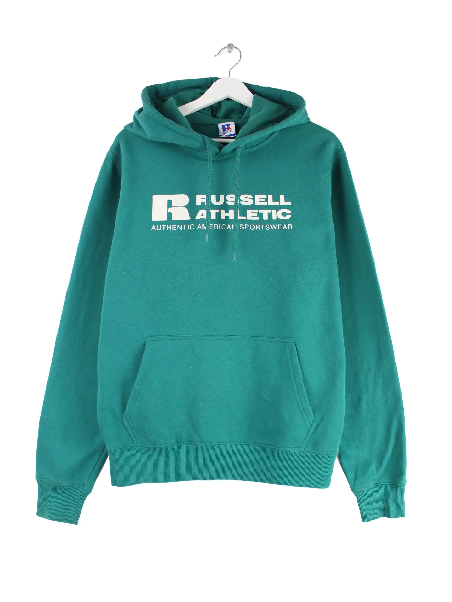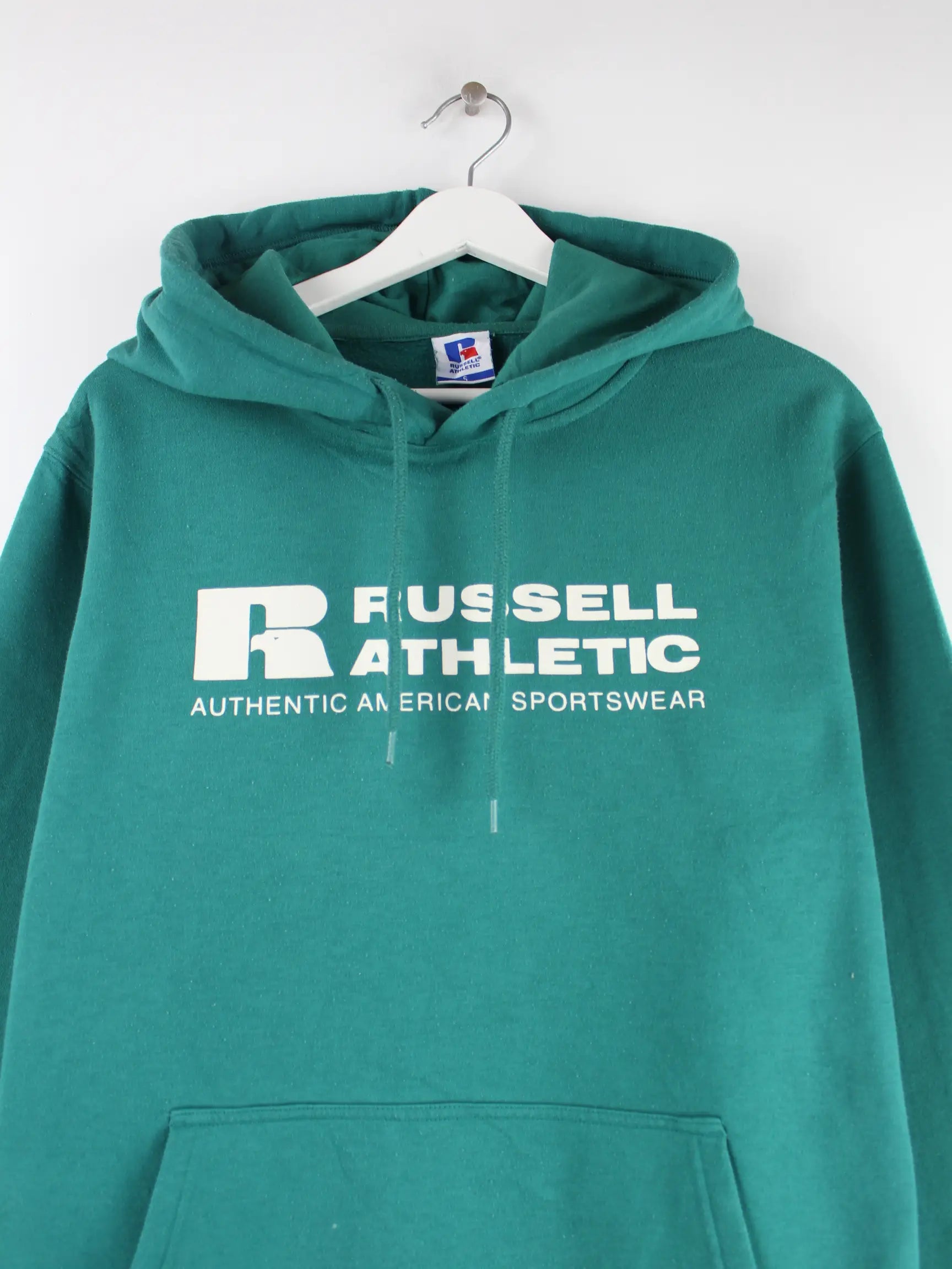 Hoodie von Russell Athletic in Größe S. Er ist aus einer Baumwollmischung hergestellt und in Grün bei uns vorrätig. Mit seltenem Print.