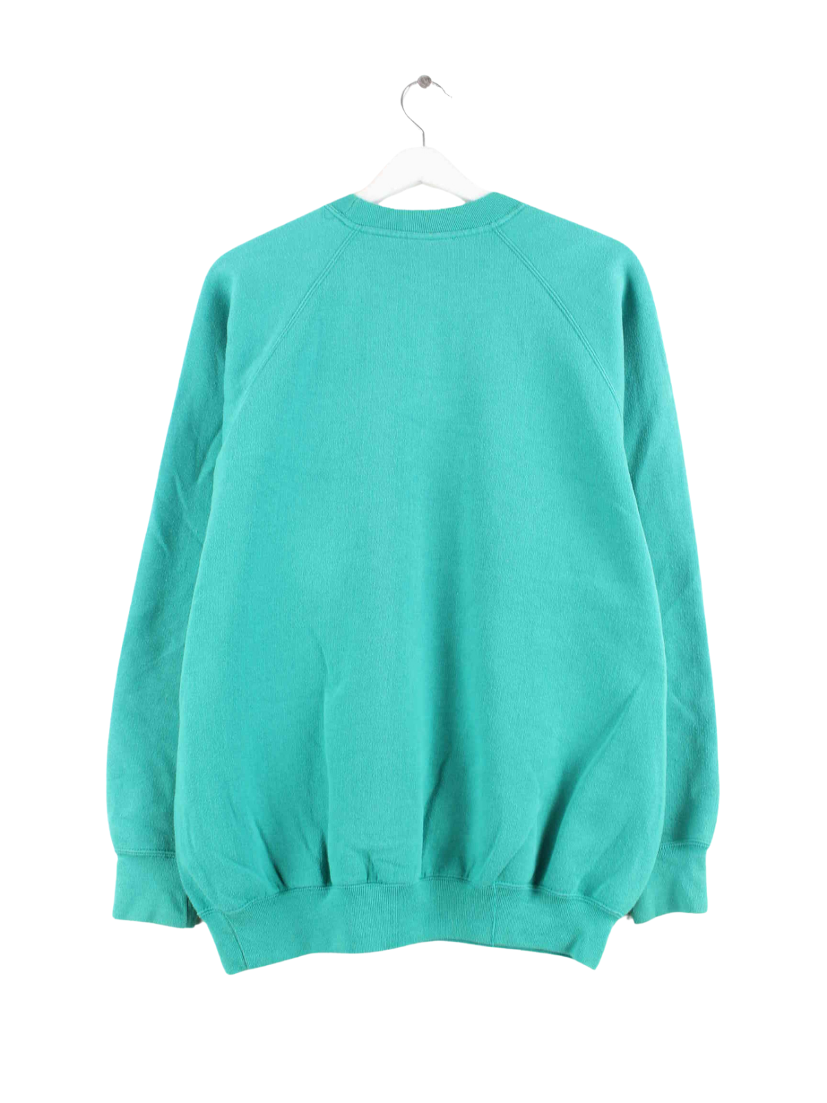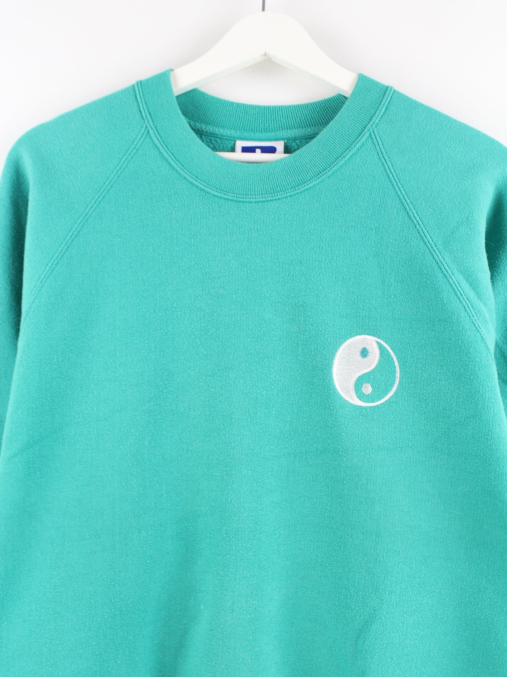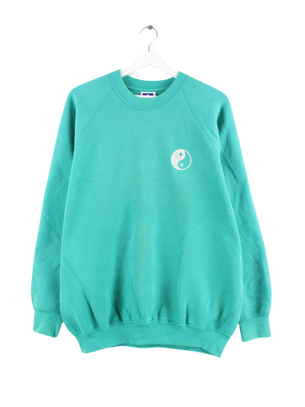 Exceptional sweater from the Russell Athletic brand with embroidery in size M from the early 2000s. It is made from a cotton blend and is available in green.