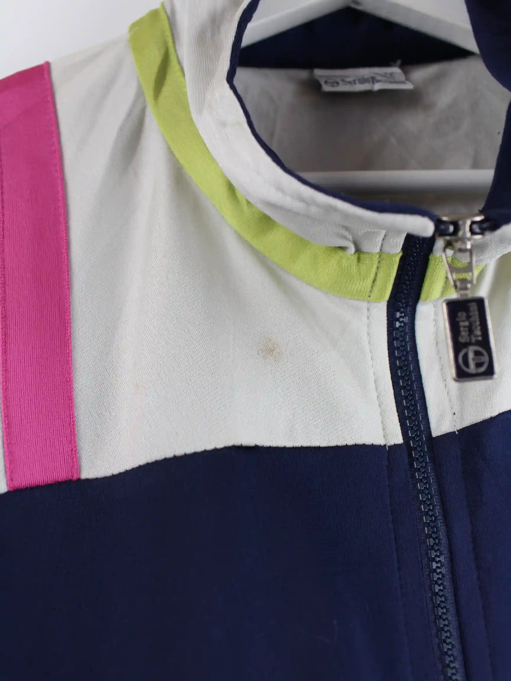 Blaue Leichte Jacke der Marke Sergio Tacchini aus den 90'ern in Größe XL. Sie ist aus Synthetik hergestellt. Den Zustand würden wir als 'In Ordnung' bezeichnen (vergl. Bilder).