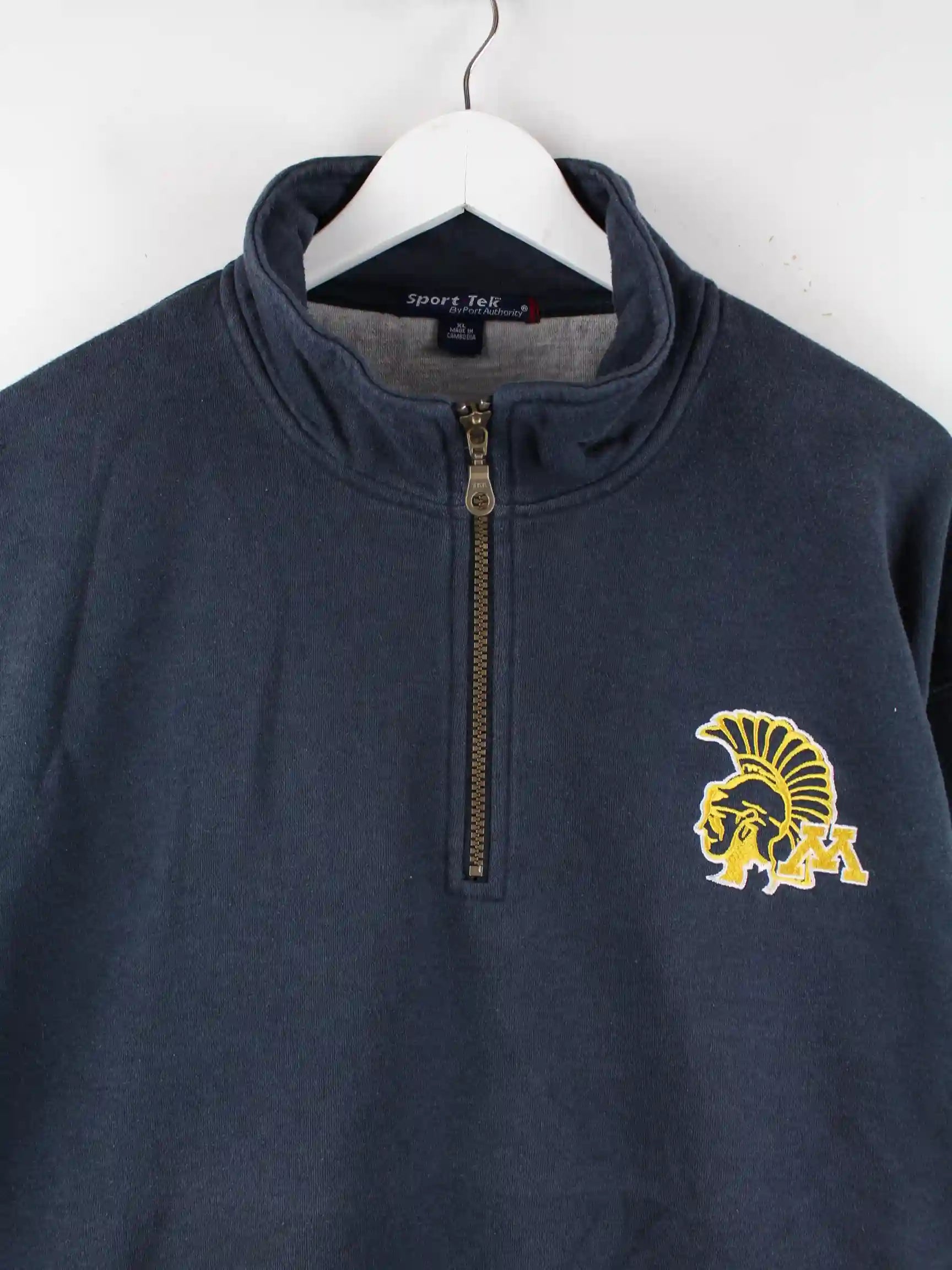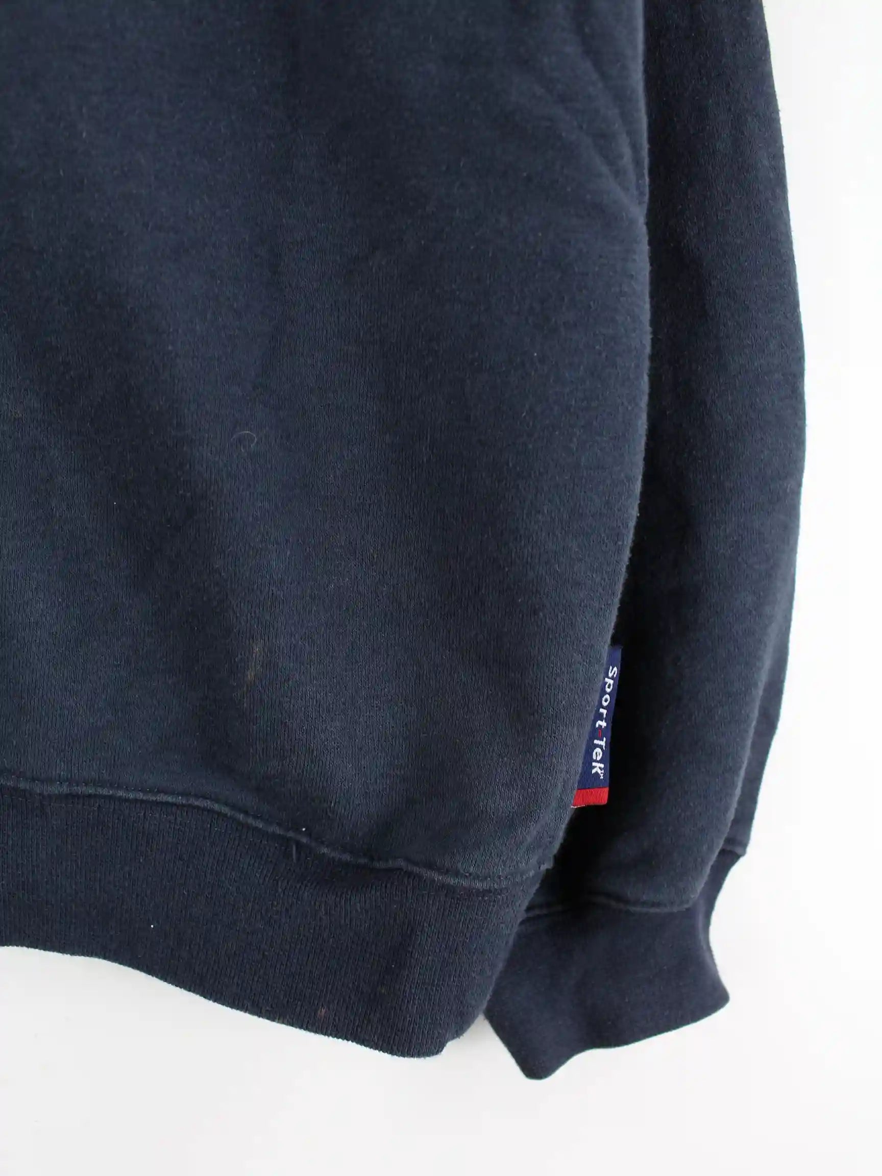 Blauer Sweater mit kurzem Reißverschluß vom Label Sport Tek in Größe XL. Er ist aus einer Baumwollmischung angefertigt und in gutem Zustand bei uns vorrätig.