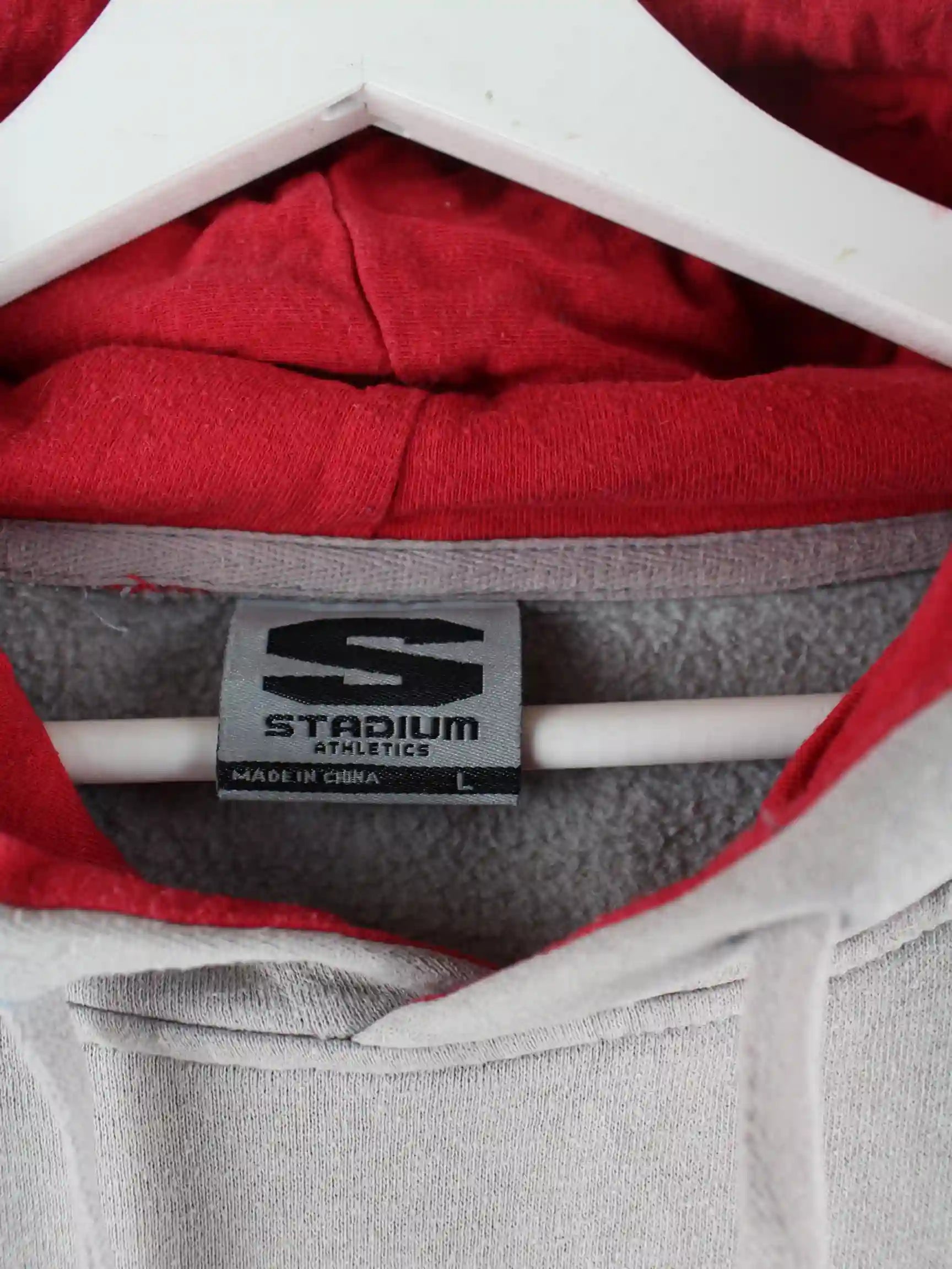 Grauer Hoodie mit gestickten Motiven des Labels Stadium in Größe L. Er ist aus einer Baumwollmischung gemacht und in sehr gutem Zustand in Stock.