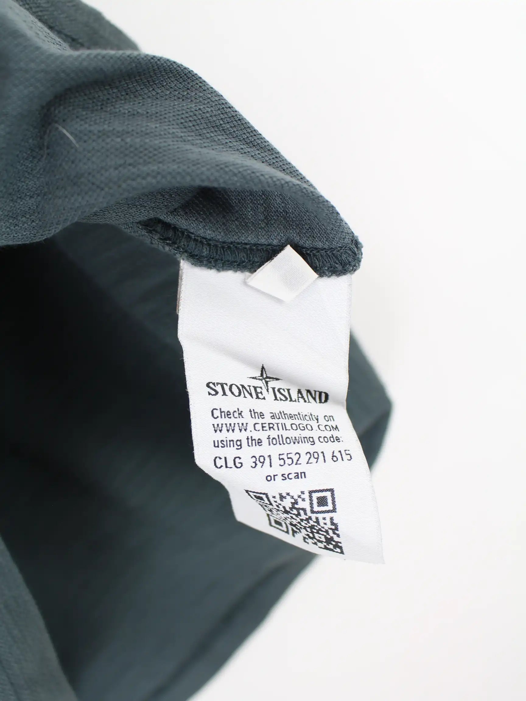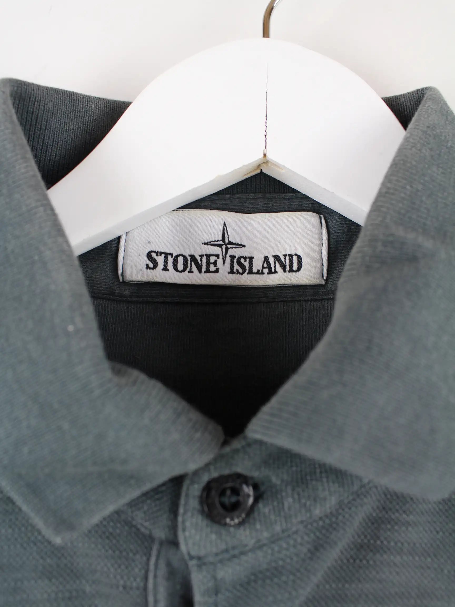 Graues Poloshirt aus dem Hause Stone Island in Größe L. Es ist aus Baumwolle angefertigt und in sehr gutem Zustand bei uns zu bekommen.