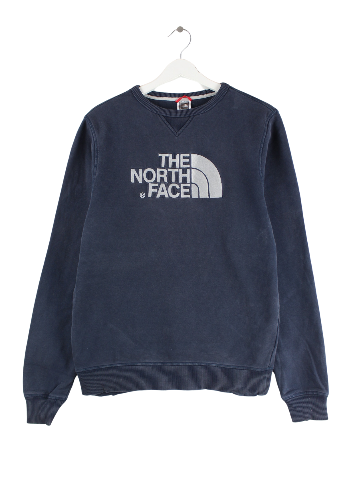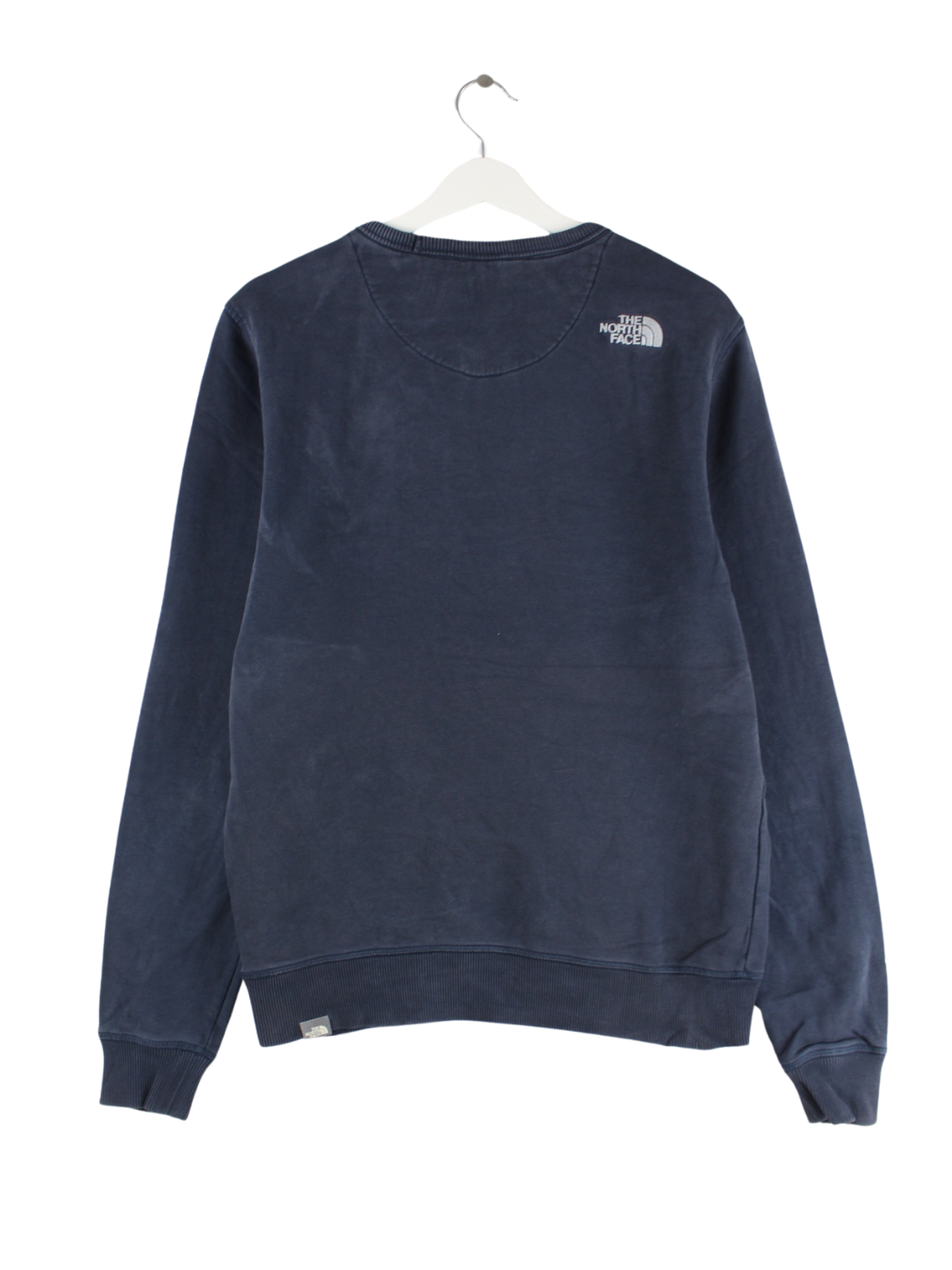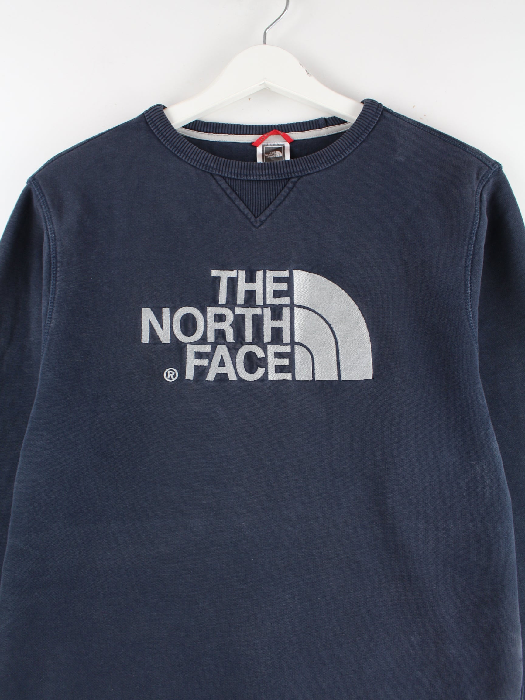 Blauer Sweater mit gestickten Motiven des Labels The North Face in Größe S. Er ist aus einer Baumwollmischung gefertigt und in gutem Zustand auf Lager.