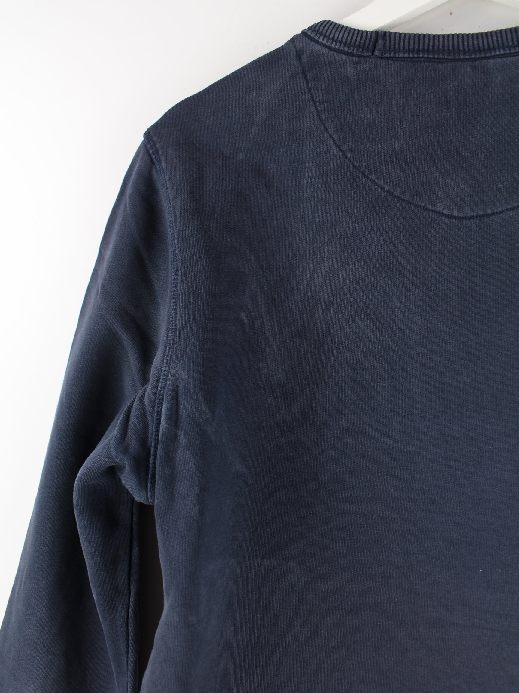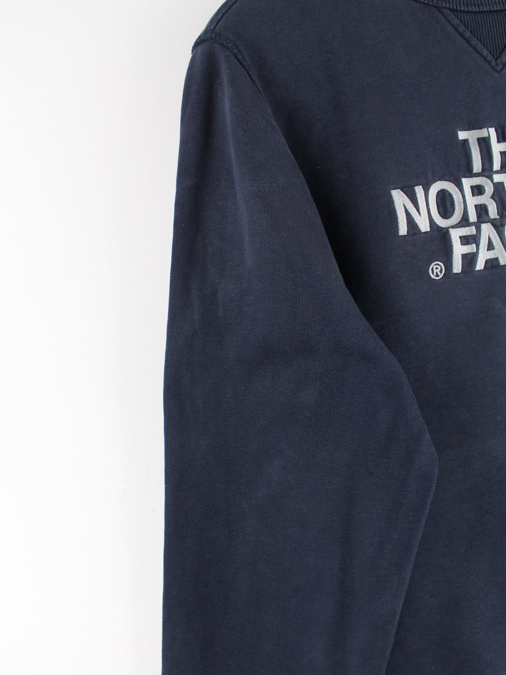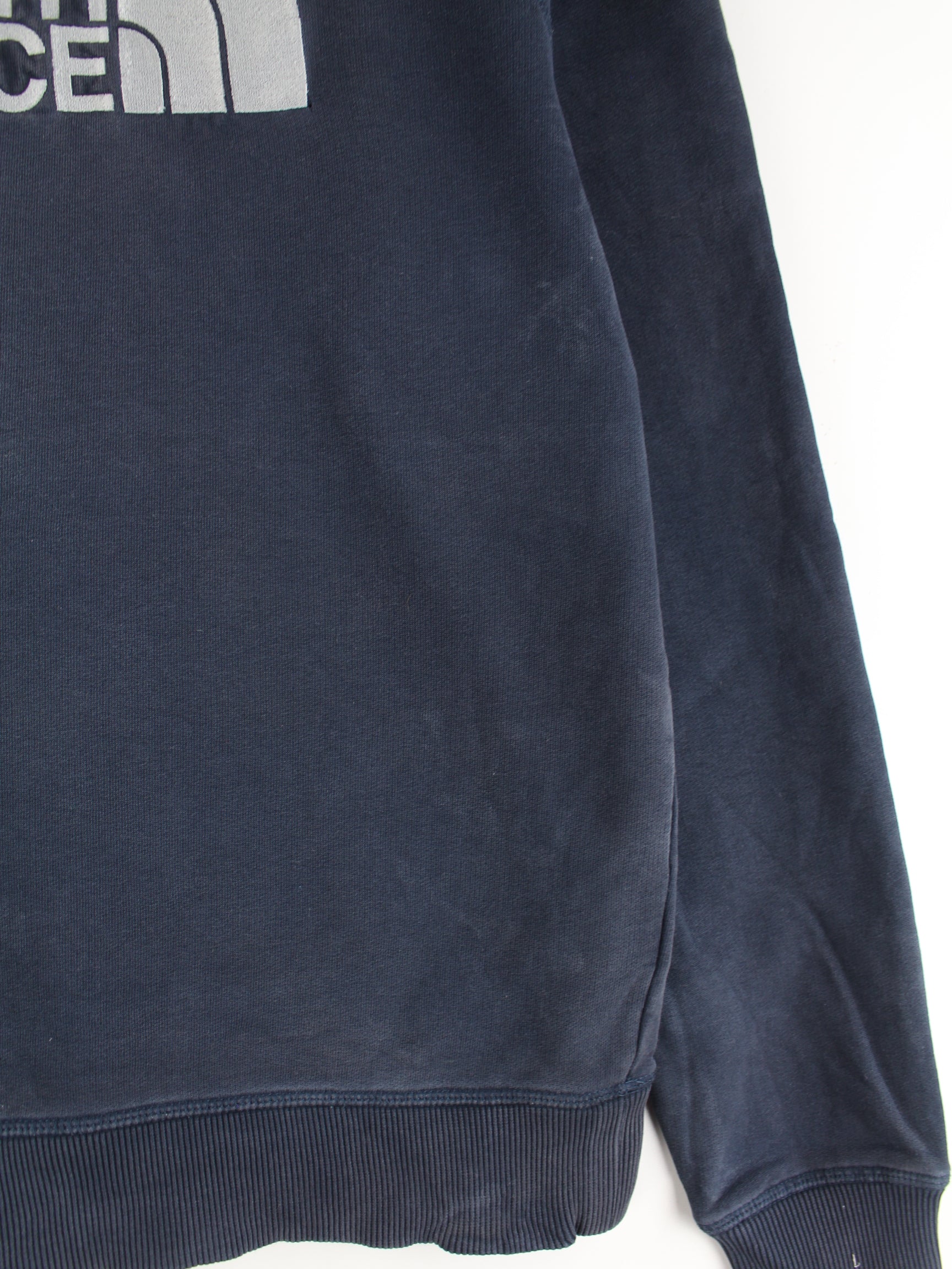 Blauer Sweater mit gestickten Motiven des Labels The North Face in Größe S. Er ist aus einer Baumwollmischung gefertigt und in gutem Zustand auf Lager.