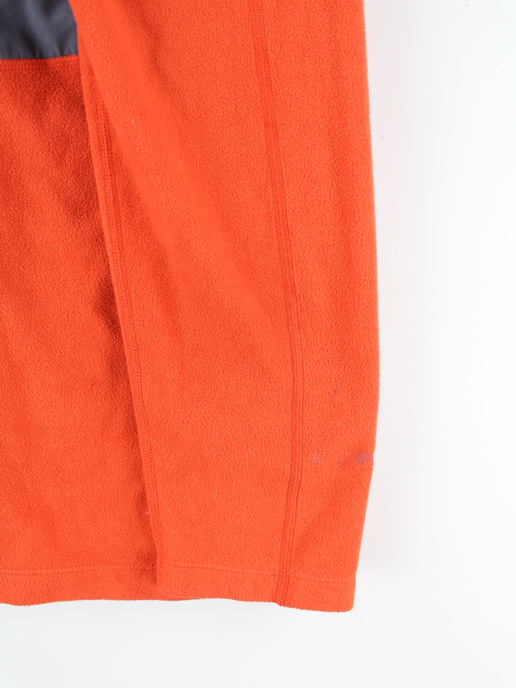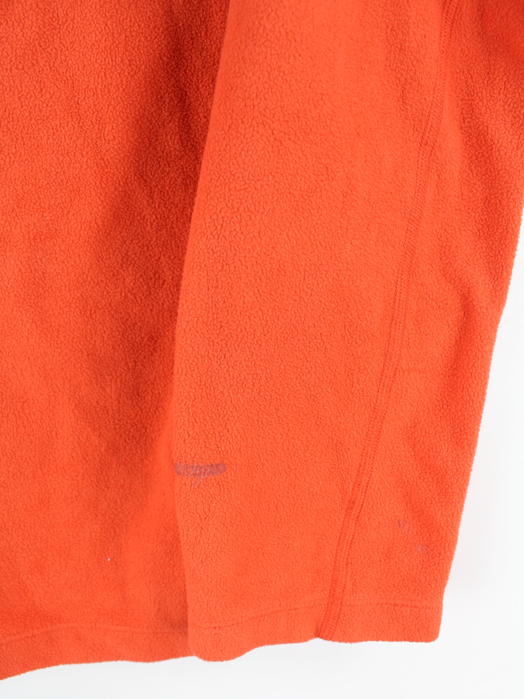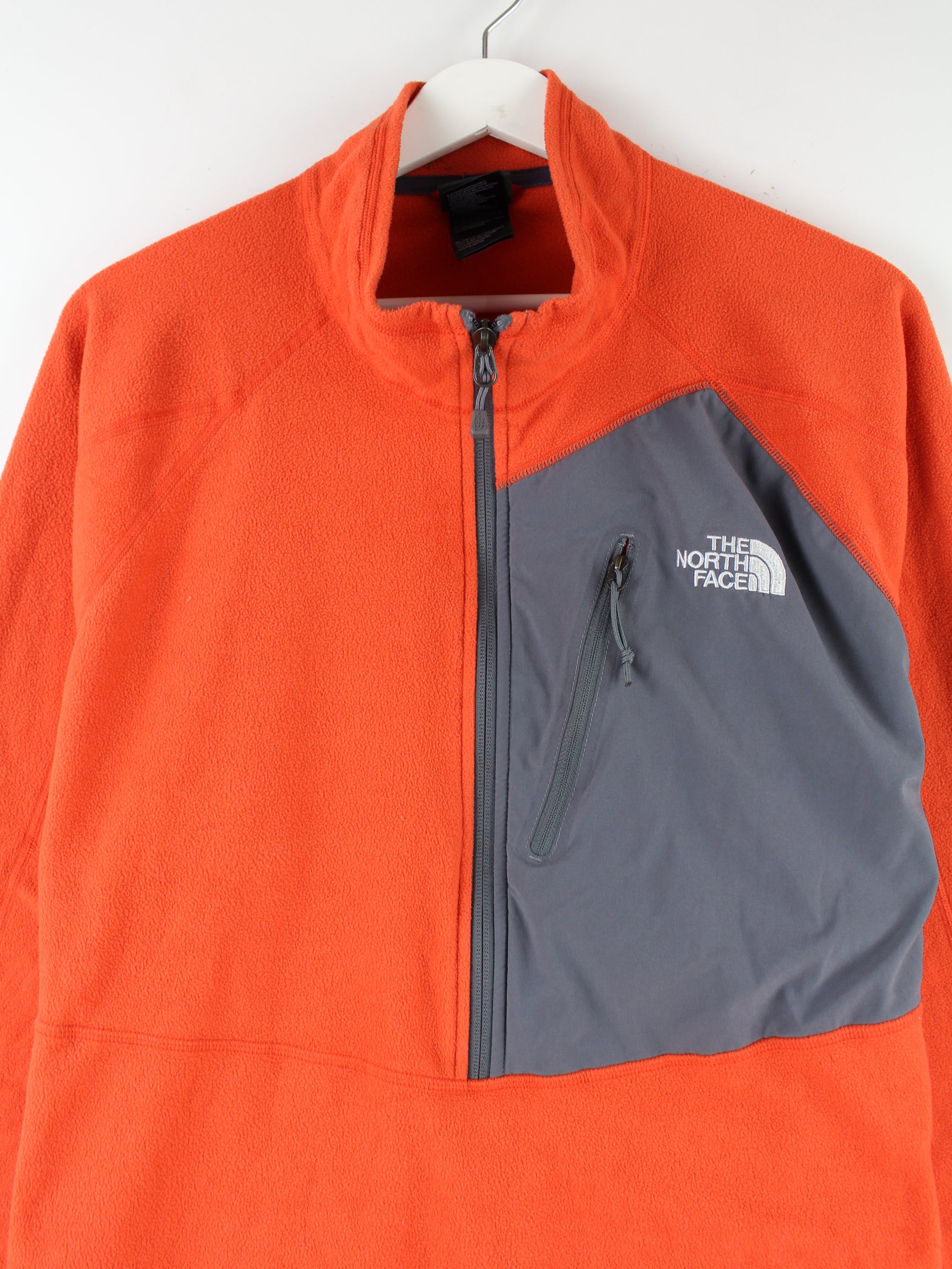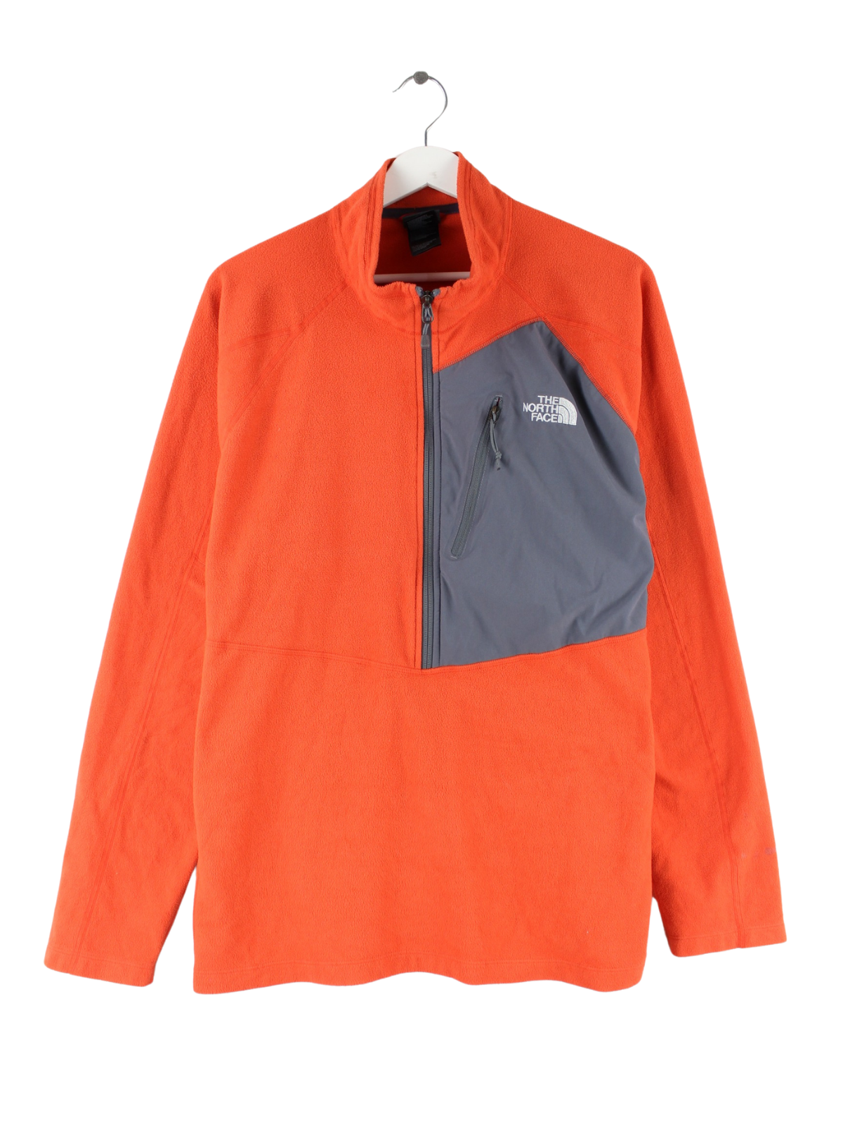 Sweater des Labels The North Face mit halbem Reißverschluß in Größe XXL. Er ist aus gemütlichem Fleece produziert und in Orange vorrätig.