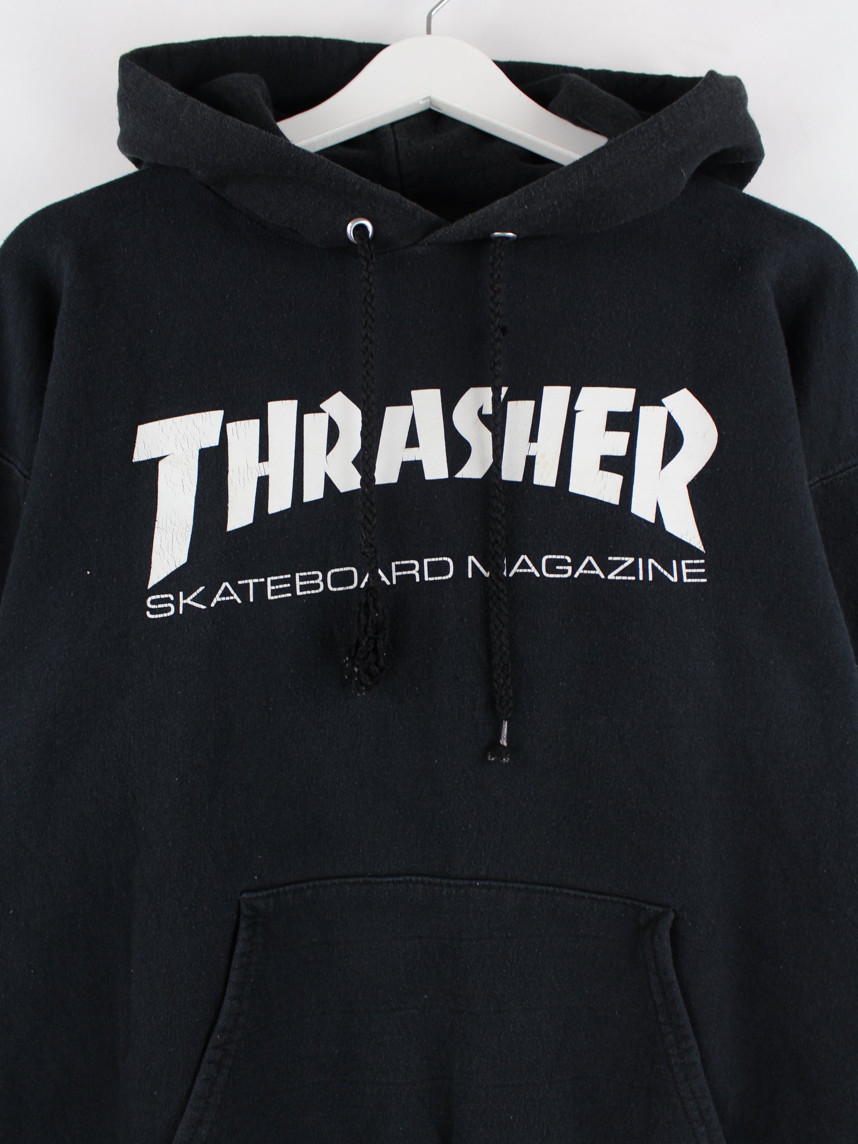 Schwarzer Hoodie vom Label Thrasher in Größe XS. Er ist aus einer Baumwollmischung und in gutem Zustand zu bekommen. Mit chiquem Print.