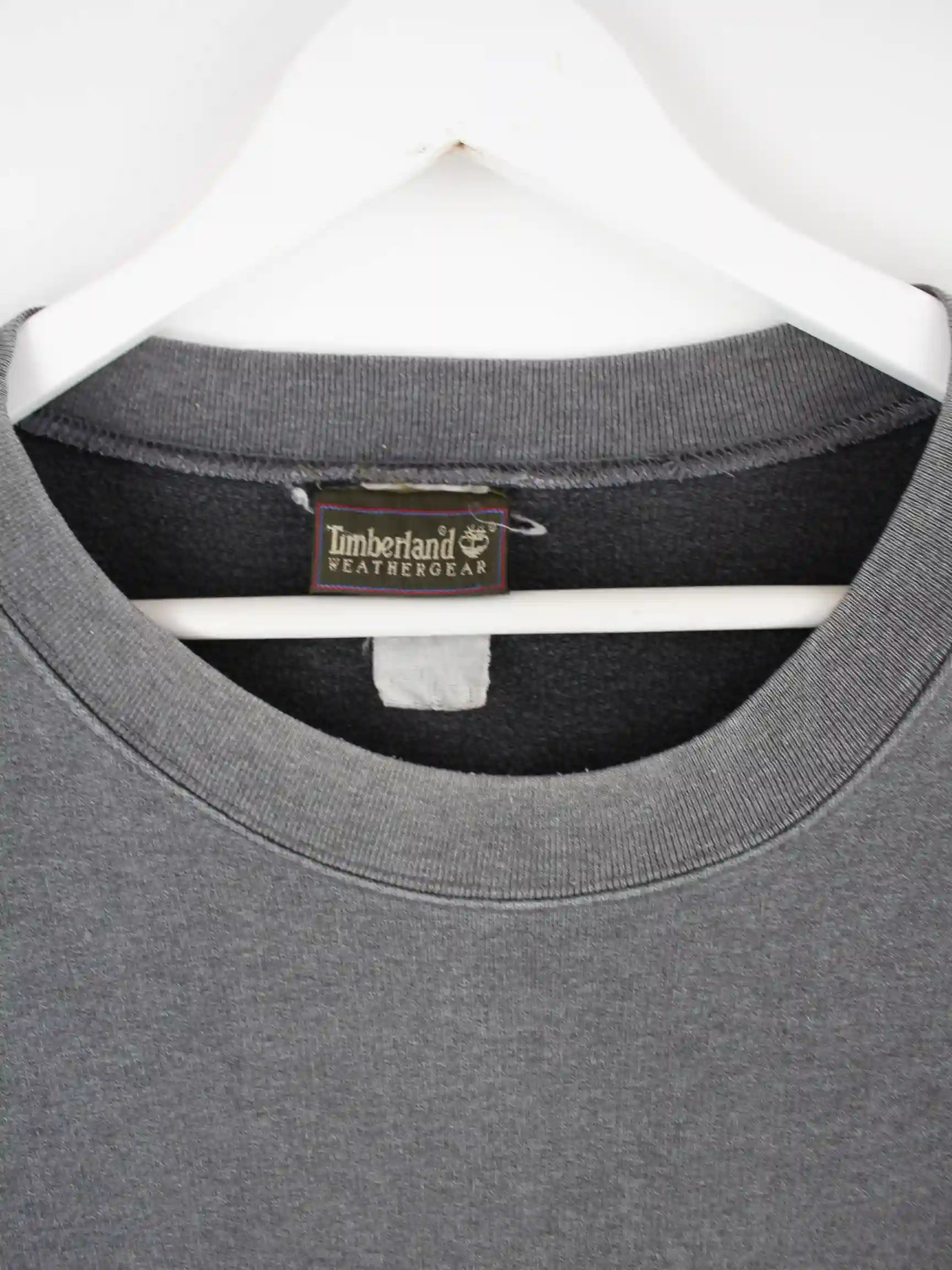 Sweater aus dem Hause Timberland in Größe XL aus den 90'ern. Er ist aus einer Baumwollmischung gemacht und in Grau bei uns vorrätig.