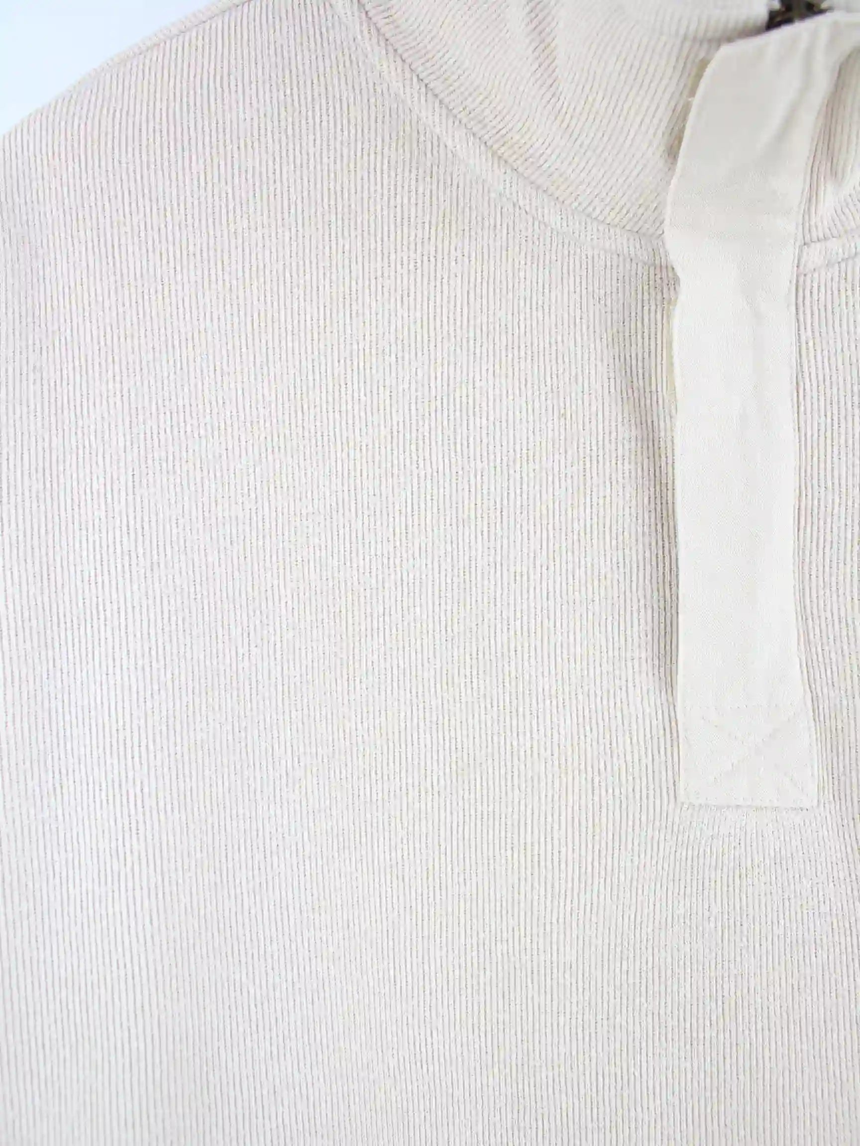 Sweater von Timberland mit halbem Reißverschluß in Größe XXL. Er ist aus einer Baumwollmischung hergestellt und in Beige bei uns vorrätig.