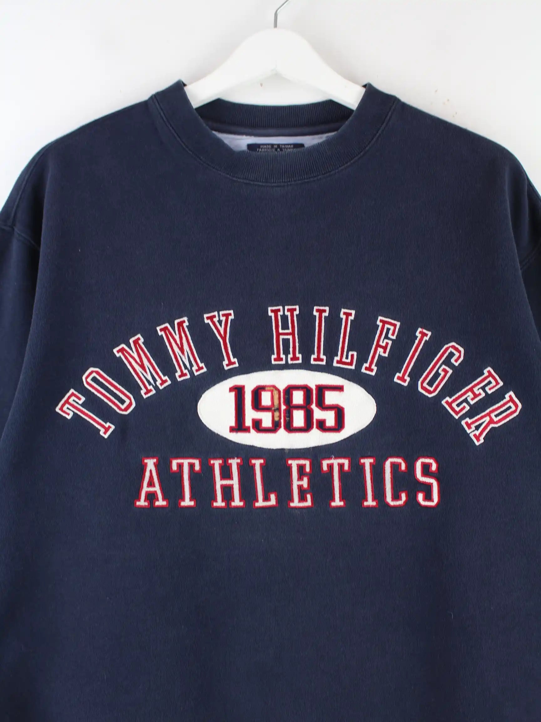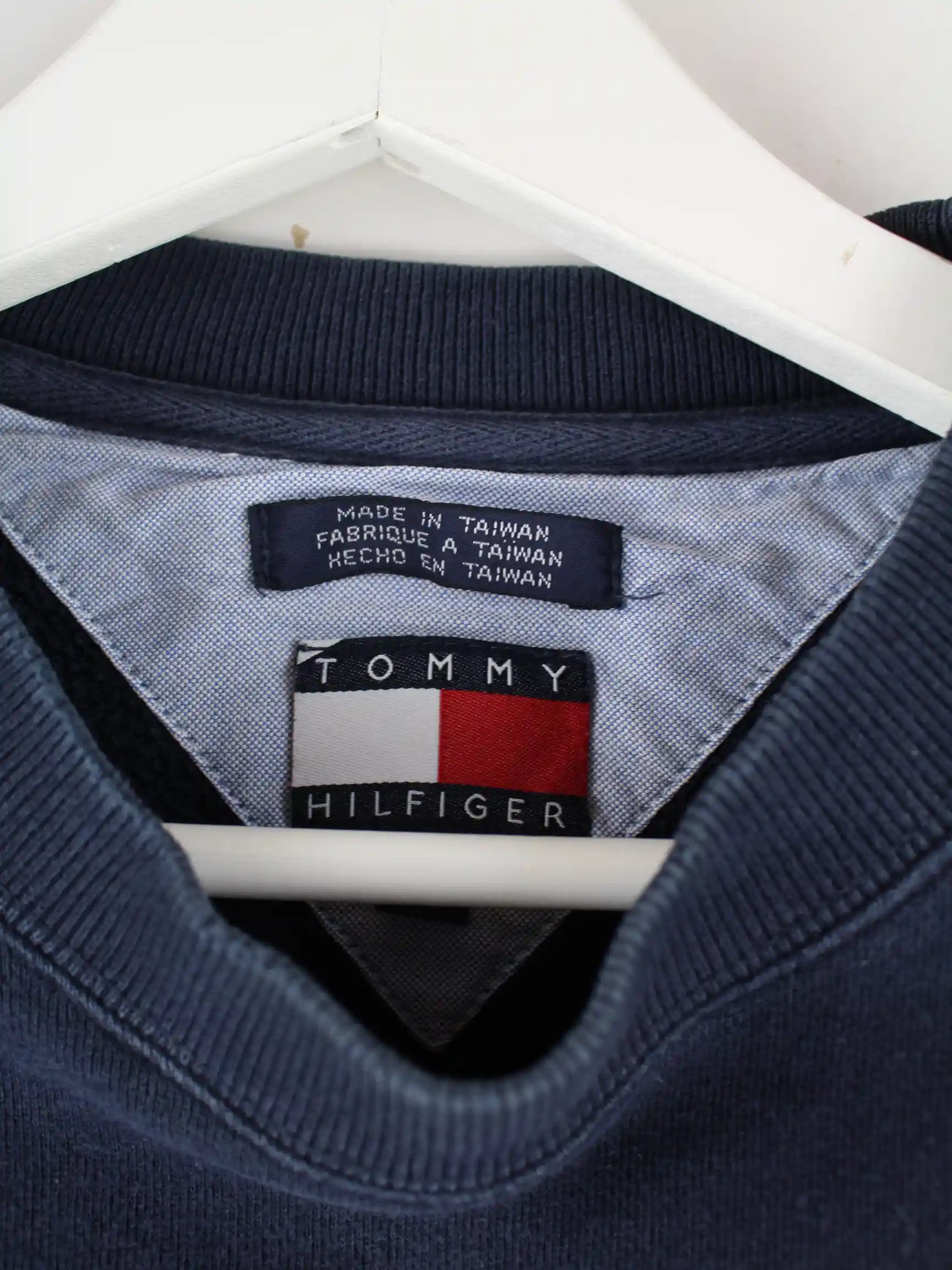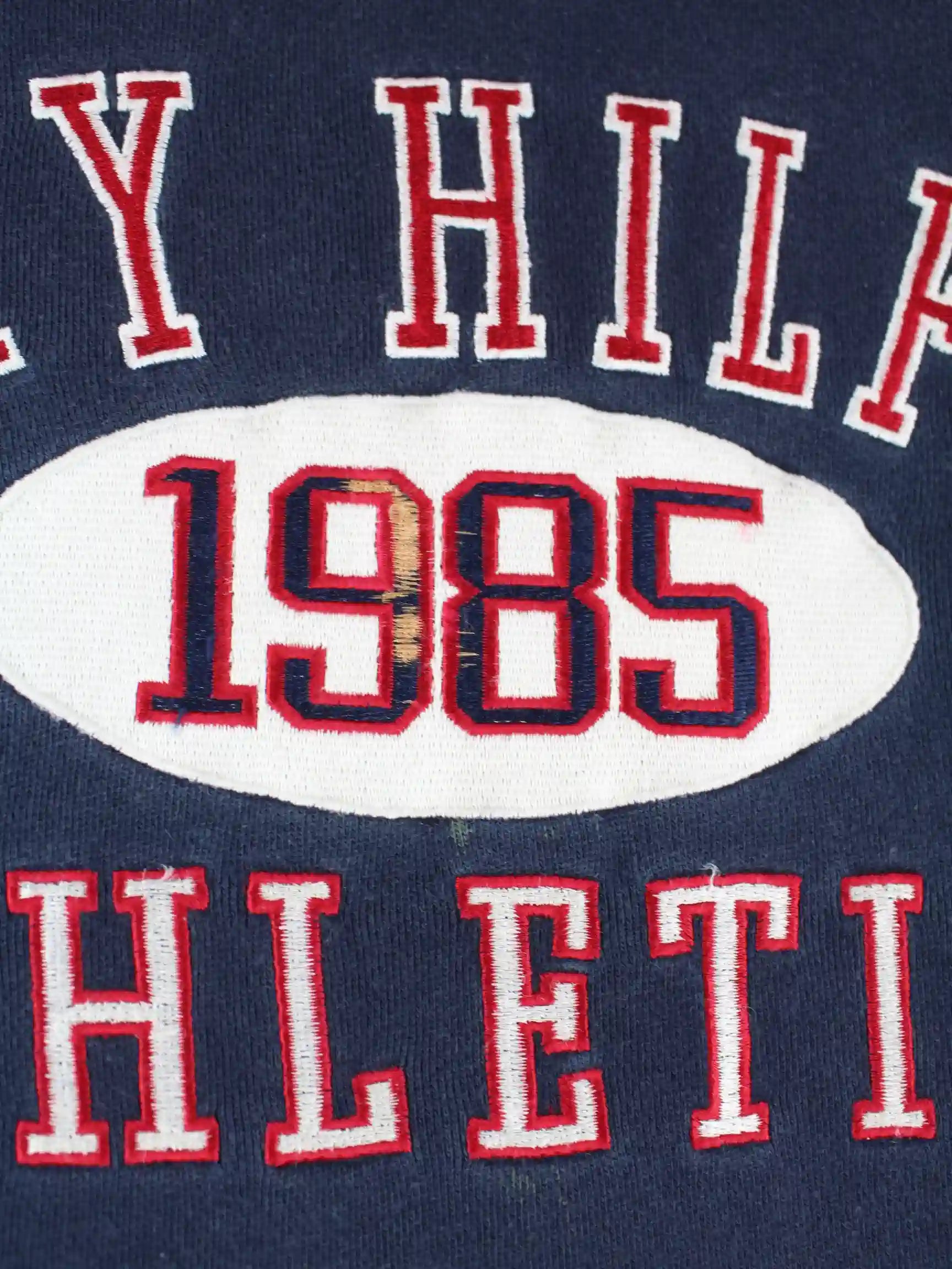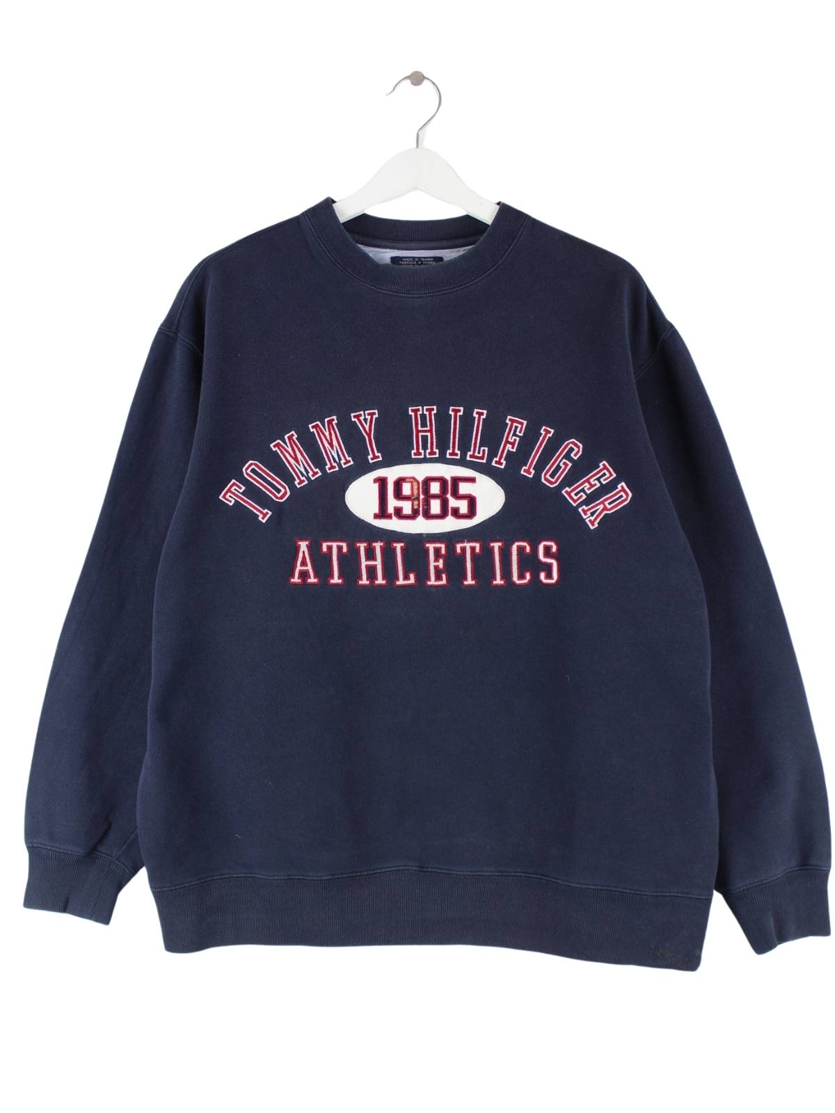 Blauer Sweater mit gesticktem Logo des Labels Tommy Hilfiger aus den 90'ern in Größe S. Er ist aus Baumwolle gemacht und in gutem Zustand im Bestand.