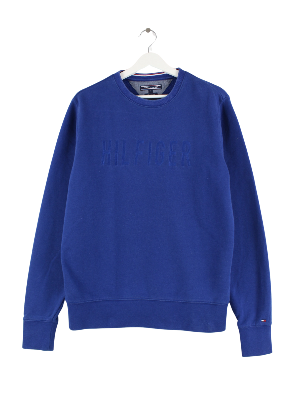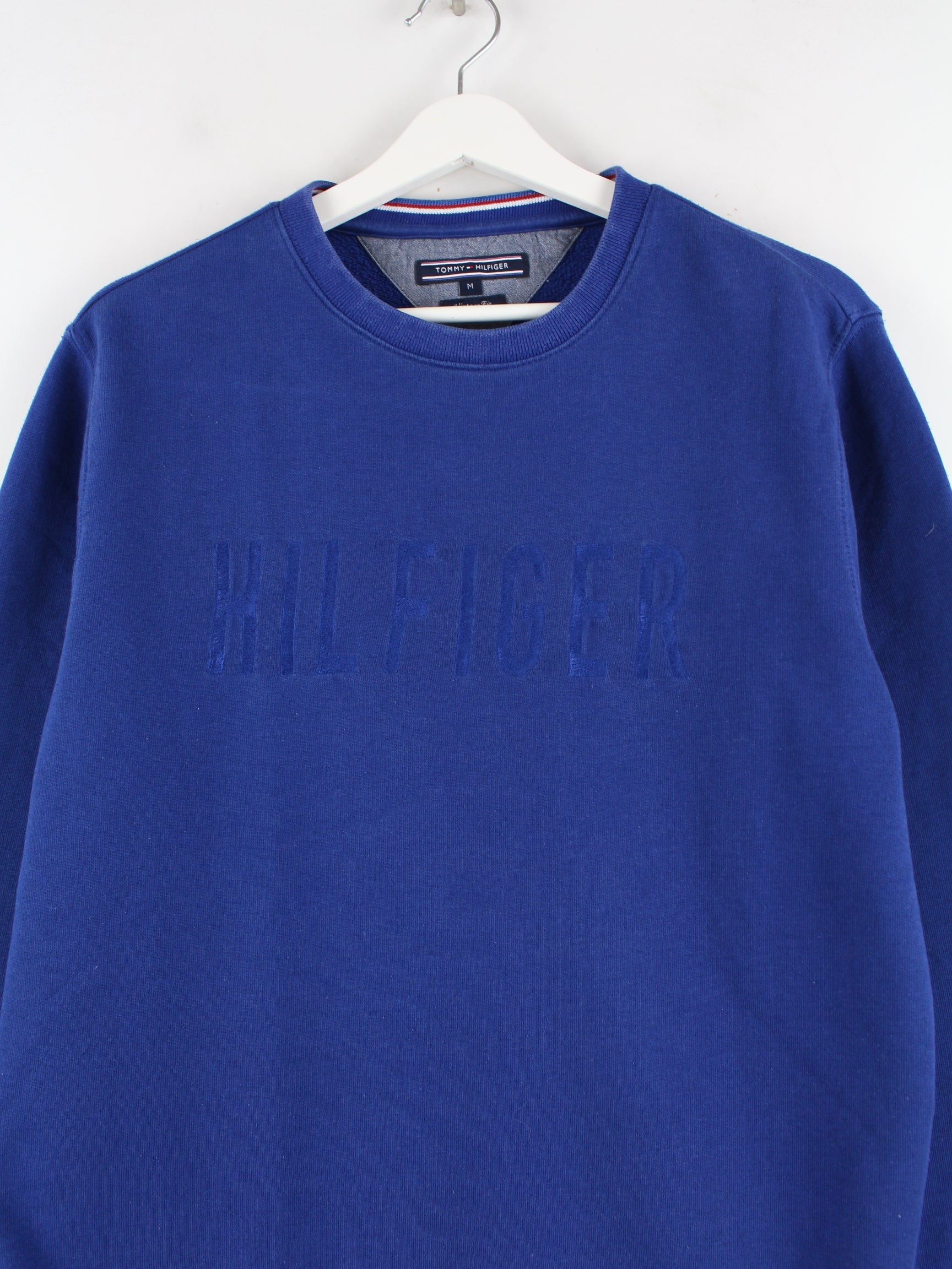 Sweater vom Label Tommy Hilfiger in Größe M. Er ist aus einer Baumwollmischung hergestellt und in Blau in Stock.